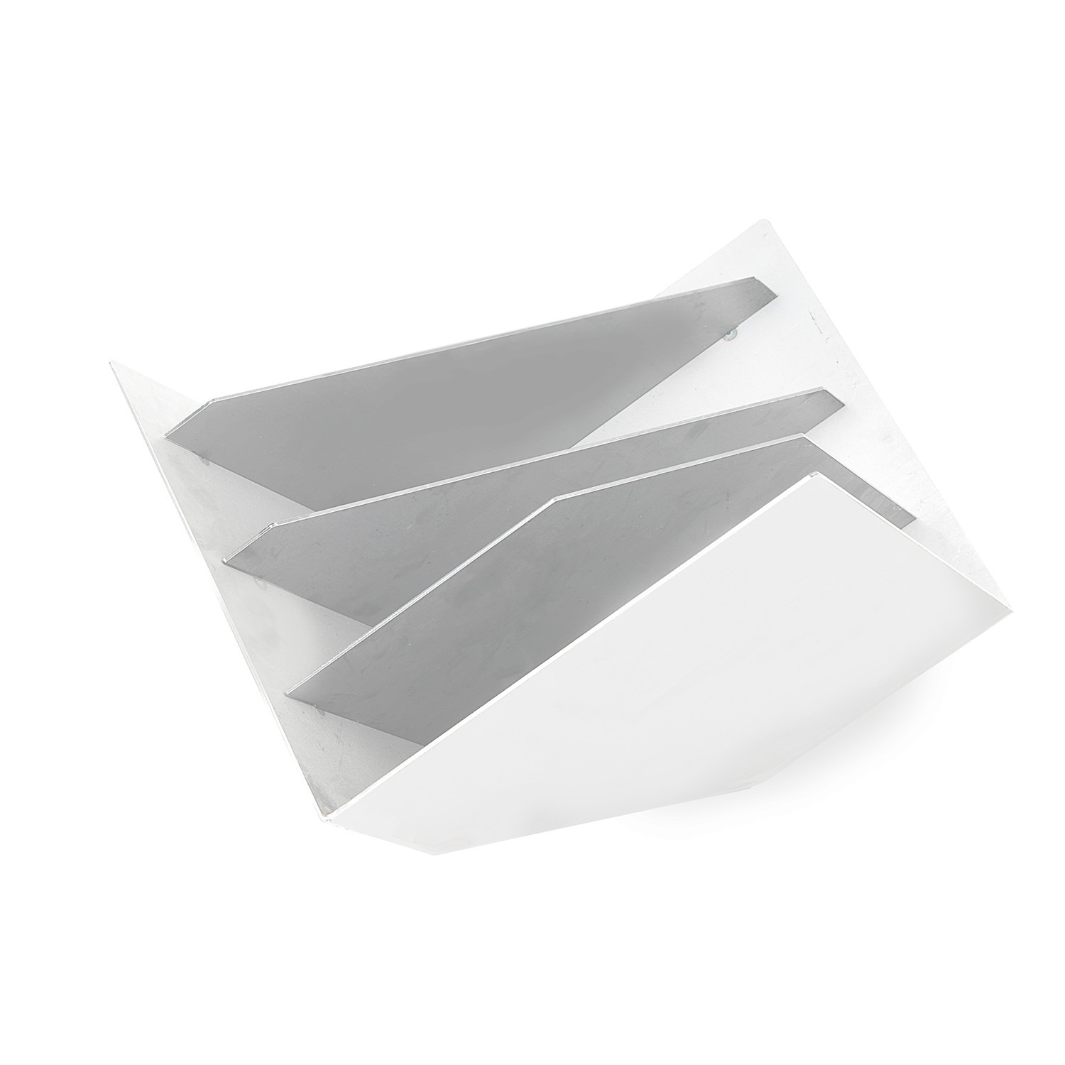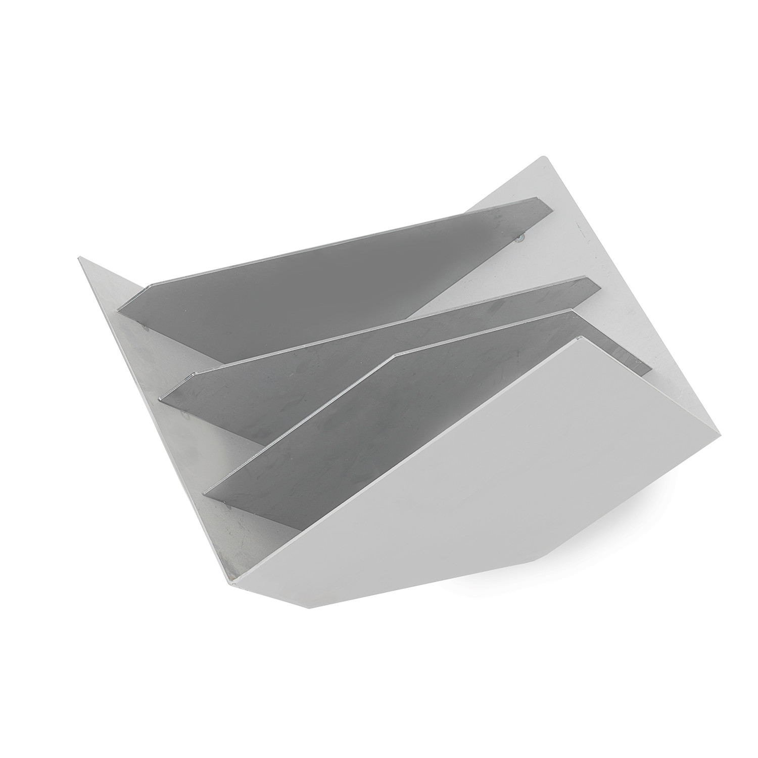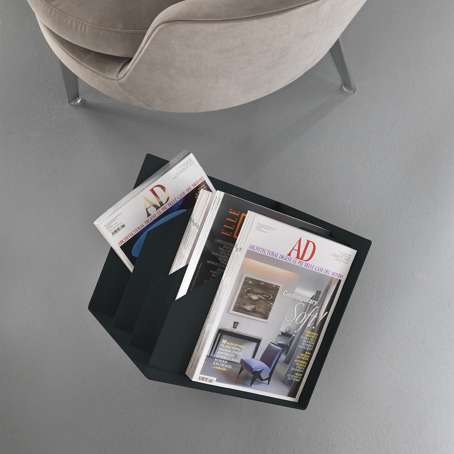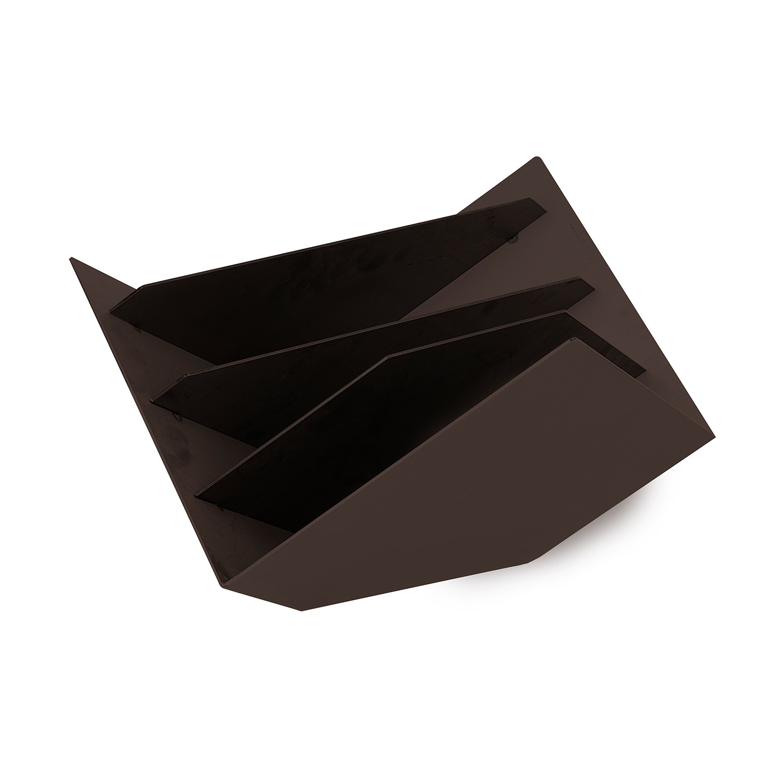 Motio is a steel, designer magazine rack by Siderio, boasting four magazine compartments, placed in a cube-like shape, and tilted sideways thanks to a cut-off corner, looking like it's unstable and on precarious balance - while being perfectly still and steady in place.