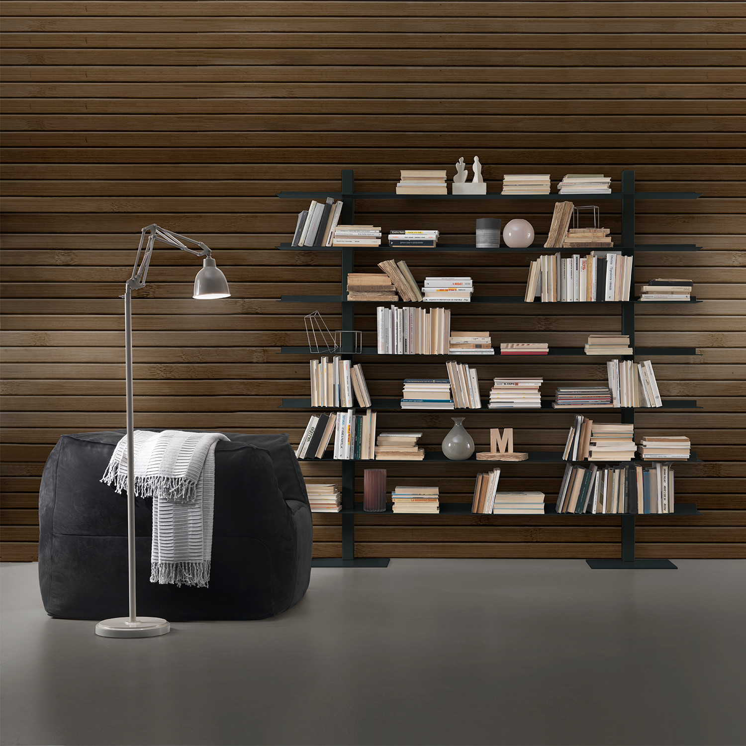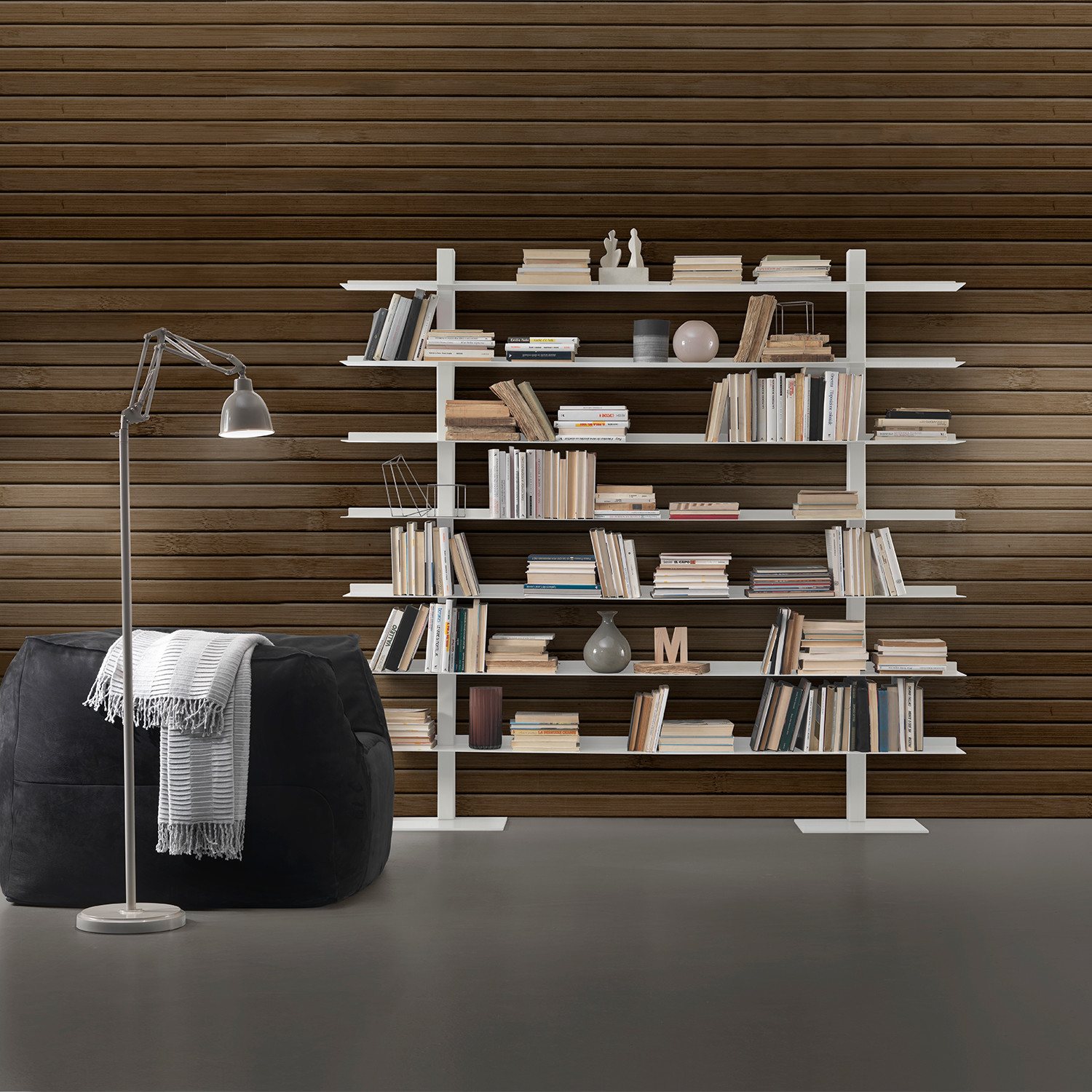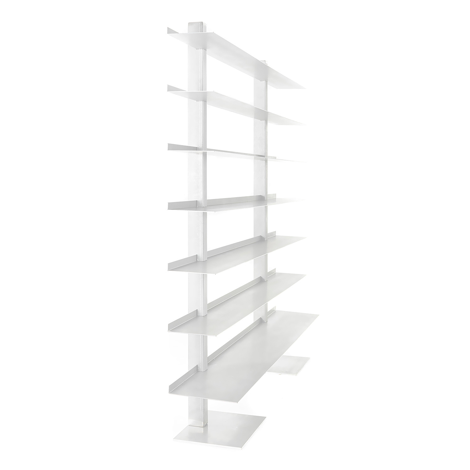 Zefiro II can be placed on the floor or hung to the wall. It's a modular composition that includes two upright supports and horizontally placed shelves. Designed and manufactured in Italy by Siderio, it's made of steel sheet, ready to decorate your sitting room or living areas with a sophisticated look.