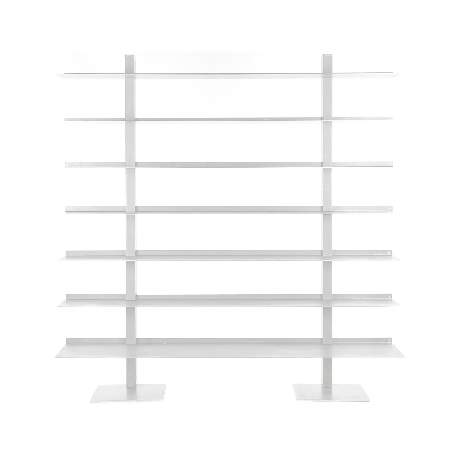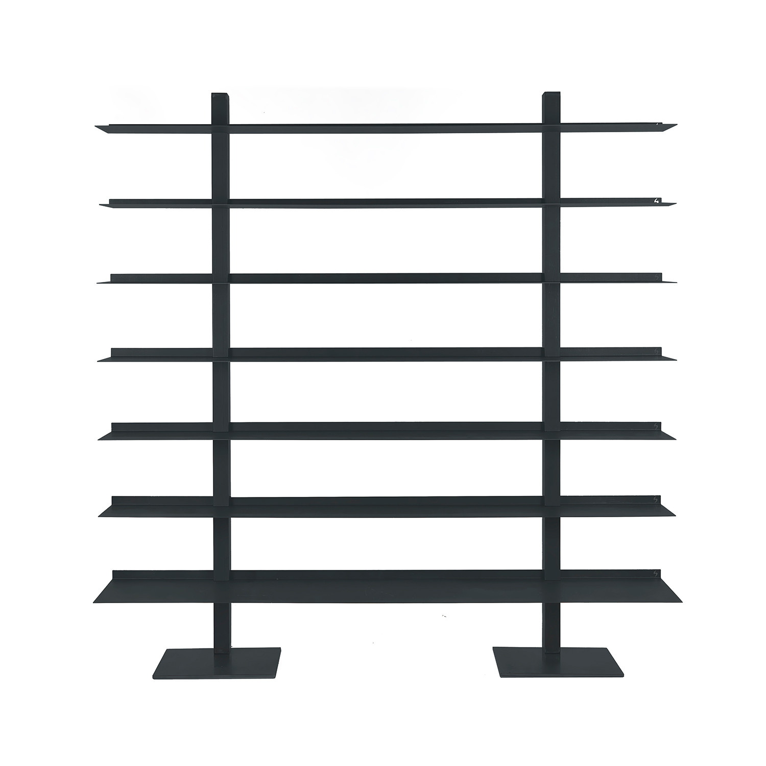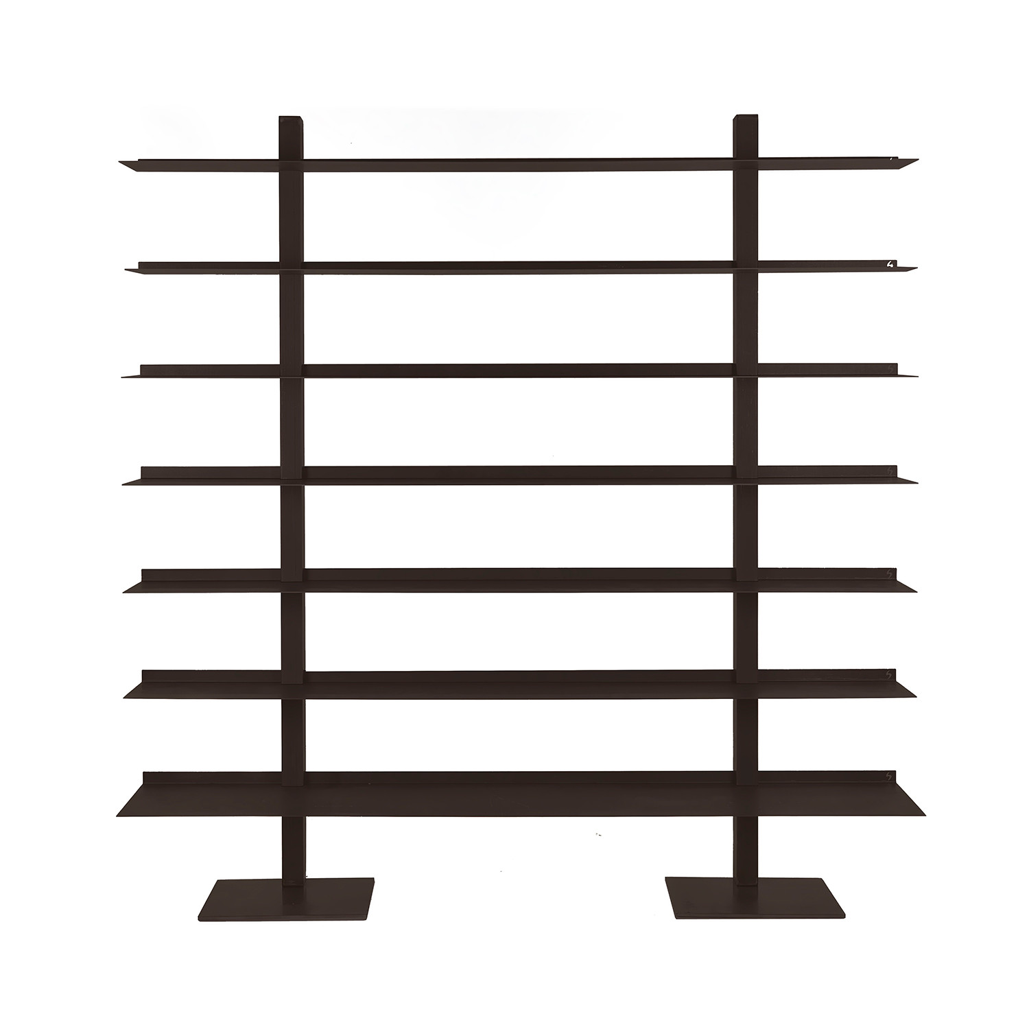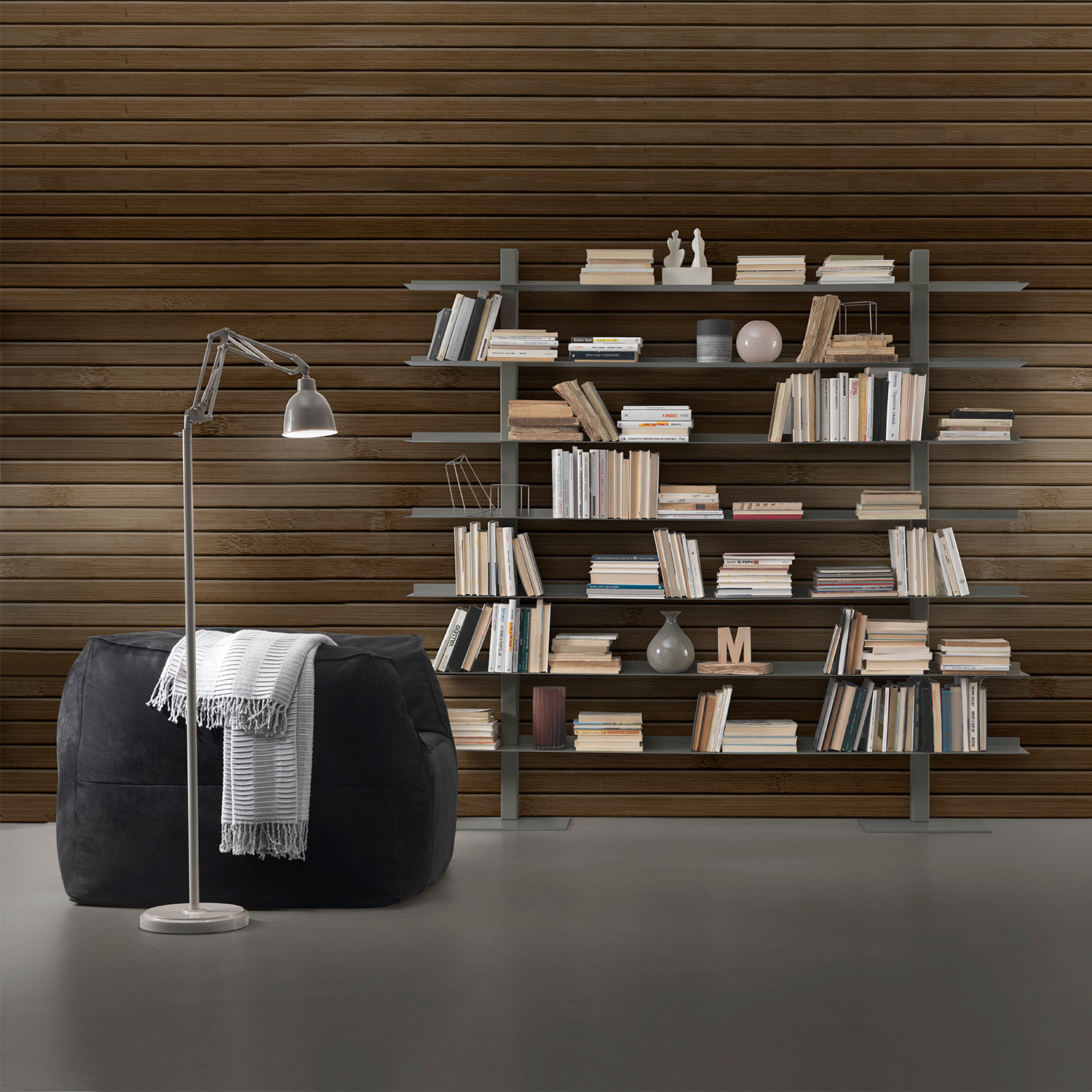 Zefiro II can be placed on the floor or hung to the wall. It's a modular composition that includes two upright supports and horizontally placed shelves. Designed and manufactured in Italy by Siderio, it's made of steel sheet, ready to decorate your sitting room or living areas with a sophisticated look.