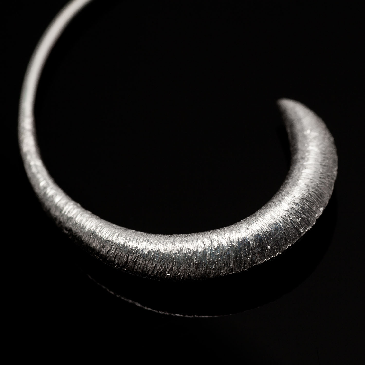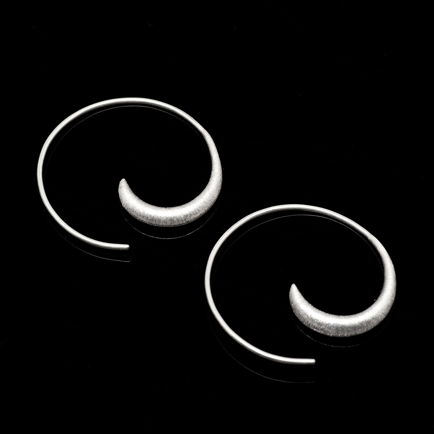 These swirly earrings are a new take on hoops. Inspired by modern Indian design, these timeless brushed pieces are part of Sikara's Mantra Collection. This extra small version comes in a beautifully hand brushed finish, and are approximately 28mm in diameter.