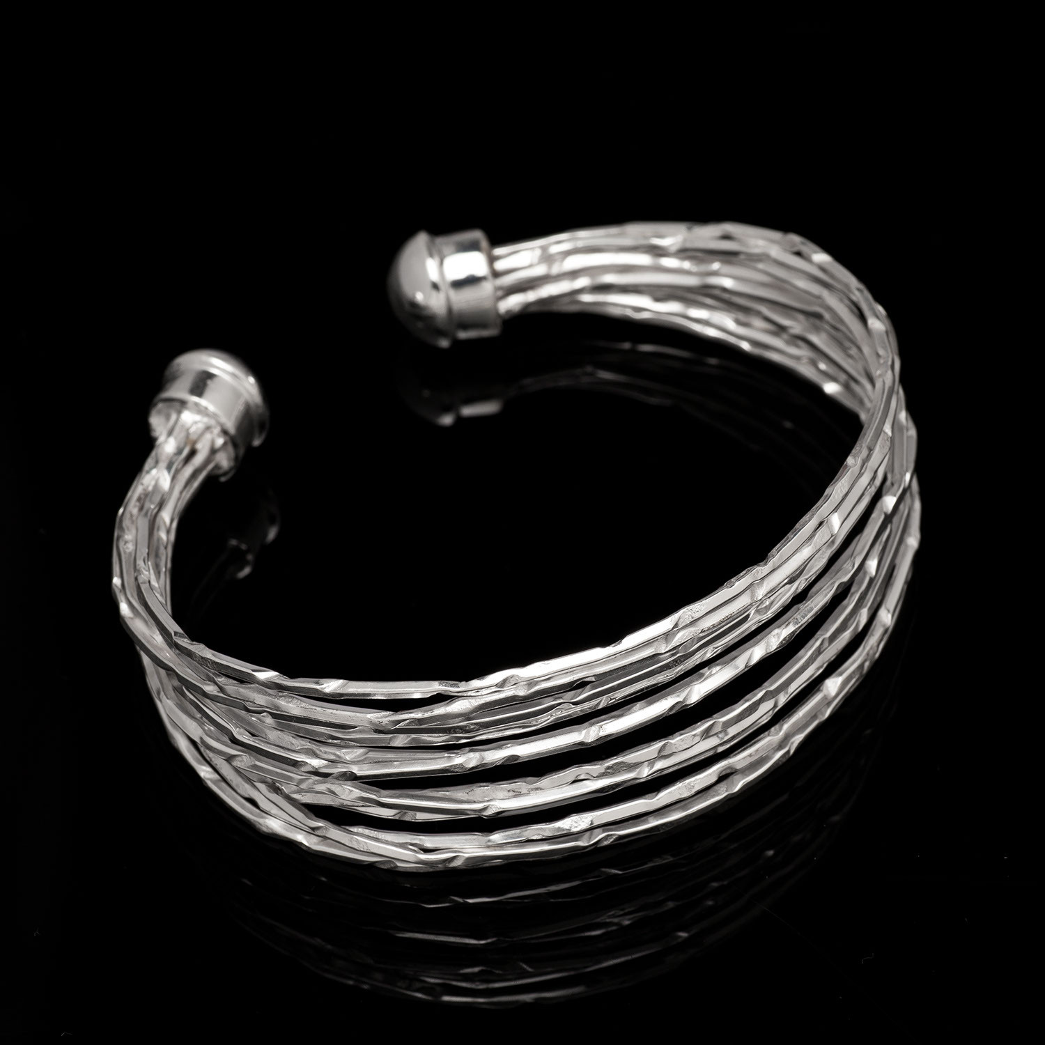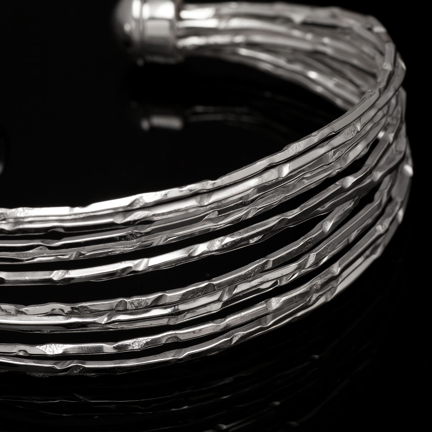 This silver bracelet has an organic feel and is inspired by Mexico's beautiful gardens. The hammered finish creates a combination matte and polished look. The bracelet measures 2.75" wide and is adjustable by gently bending it to fit your wrist perfectly.