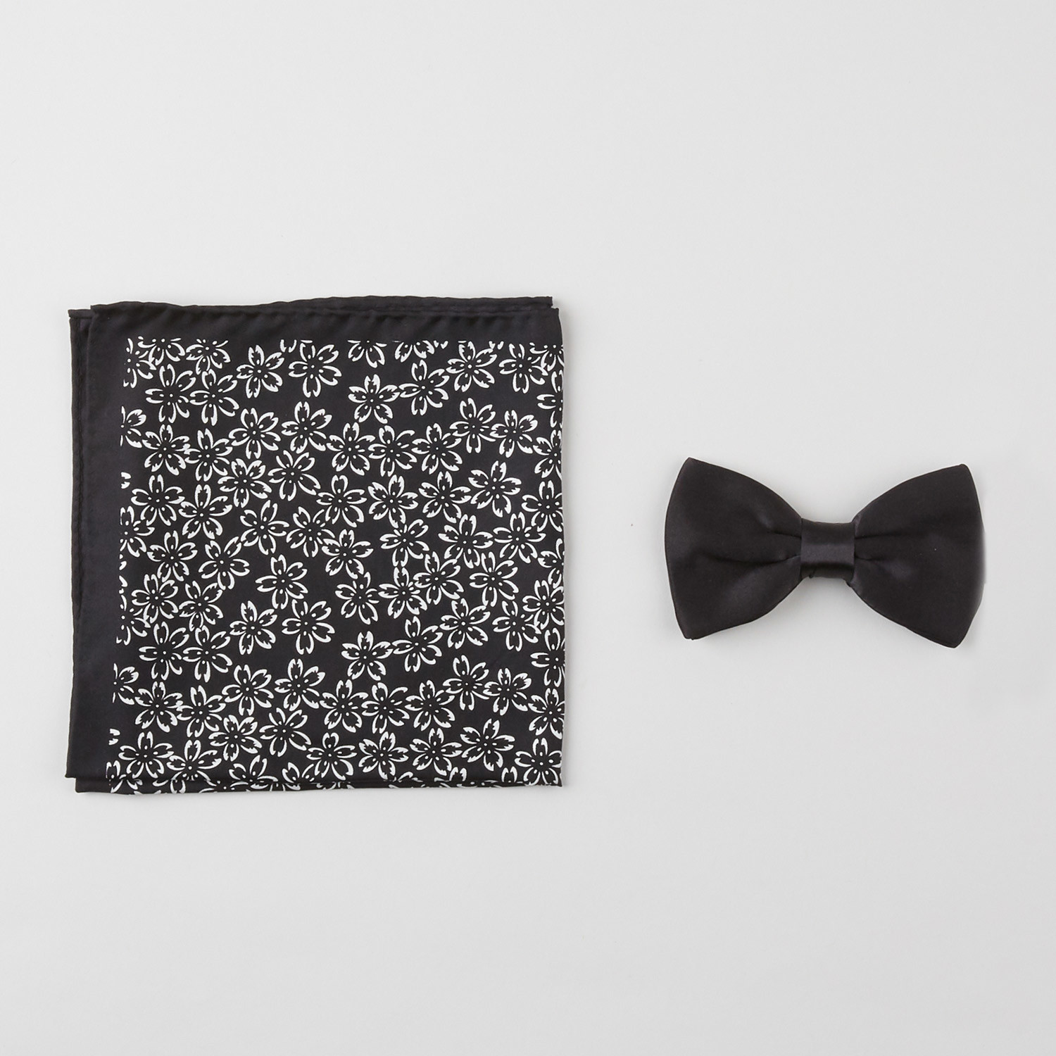 Floral Silk Boxed Bow Tie + Pocket Square Set // Black + White