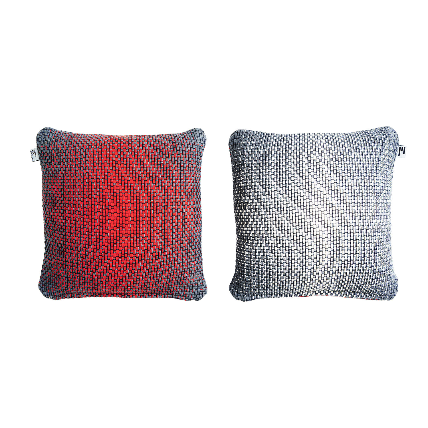 The Two Side Gradient Cushion has two very differently-colored sides. One side is red-grey, and the other is a more modest white-grey. Each side features a pattern where the two colors are mixed in a gradient. Overall, there are nine color blends in both the weave and warp direction which creates a staggering 81 different shades of color on each side of this colorful cushion.