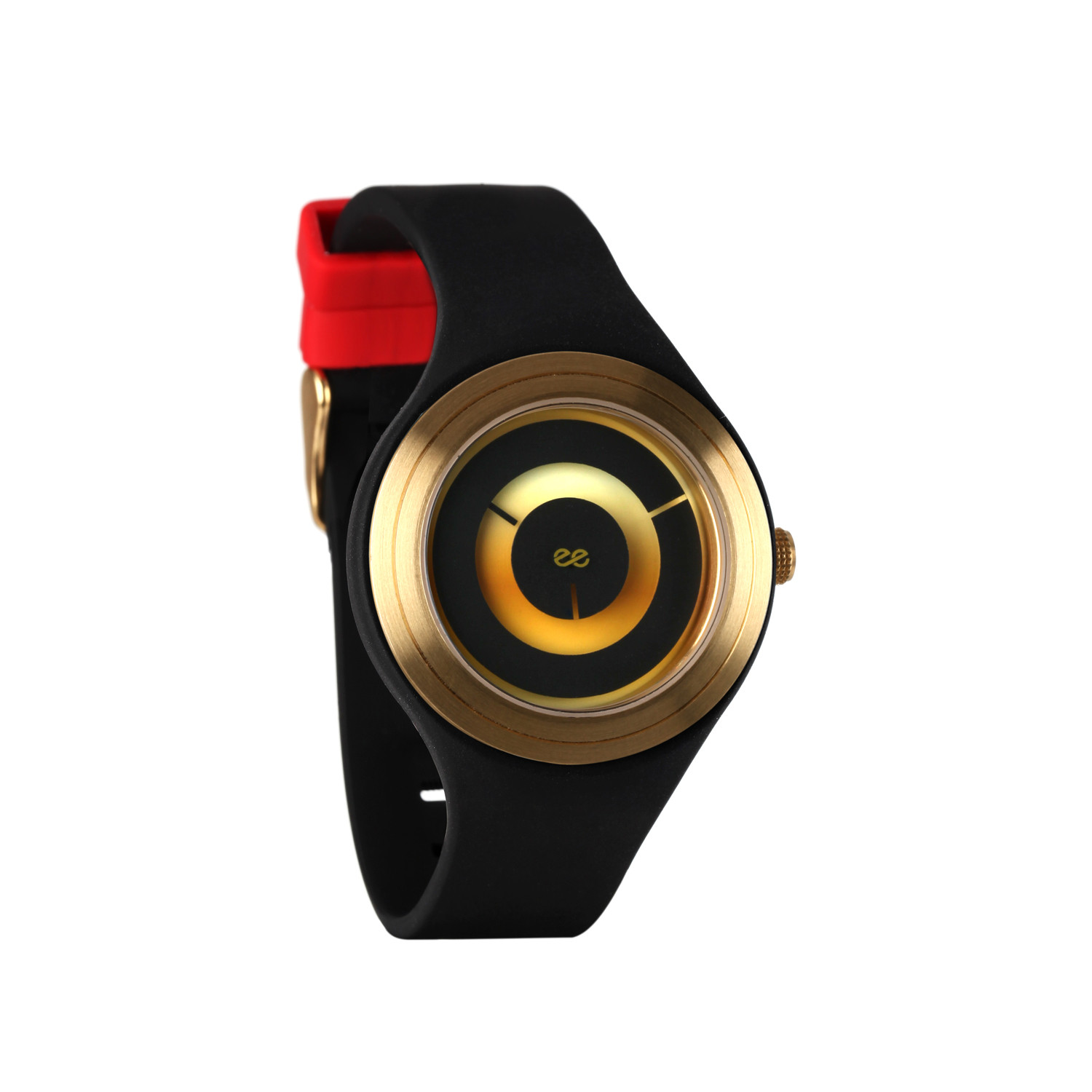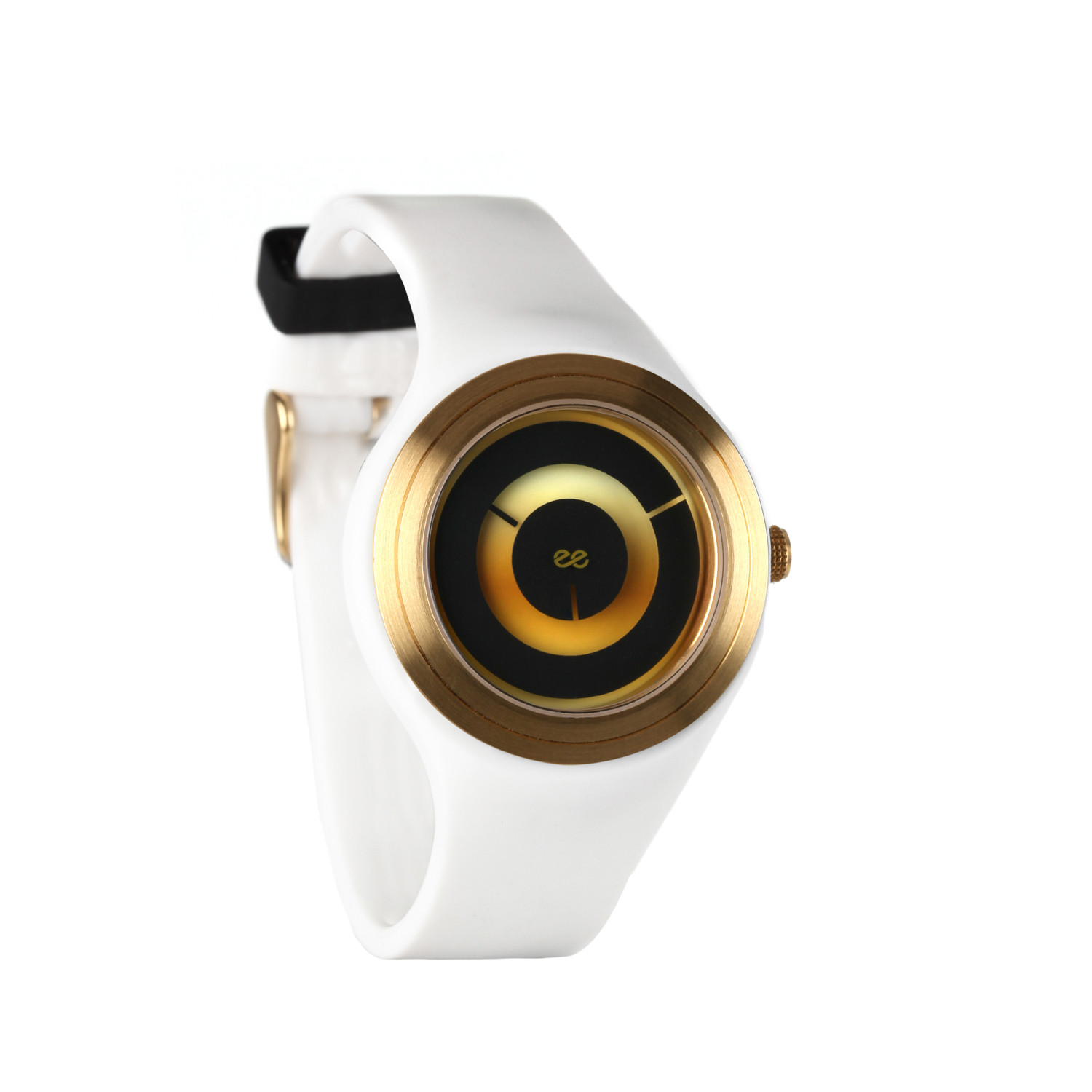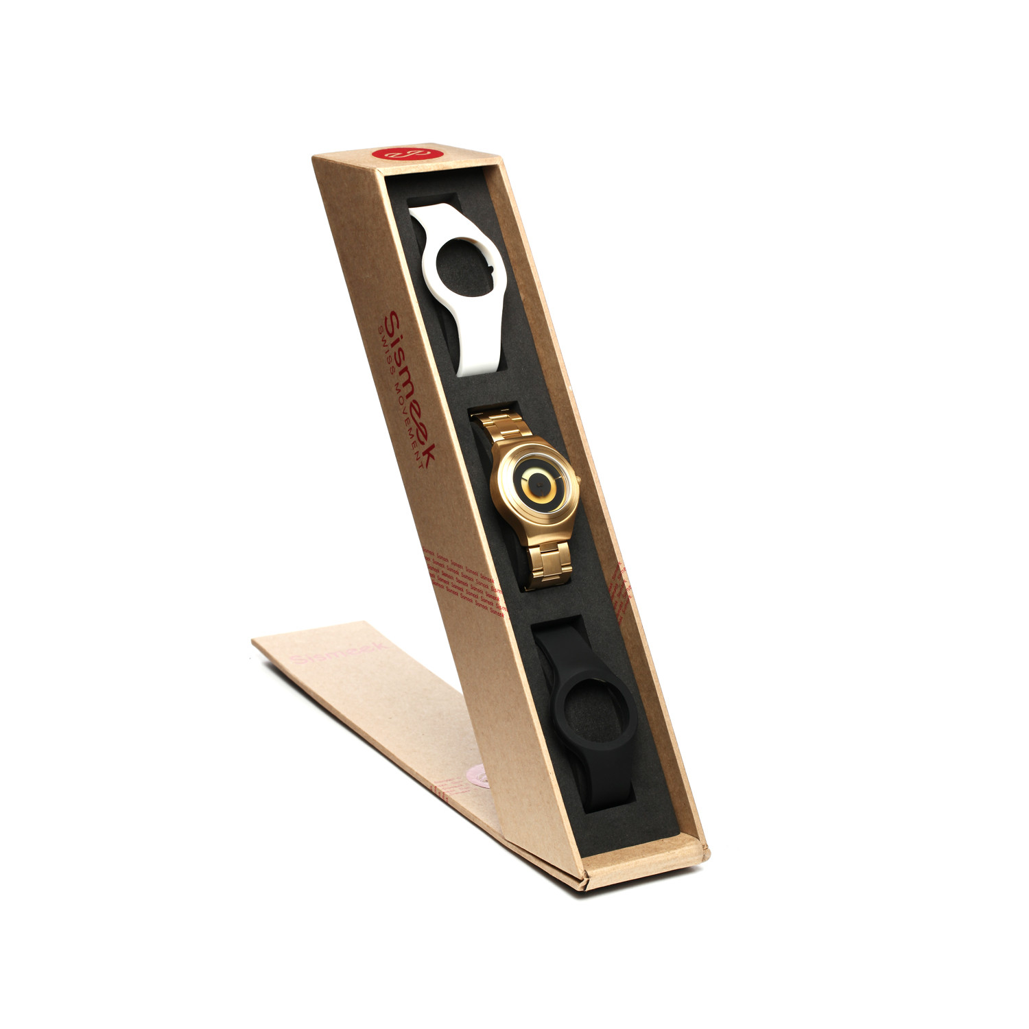 — Includes one dial and three straps: golden stainless steel, white silicone and black silicone