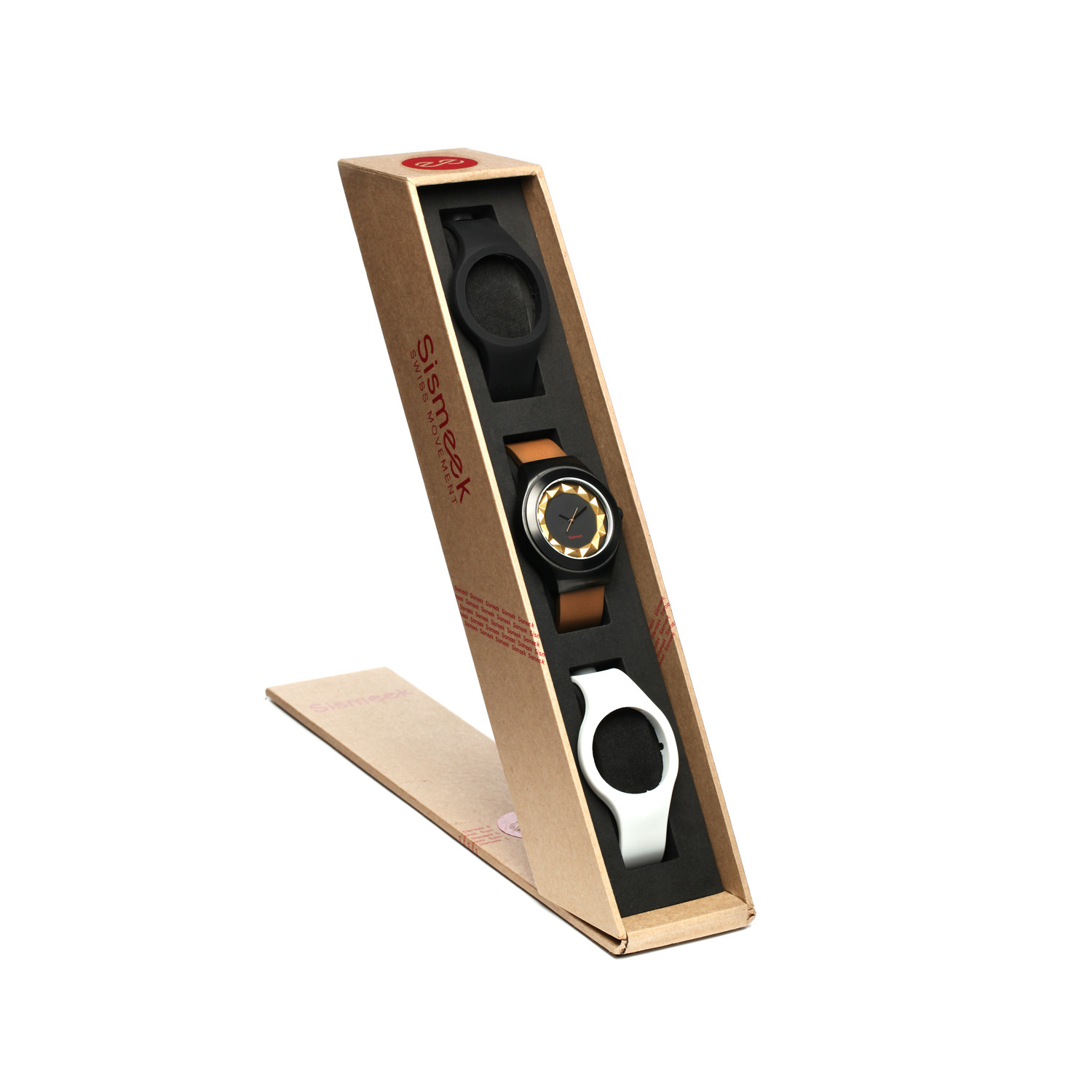 — Includes one dial and three straps: brown leather, black silicone and grey silicone