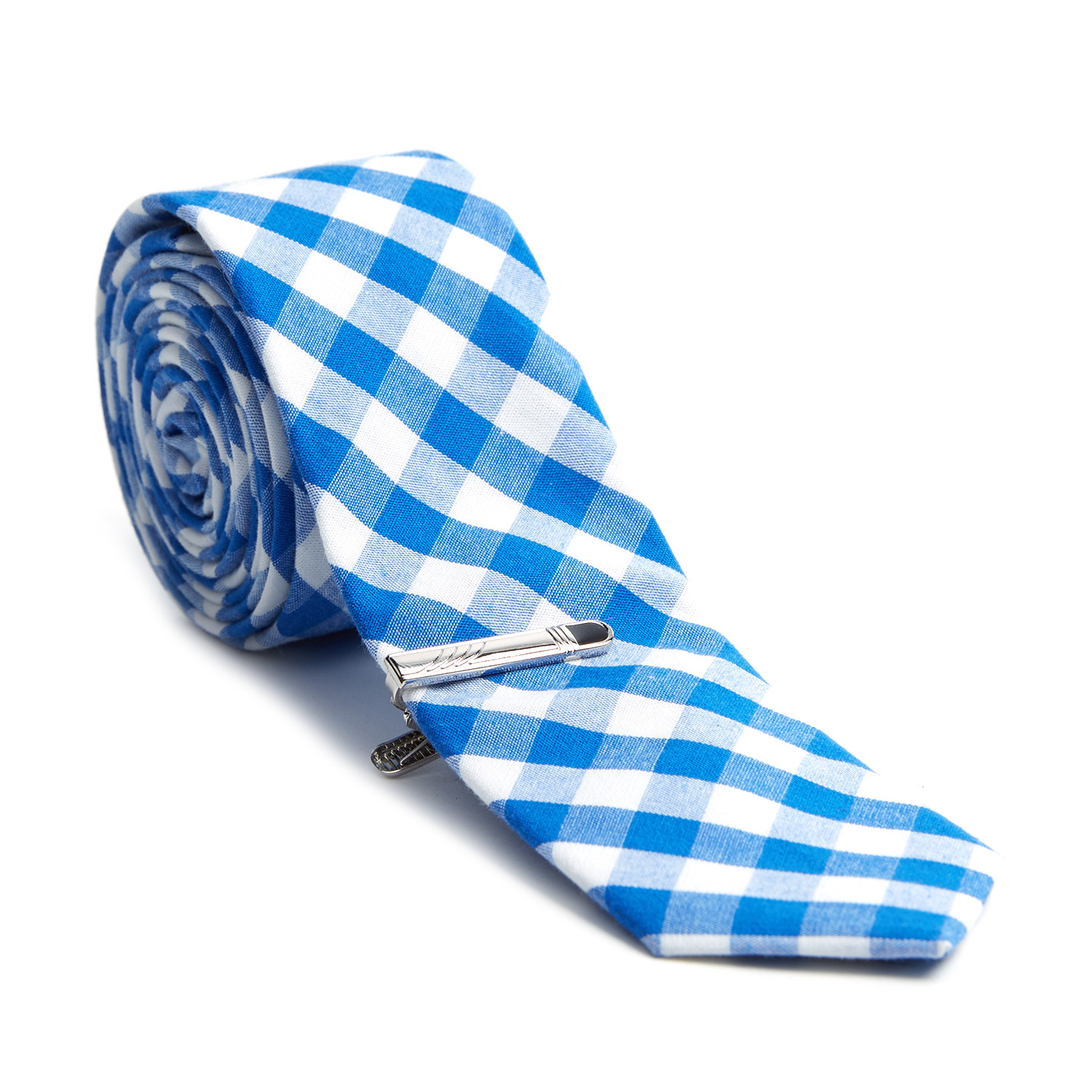 Checkered Skinny Tie + Tie Clip // Blue + White