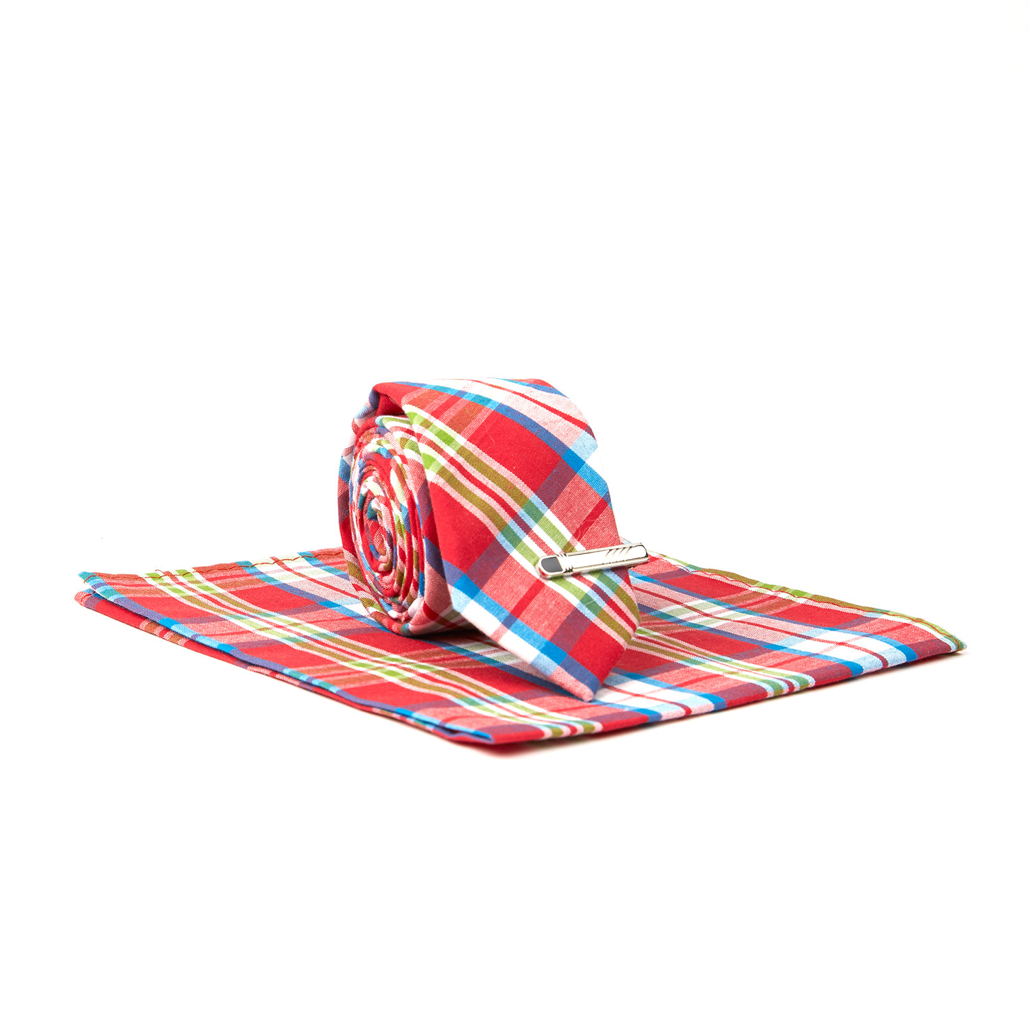 Skinny Tie + Tie Clip + Pocket Square // Red Plaid