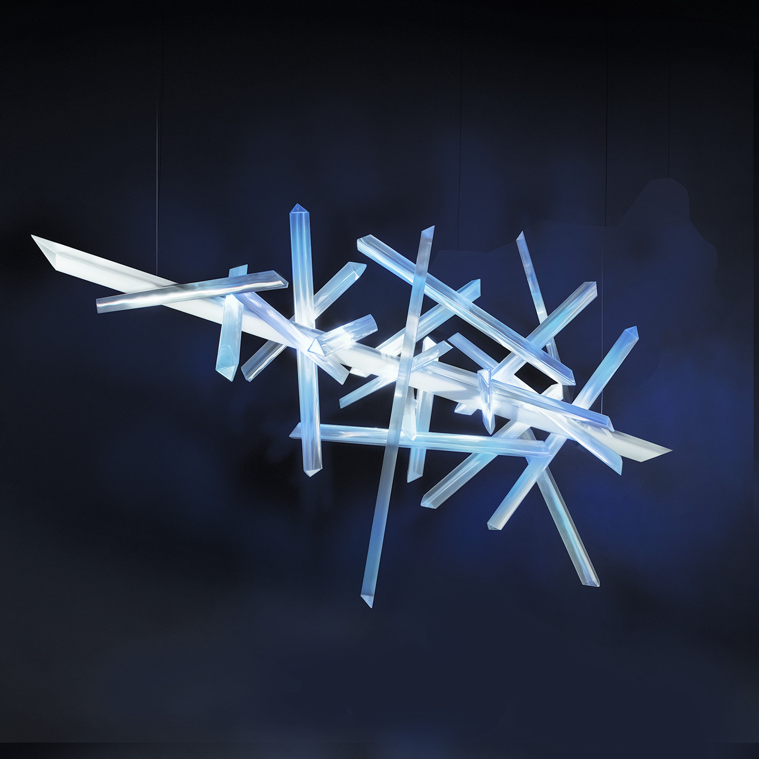 It's design evokes architecture, art, dance, and movement, leaving the onlooker to associate their private, imaginative world. This light sculpture is available in two sizes (180cm and 220cm long), made of a central acrylic structure, serving as the primary light source, diffusing the light with a LED system featuring CRI 90, the most similar to the color temperature of the sun, and a series of Lenfiflex® arrows, which contain LED RGB modules, regulated by an external remote control.