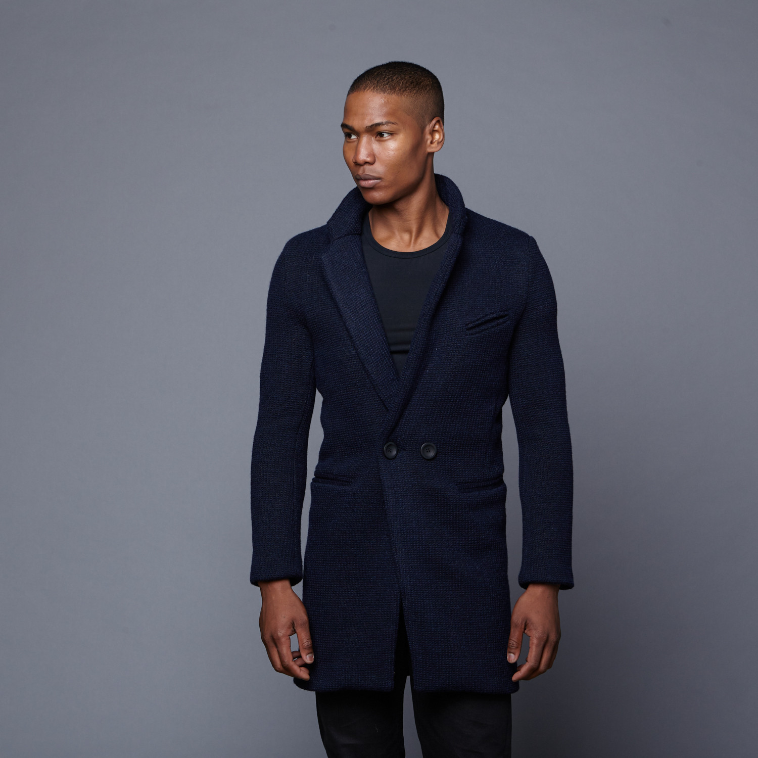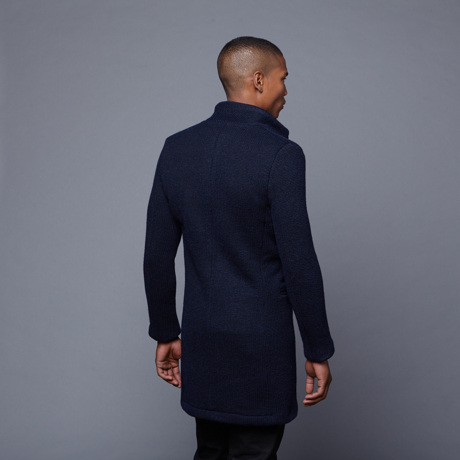A dapper, single-breasted overcoat crafted from rich textured Italian wool features a three-button closure, raw wool edges and external pockets.