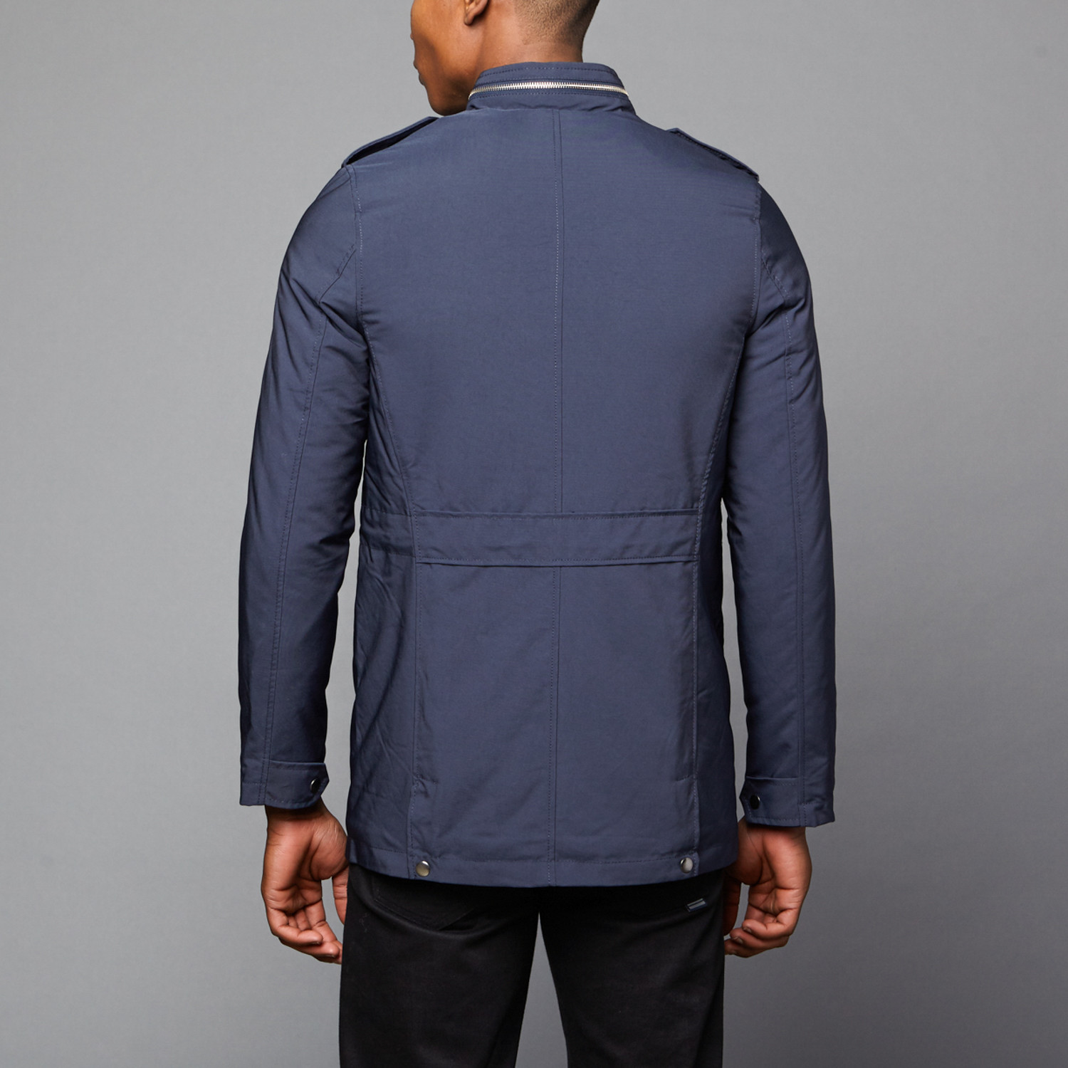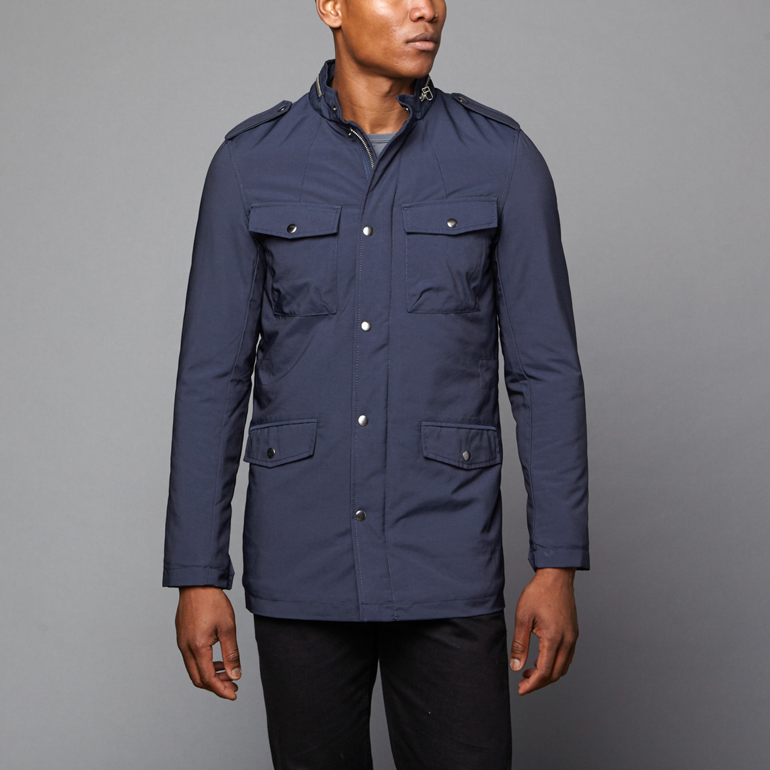 This durable military-inspired utility coat features quilted lining and is crafted from 100% nylon dobby in a clean, structured silhouette.