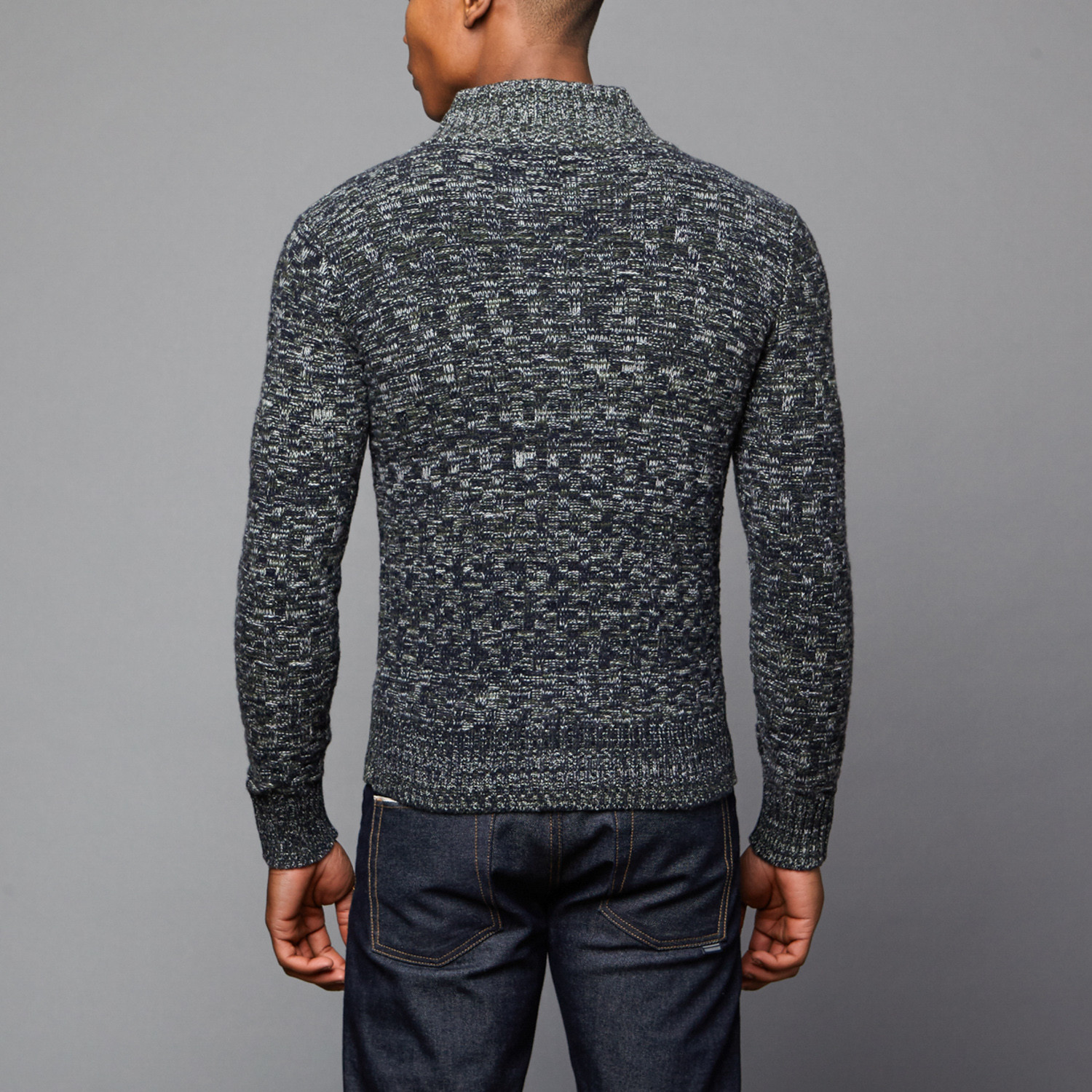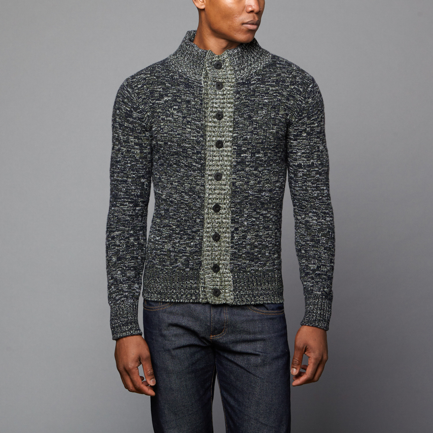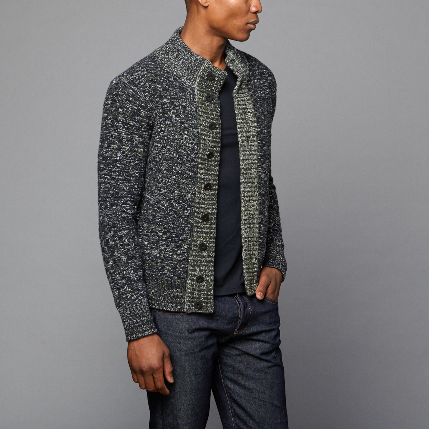 Cross-hatch knitting textures this navy and olive button-down lambswool sweater, detailed with a contrasting placket and brushed silver buttons.