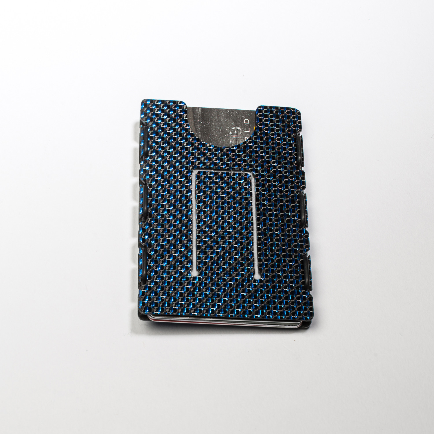 The small weave blue Carbonlite minimalist wallet by slimTECH is made from aerospace-grade carbon fiber and aircraft grade 6061 Aluminum, and is built to last a lifetime. This exquisite and modern wallet is designed to expand or compress and comfortably carry 1-10 cards; always remaining as slim as possible.