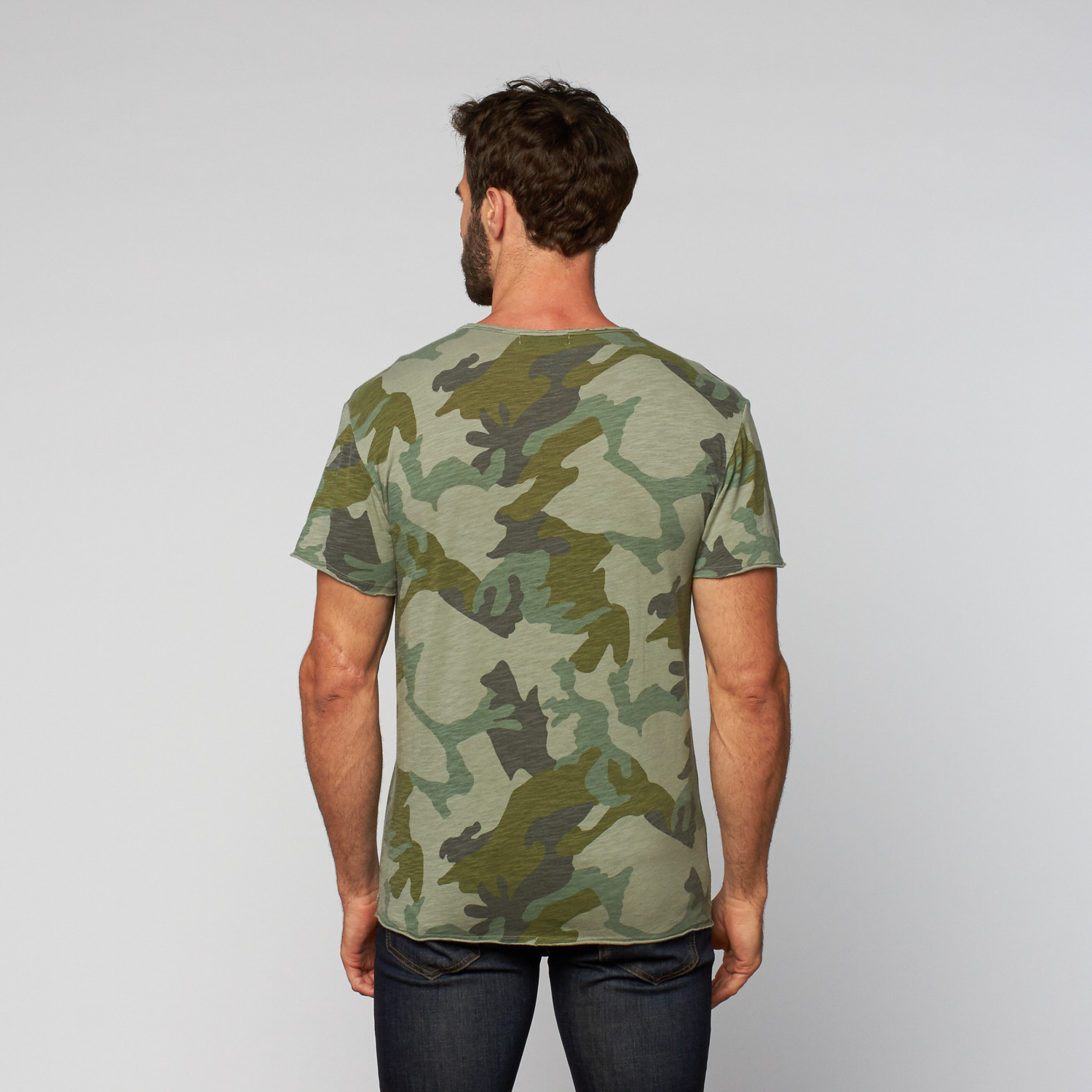 The L.U.C.A. Cotton Creweck Henley is a bold basic for layering under a blazer or bomber. Its camo print is highlighted by a henley neck and raw hem for added casual edge.