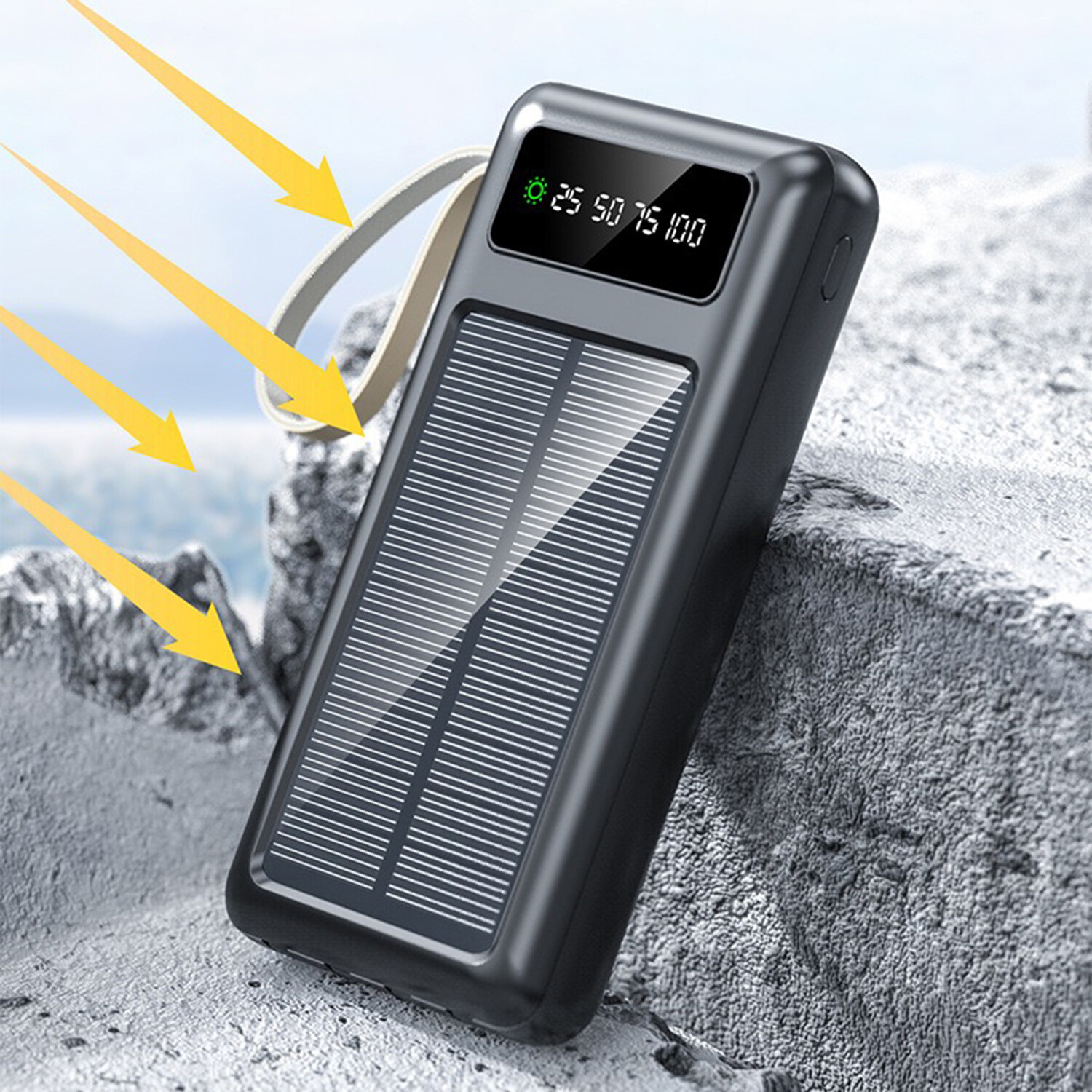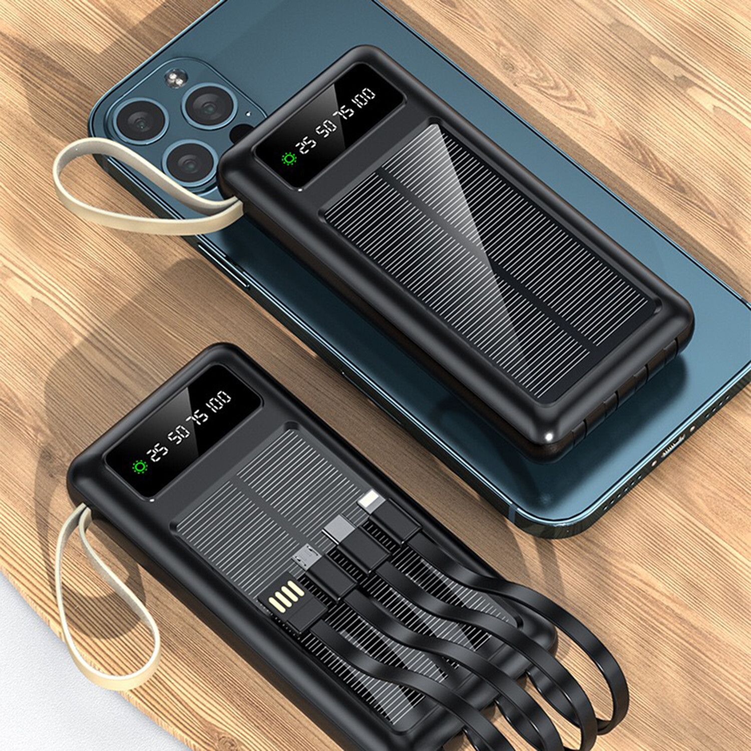 Introducing the EcoBeam SolarBank, a sustainable charging solution with a robust 10000mAh capacity. Encased in a resilient ABS+PC material, it's built to endure. This eco-friendly power bank boasts an LED flashlight and four self-contained wires, offering unparalleled convenience for your charging needs.