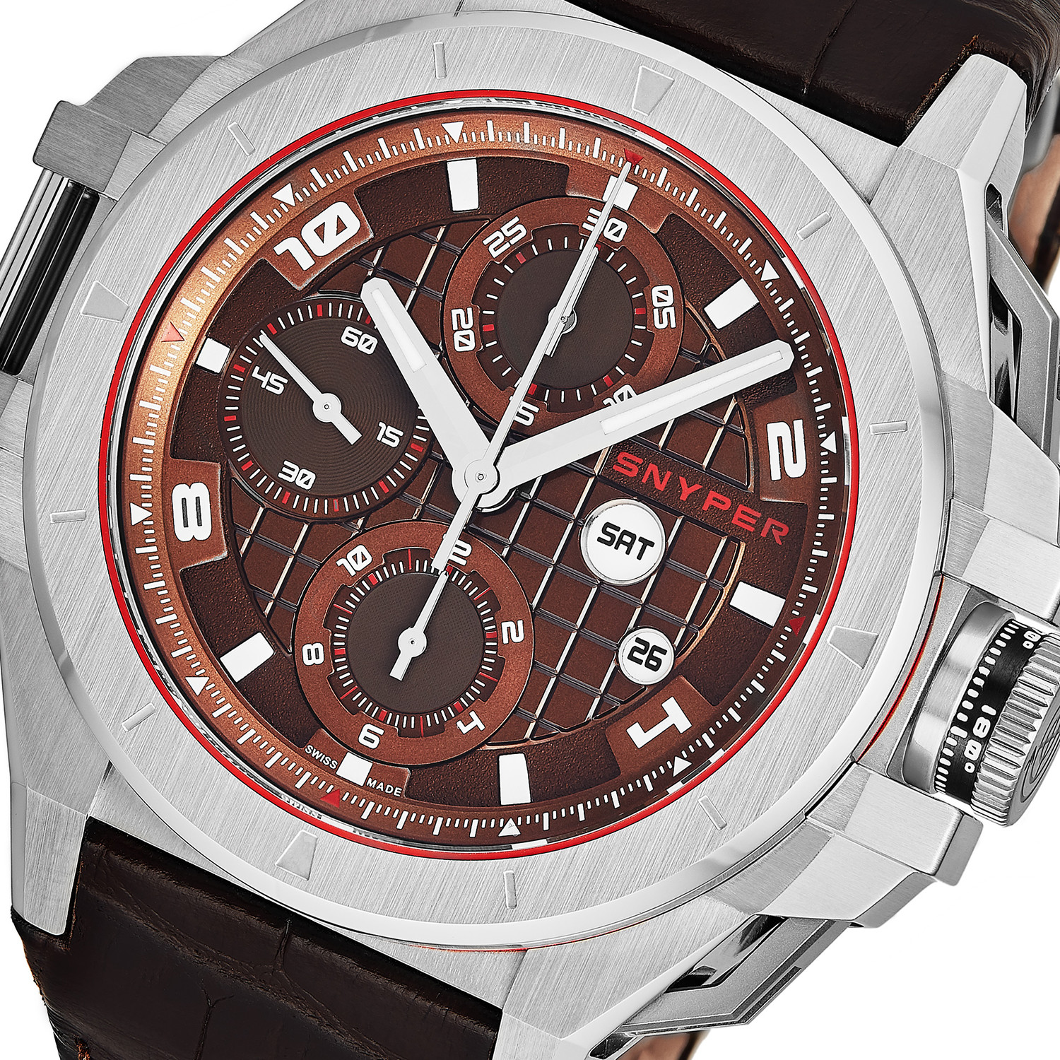 This Snyper Automatic is a bold, sporty watch with all the bells and whistles you could hope for. The immaculate completely mechanical movement features a full chronograph and is on glorious display through the transparent caseback. With a sapphire crystal, 100M of water resistance, and a power reserve of 48 hours, this is one watch that never needs to take a break.