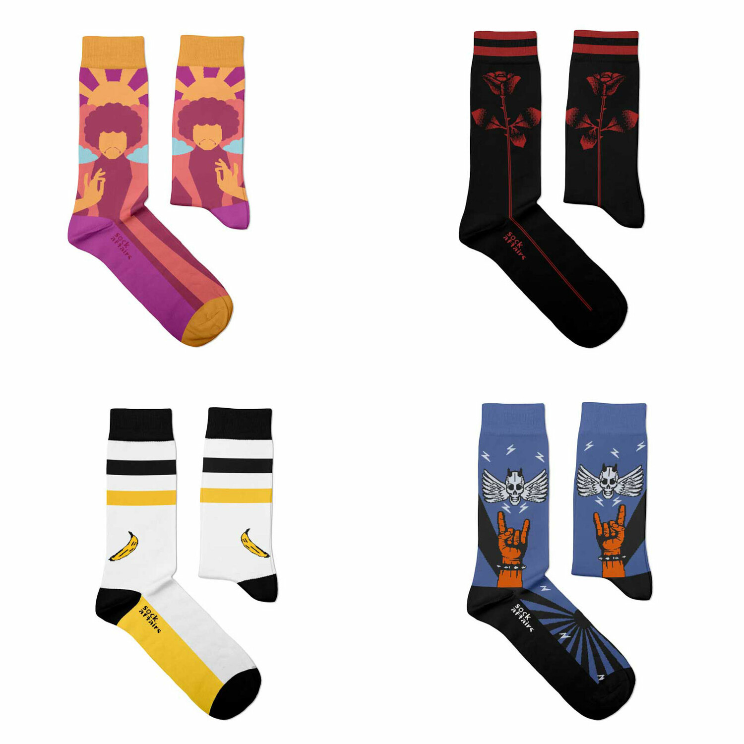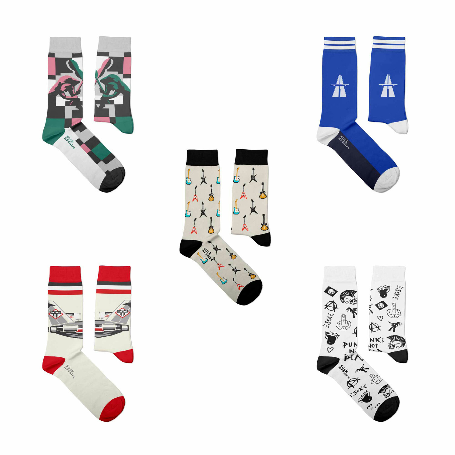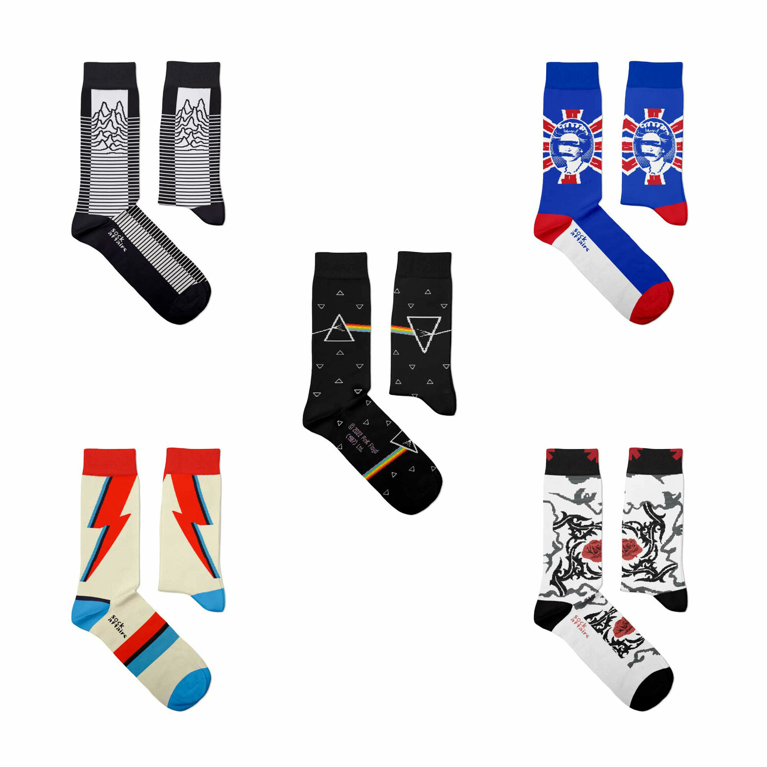 Pack Contains: Exotic Delights Socks, Punk Royale Socks, Lightning Socks, Dark Side of the Moon Socks, Californian Chilli Recipe Socks, Attraction-on-Thames Socks, Zhe Highway Socks, Incensed to Kill Socks, Punk's Not Dead Socks, Six Strings Socks, Trippy Guitars Socks, Perpetrator Socks, The Banana Album Socks, Flying Skull Socks.
