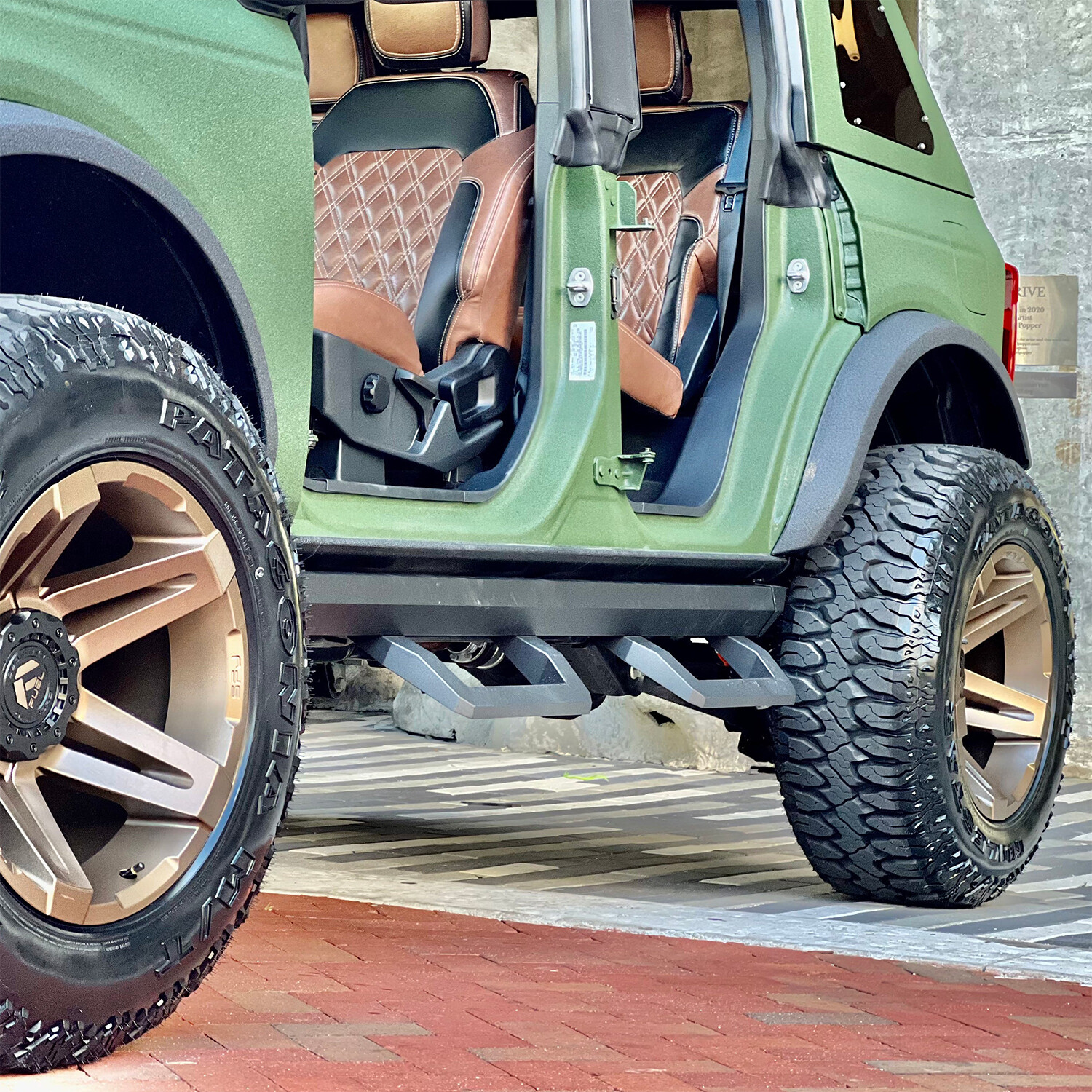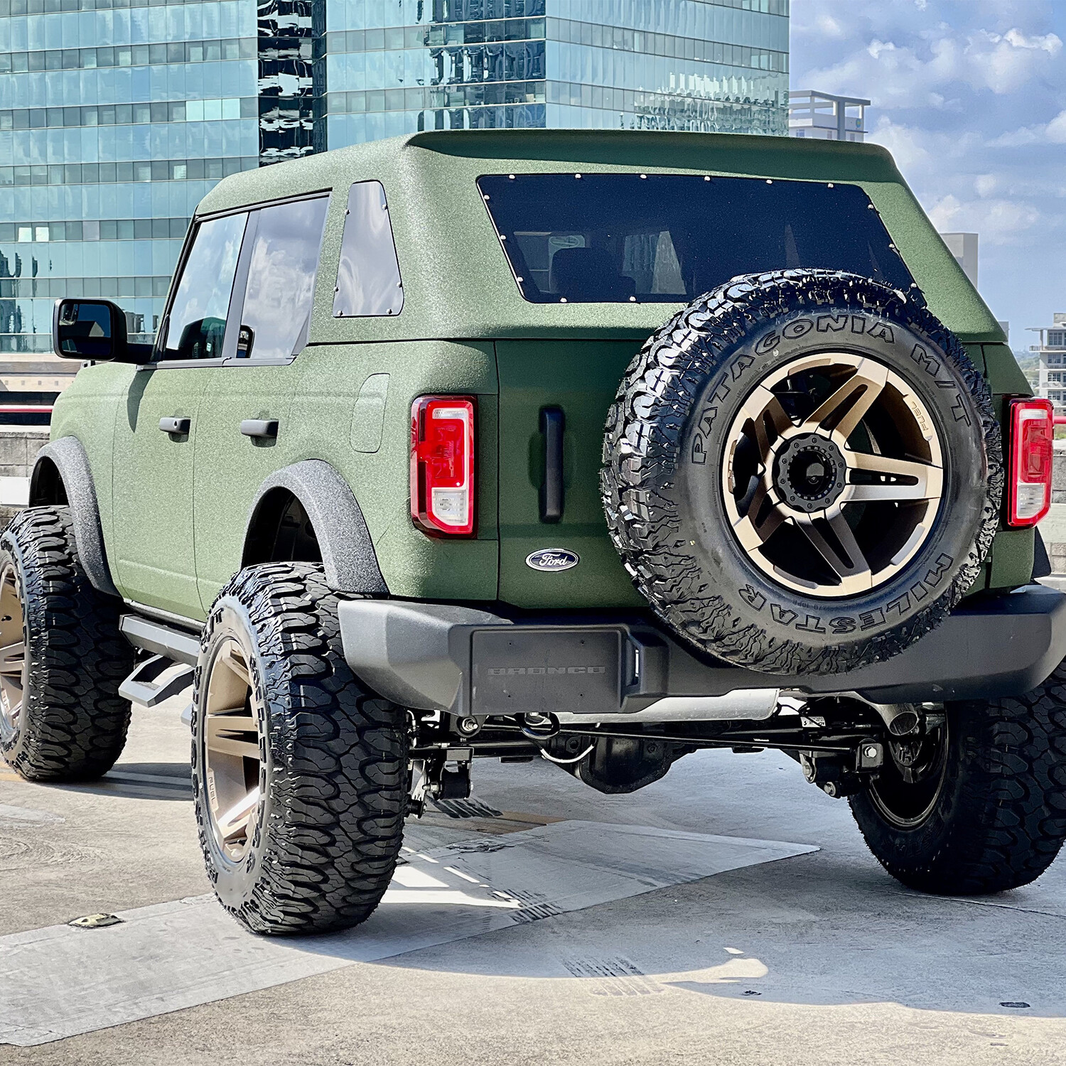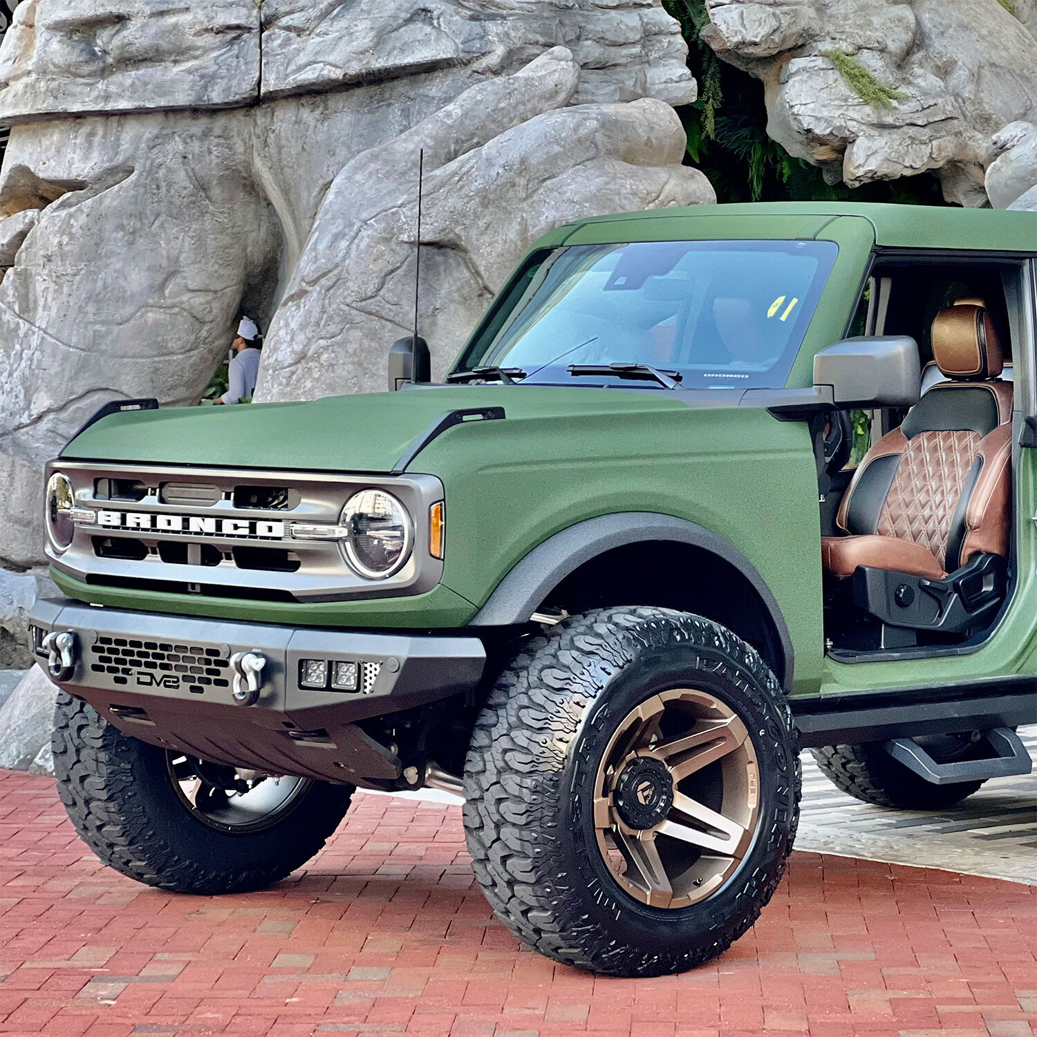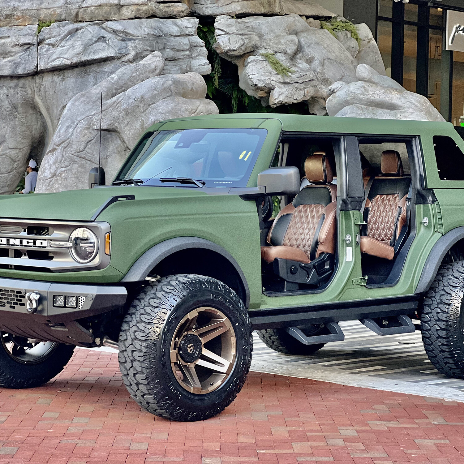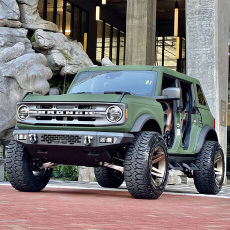 The guys over at SoFlo have outdone themselves. This 2021 V-6 Twin Turbocharged Big Bend Ford Bronco is loaded with upgrades that give it hard core cred. With a slant back top, marine grade King Ranch leather, and an automatic 10 speed transmission, it is built for complete style and comfort. But the real kicker is the killer Kevlar® coating. Fend off branches, rocks, and other hazards with a finish that was 120 hours in the making. The process of sanding and spraying a three part epoxy with Kevlar® fibers embedded into the coat, adding an extra layer of protection for rugged use on and off road. And finally, they finished off this beast with Patagonia tires, silver alloy SFJ rims, and a 3.5” lift with a steering stabilizer to ensure control at high speeds, so you can roll fast and go hard on any terrain. But hurry. There's only one and it's going to be gone before you know it.