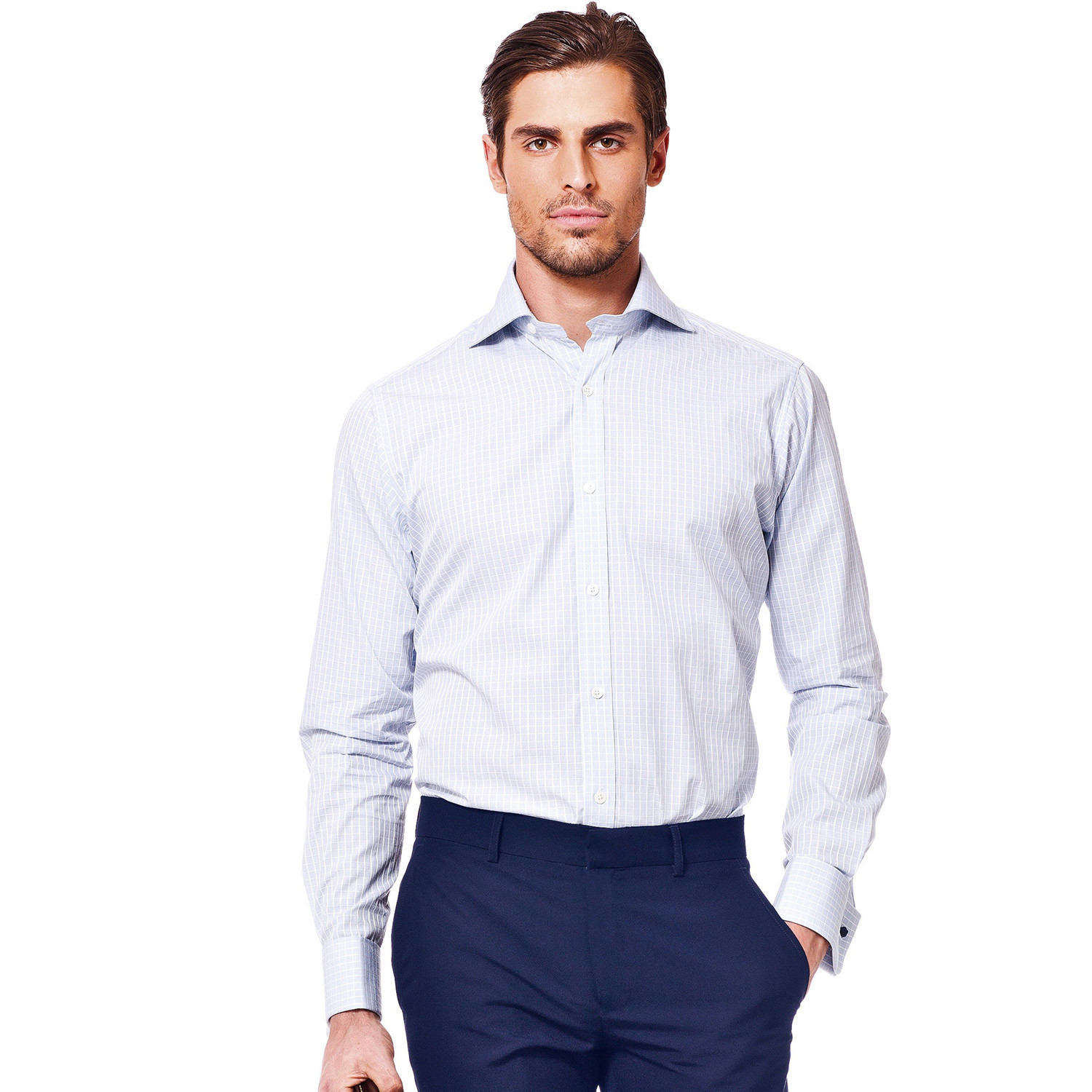 One must admit that occasionally our compadres across the pond do a mean take on formal dressing. Inspired by the British savoir-faire, this light blue fabric provides the perfect backdrop for classic checks with white details.