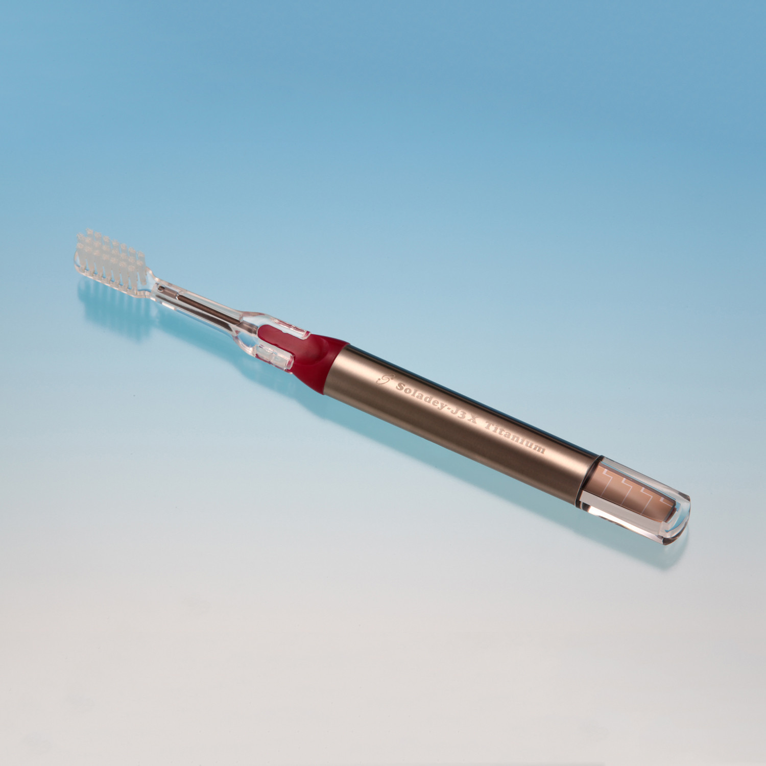 The Soladey ionic brush has a light-activated titanium dioxide rod (semiconductor) inside the handle that, when exposed to any light source (a fluorescent bathroom light, a plain light bulb or sunlight), converts light into negatively-charged ions (electrons). The rod releases these ions, which blend with saliva to attract positive (hydrogen) ions from the acid in the dental plaque.