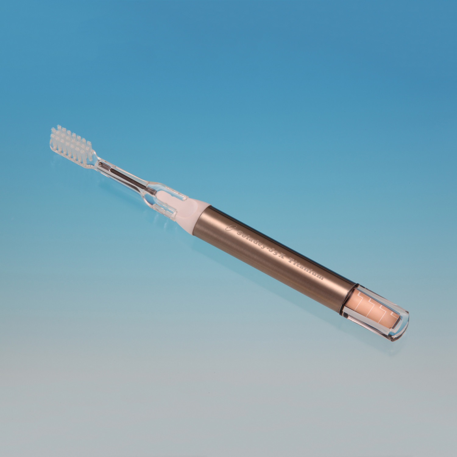 The Soladey ionic brush has a light-activated titanium dioxide rod (semiconductor) inside the handle that, when exposed to any light source (a fluorescent bathroom light, a plain light bulb or sunlight), converts light into negatively-charged ions (electrons). The rod releases these ions, which blend with saliva to attract positive (hydrogen) ions from the acid in the dental plaque.