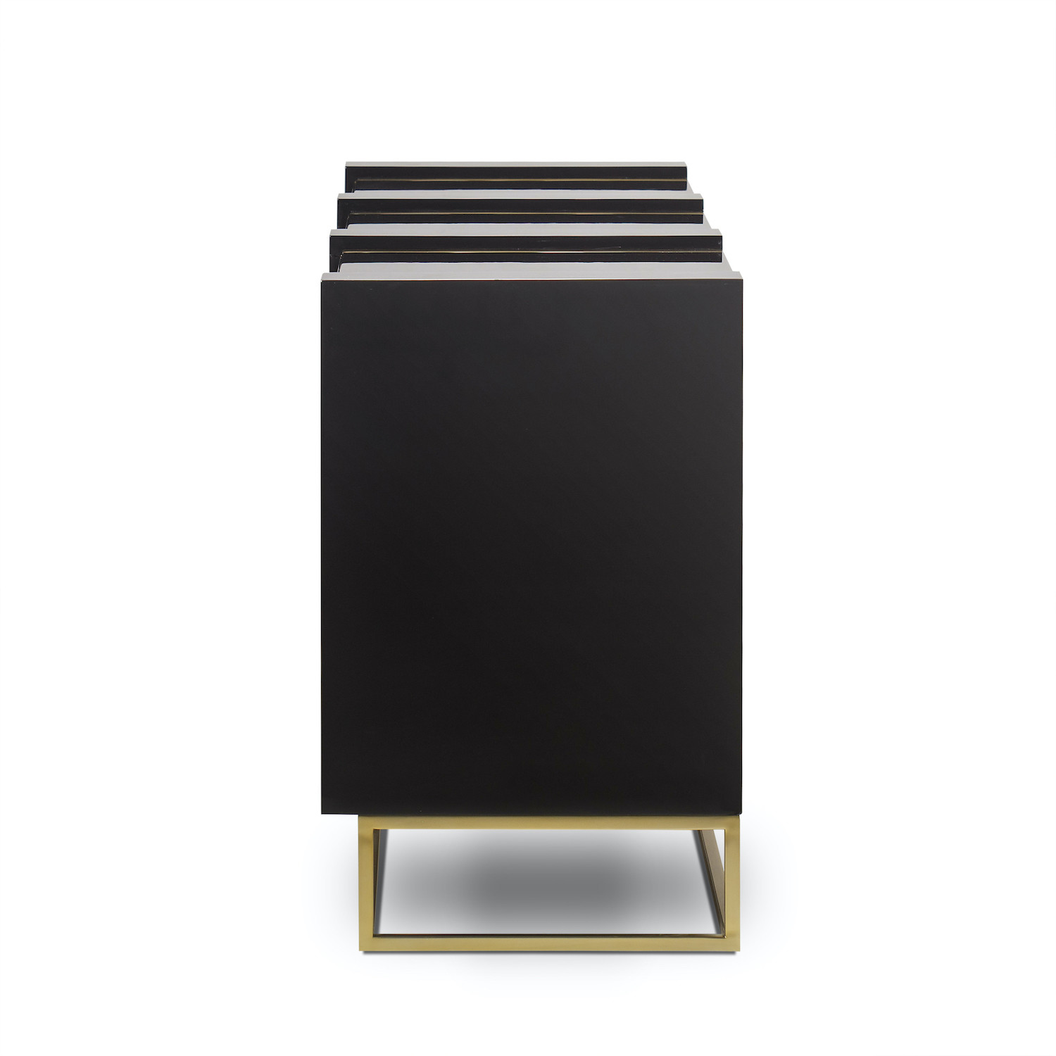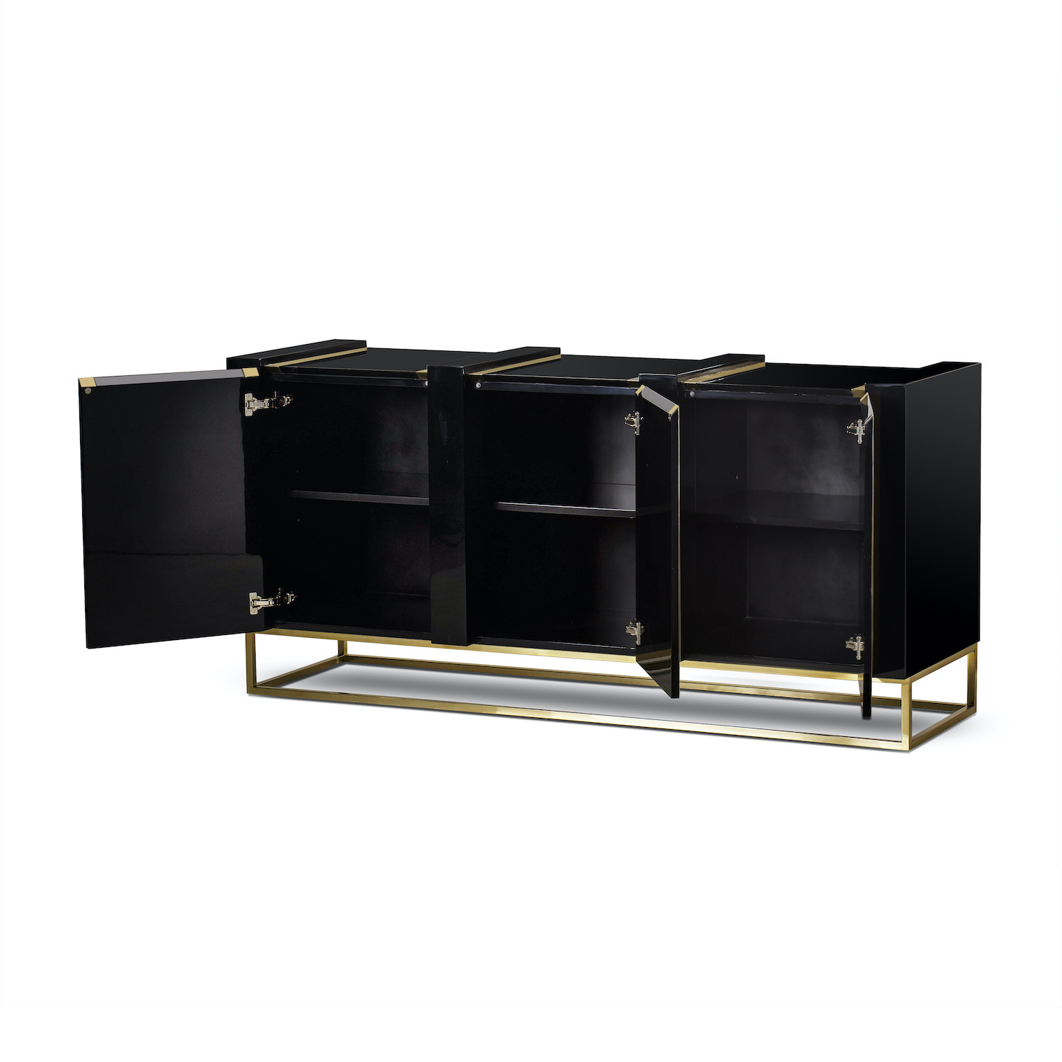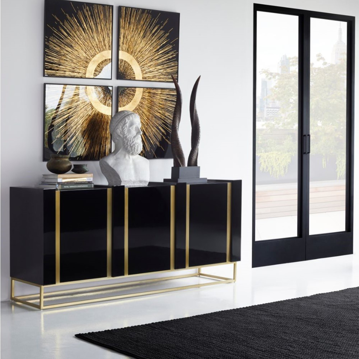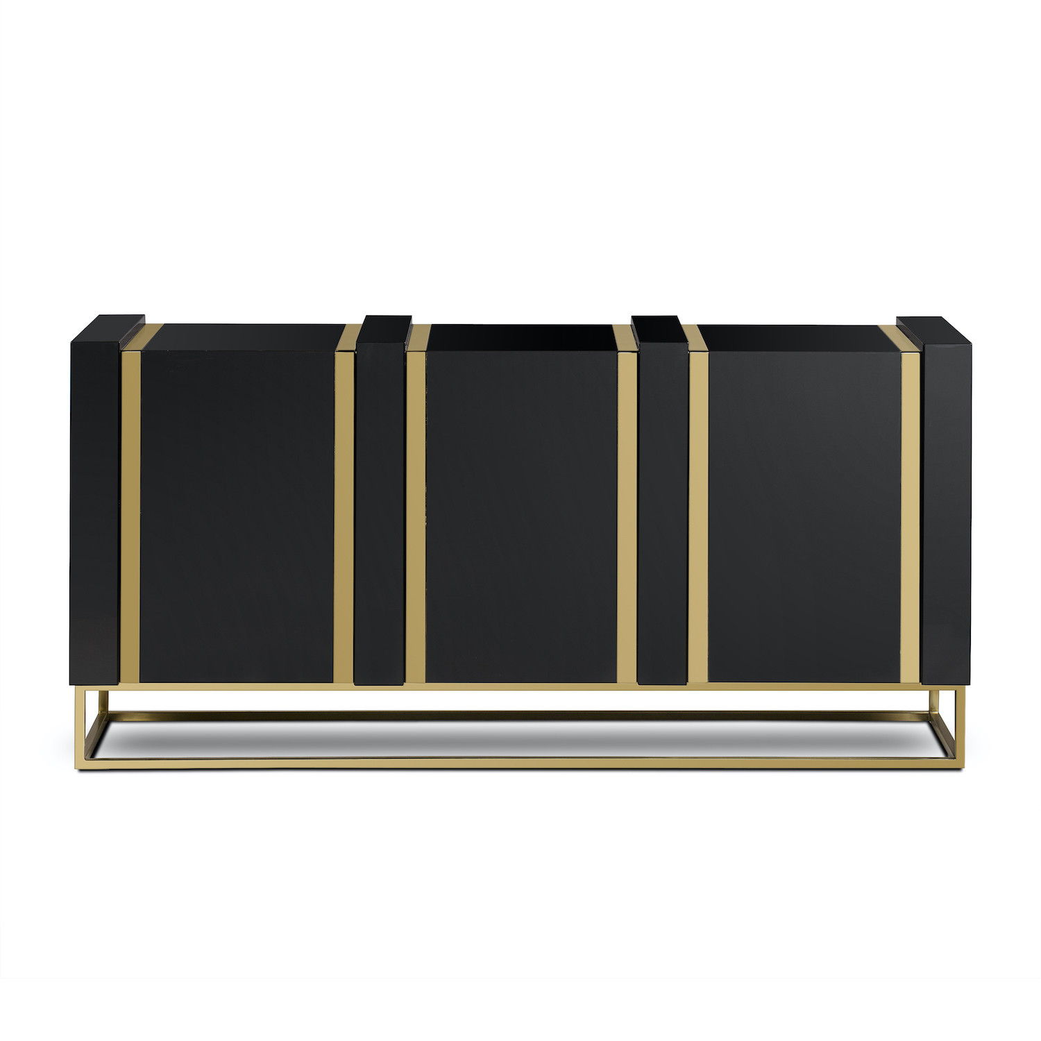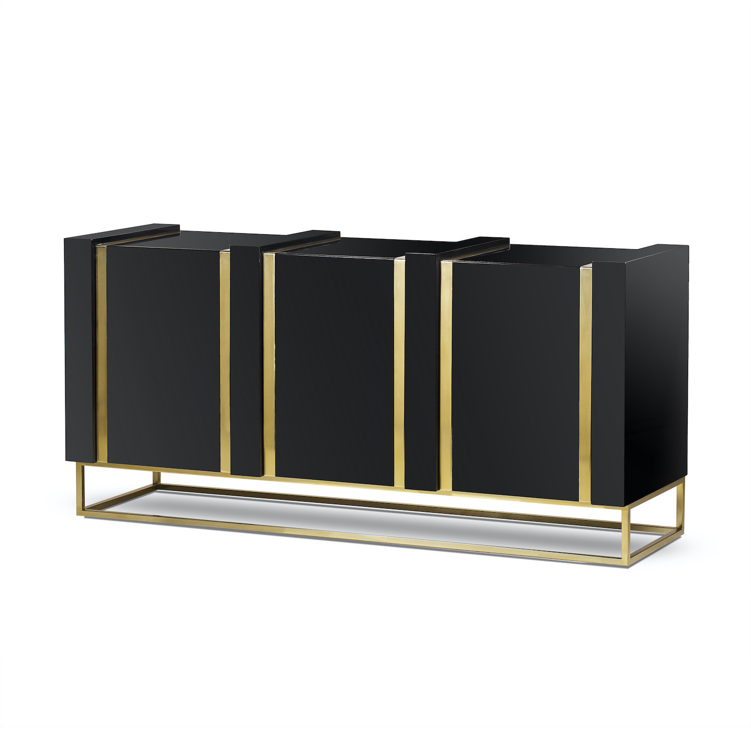 Striking from every angle, this DeLuxe three-door sideboard is finished in a stylish black high gloss lacquer. Contrasting banded detailing in stainless steel with brass finish creates visual interest at varying intervals.