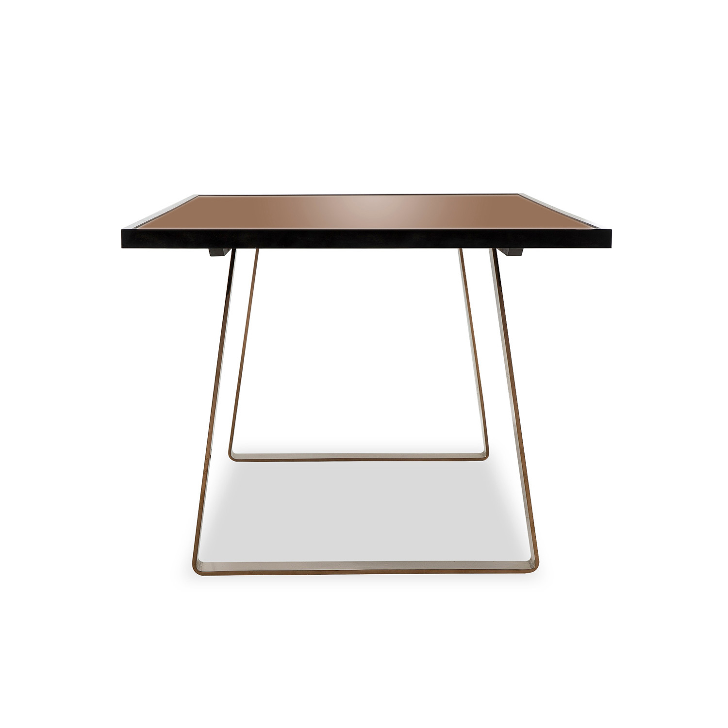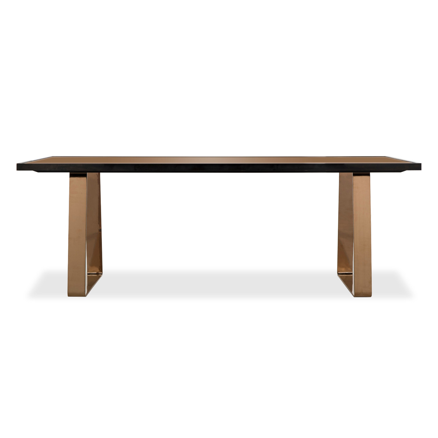 The Joplin DIning Table gives the conventional dining table a twist, incorporating some signature finishes. Stainless steel sledge legs in rose gold support a rose gold, glass top, set in a beech frame, and finished in luxe, high gloss lacquer, which showcases the subtle grain detail of the wood.