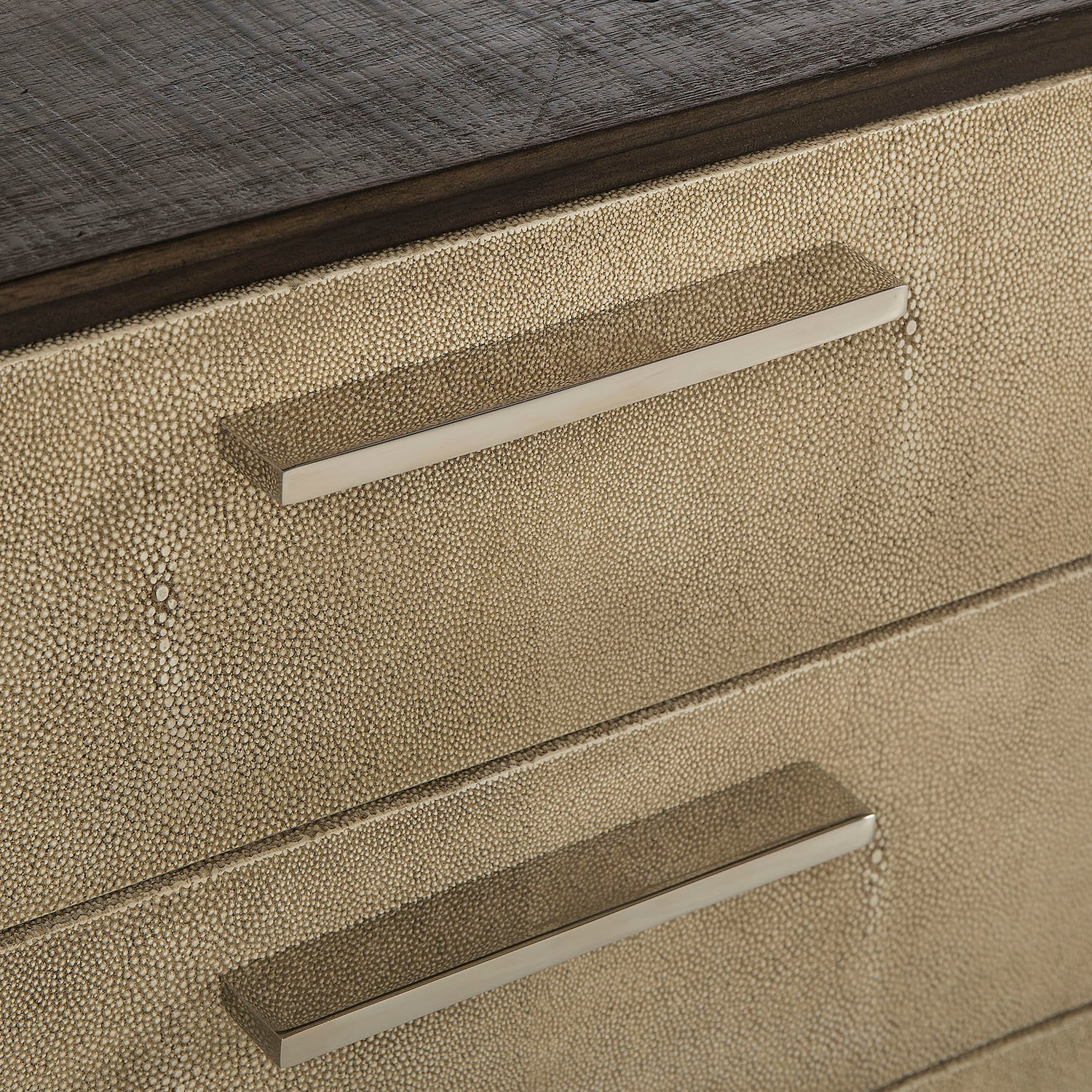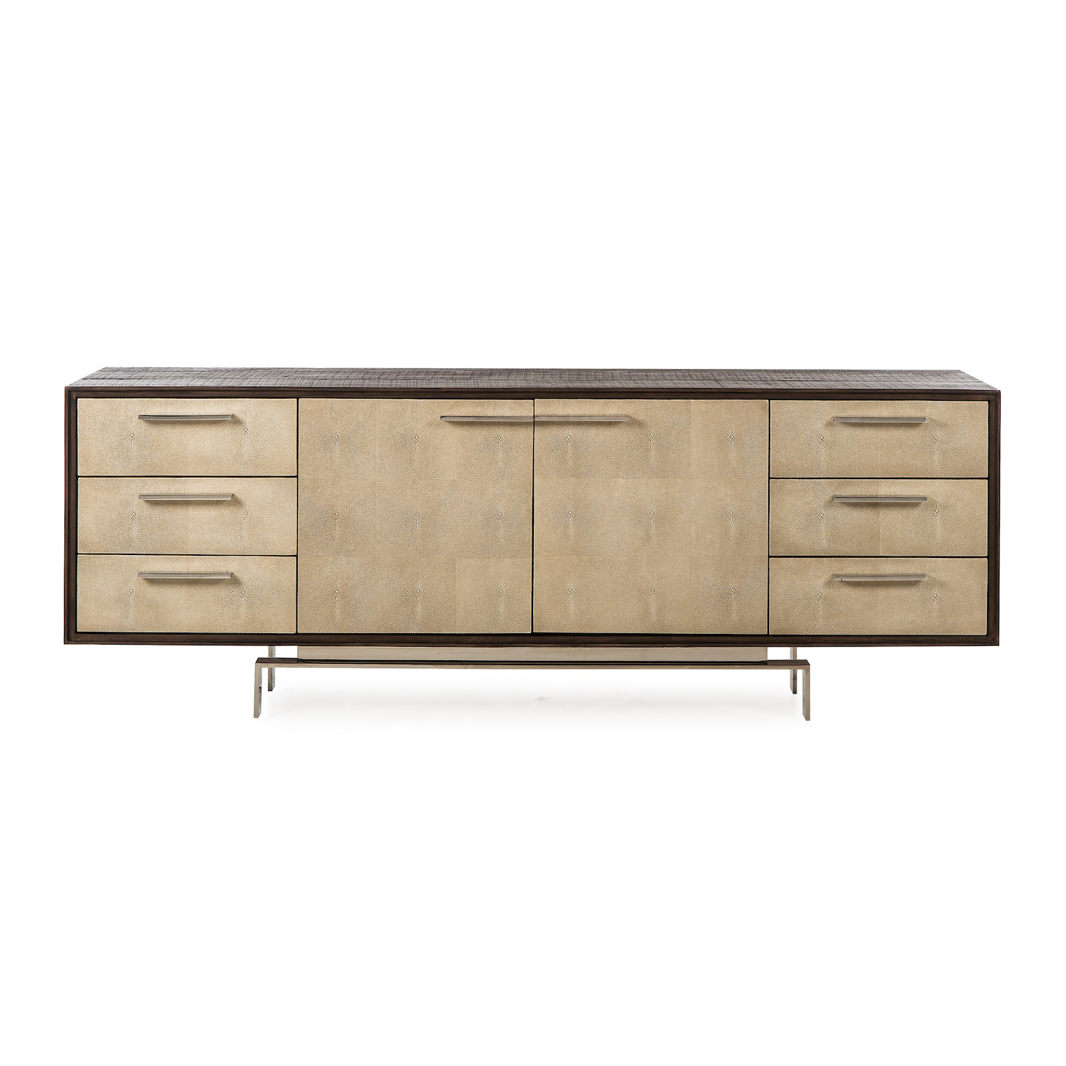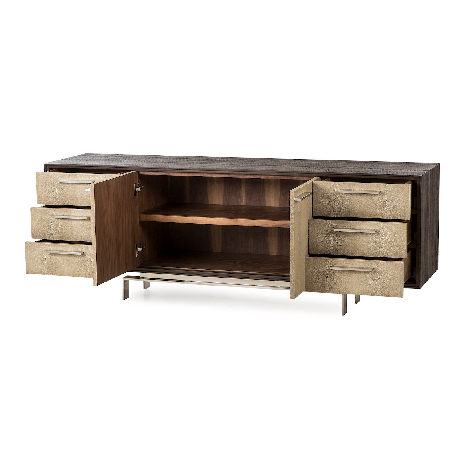 The Latham Credenza captures relaxed elegance. Reclaimed Peroba veneers, sourced from Brazilian rainforests, offer a raw-yet-refined aesthetic, and provides the perfect counterpoint to six, natural-colored, faux shagreen drawer and door fronts. Sleek stainless steel handles add a touch of glamor, and keep this piece contemporary. Inside, two open shelves provide ample storage space.