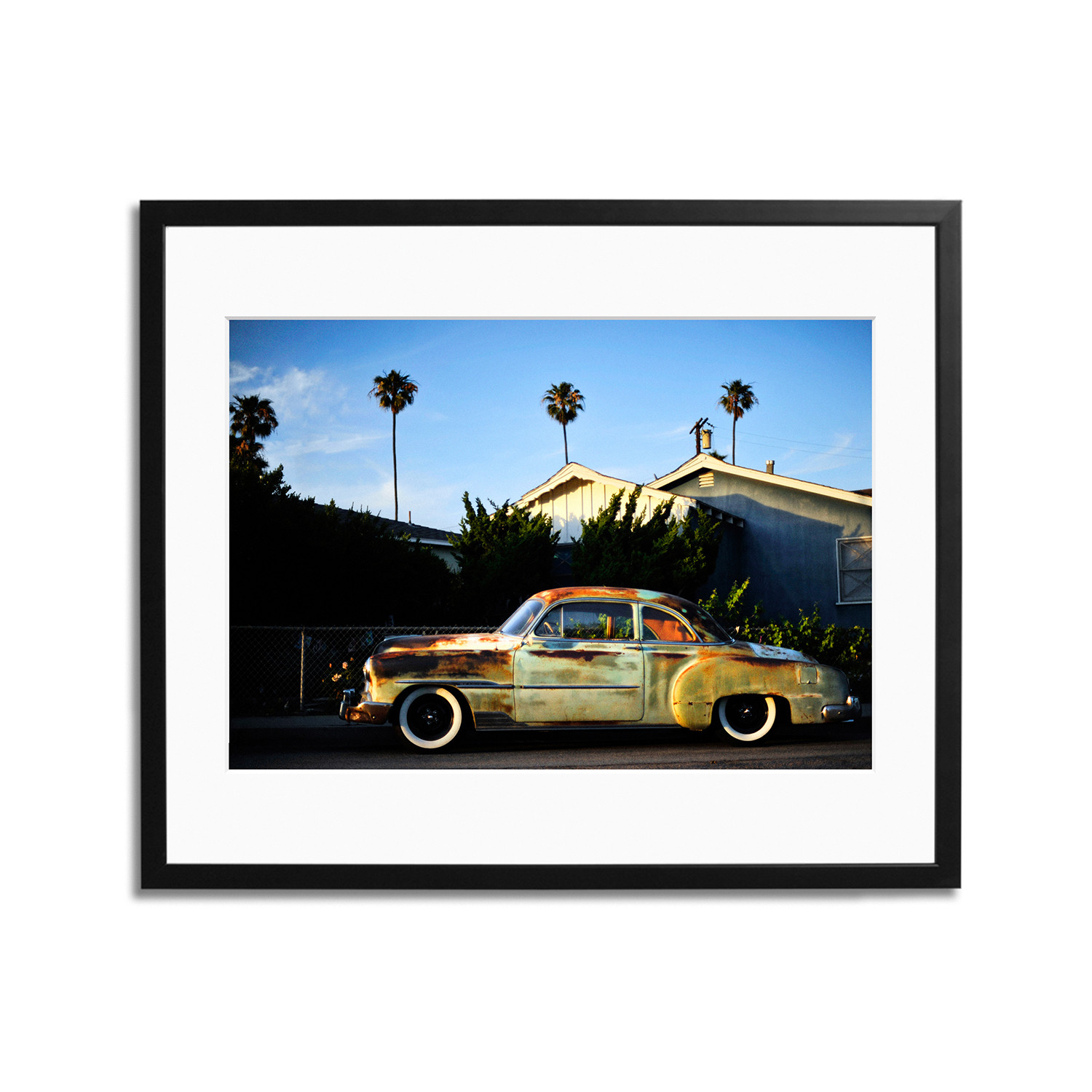 Bring some classic charm to your empty space with this nostalgic and high-contrast art print that features a rusty vintage car sitting on a Los Angeles side street.