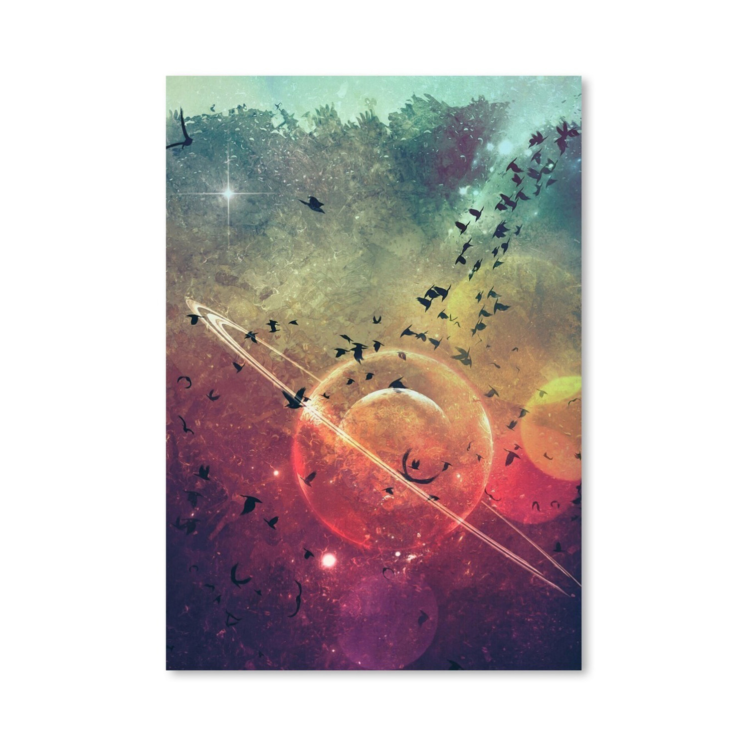 Graphic and unashamedly bold, this work by digital artist Spires is indicative of an entire world of design that relies on abstractions and geometry to set a mood or draw your attention. It's fine art from a fantastical perspective, printed in high definition detail that keeps you surrounded by a quantity of dizzying colors.