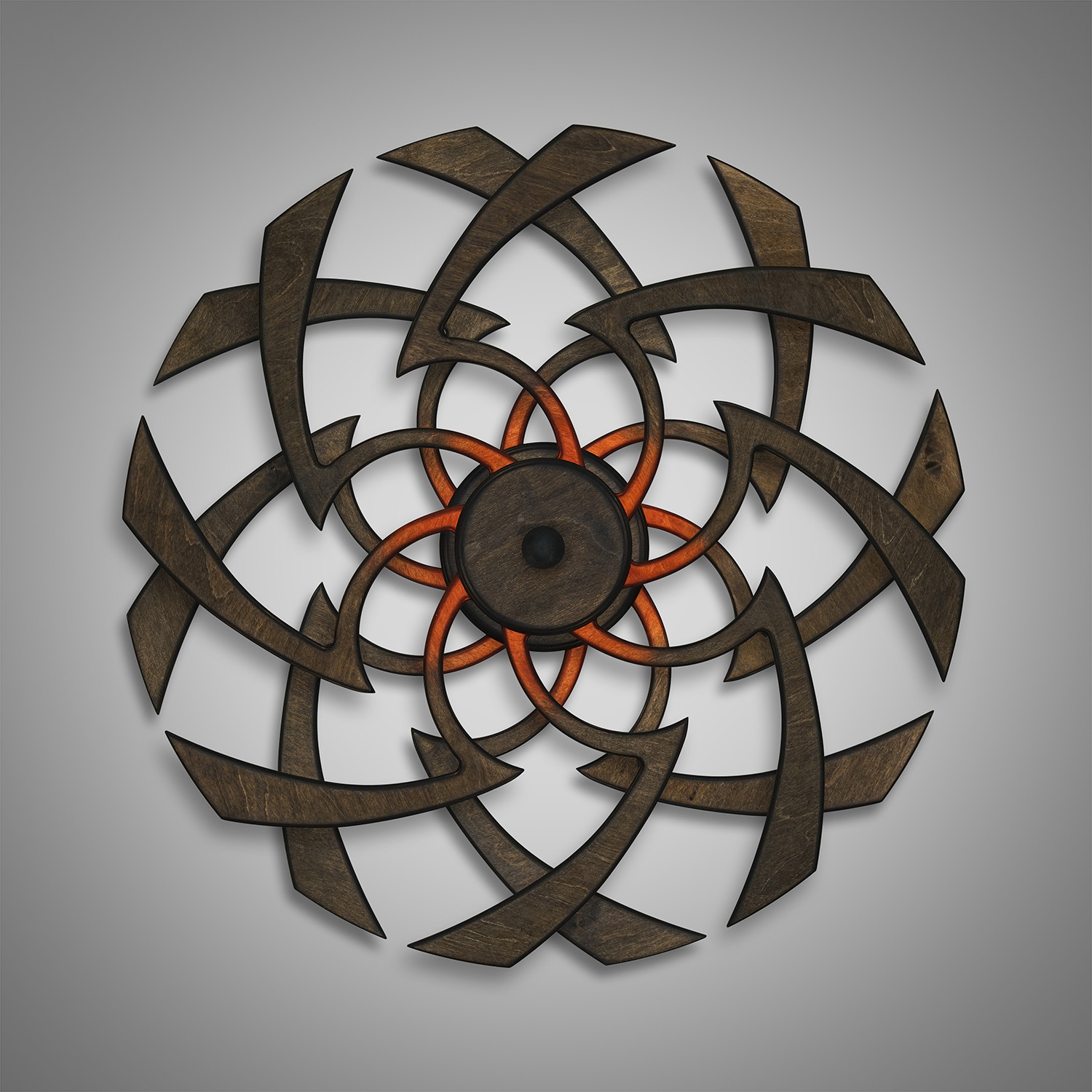 Award-winning sculptor Ryan Kvande both conceptualizes and hand-makes each of these stunning pieces. He draws his designs onto Baltic Birch wood, then cuts them out with a scroll saw, rounds the edges with a router and finishes the final shaping with a belt sander. Each part must be meticulously measured using a laser-accurate drill press to help achieve the level of precision needed. The entire piece is then re-sanded by hand, and colored with dye instead of stain because it penetrates deeper into the wood and brings out the grain detail. Lastly, it is finished with Tung oil, which brings out the wood grain even more. Every sculpture is equipped instrument-grade, sealed stainless steel bearings to help achieve the longest spin times possible.