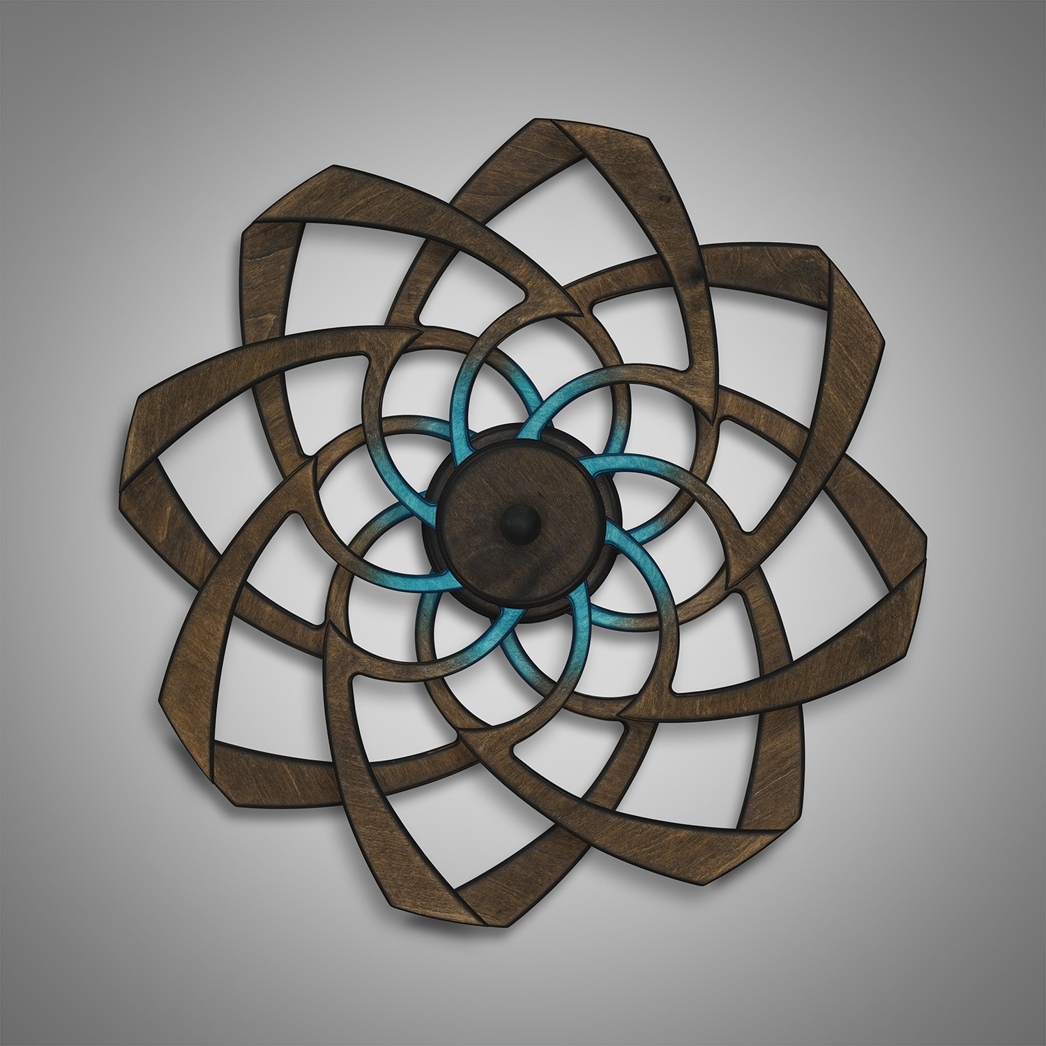 Award-winning sculptor Ryan Kvande both conceptualizes and hand-makes each of these stunning pieces. He draws his designs onto Baltic Birch wood, then cuts them out with a scroll saw, rounds the edges with a router and finishes the final shaping with a belt sander. Each part must be meticulously measured using a laser-accurate drill press to help achieve the level of precision needed. The entire piece is then re-sanded by hand, and colored with dye instead of stain because it penetrates deeper into the wood and brings out the grain detail. Lastly, it is finished with Tung oil, which brings out the wood grain even more. Every sculpture is equipped instrument-grade, sealed stainless steel bearings to help achieve the longest spin times possible.