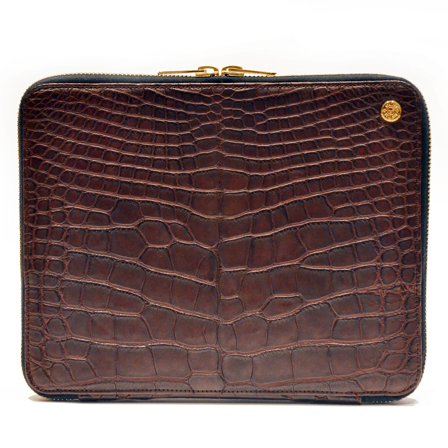 In a modern age where portable, wireless computers live in our bags and purses, it's time that we carry our iPads with the style they deserve. Why not treat your futuristic technology with the lavish attention that it deserves, with the iPad Case from designer Jason Stalvey. The premium cut of alligator belly leather shines in a luscious dark brown, and the 18K gold-finished hardware is a beautifully gleaming additional gilding.