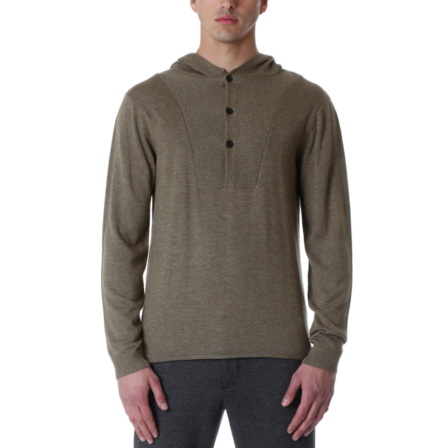 — Large ribbed contrast at neck, wrist, center chest, and hood
