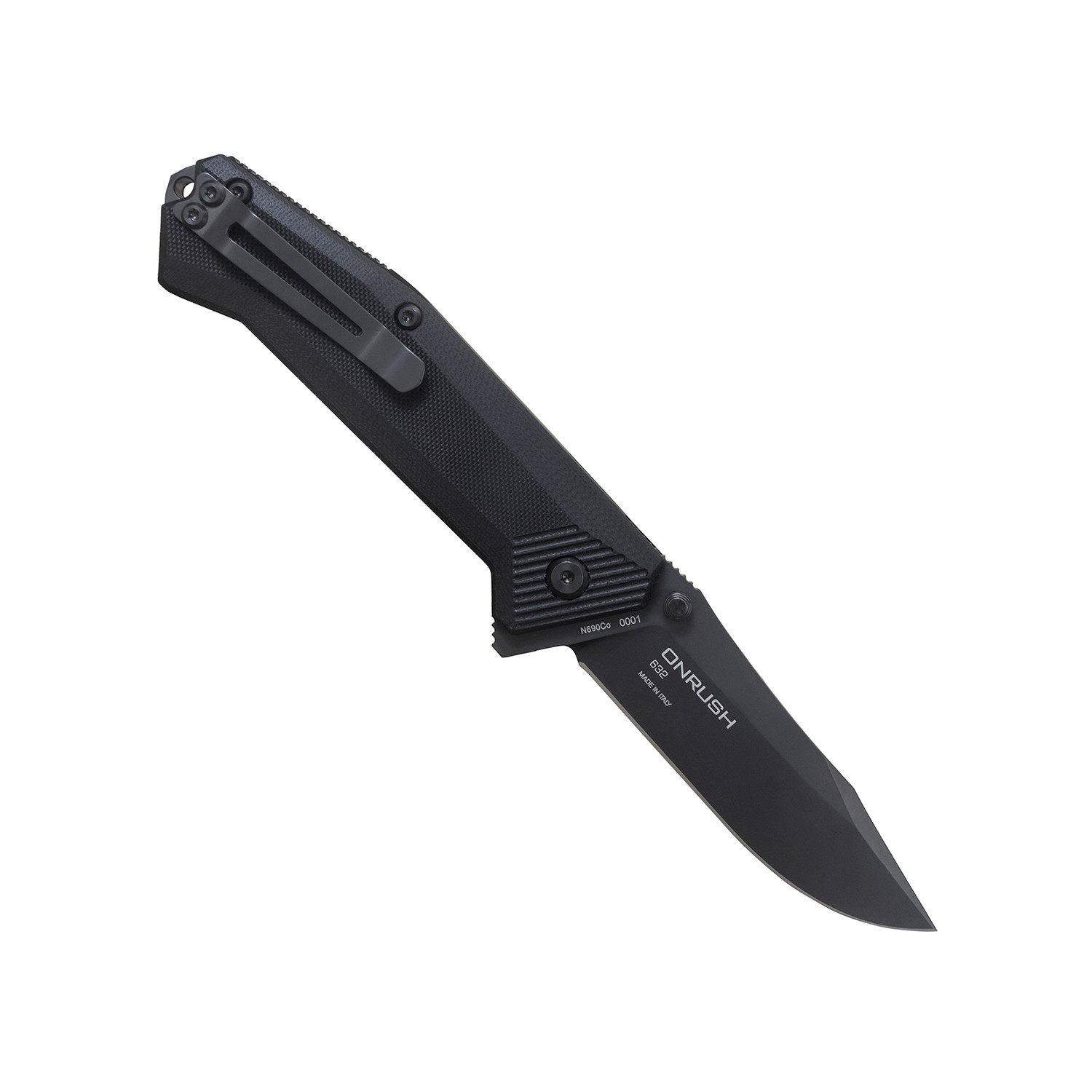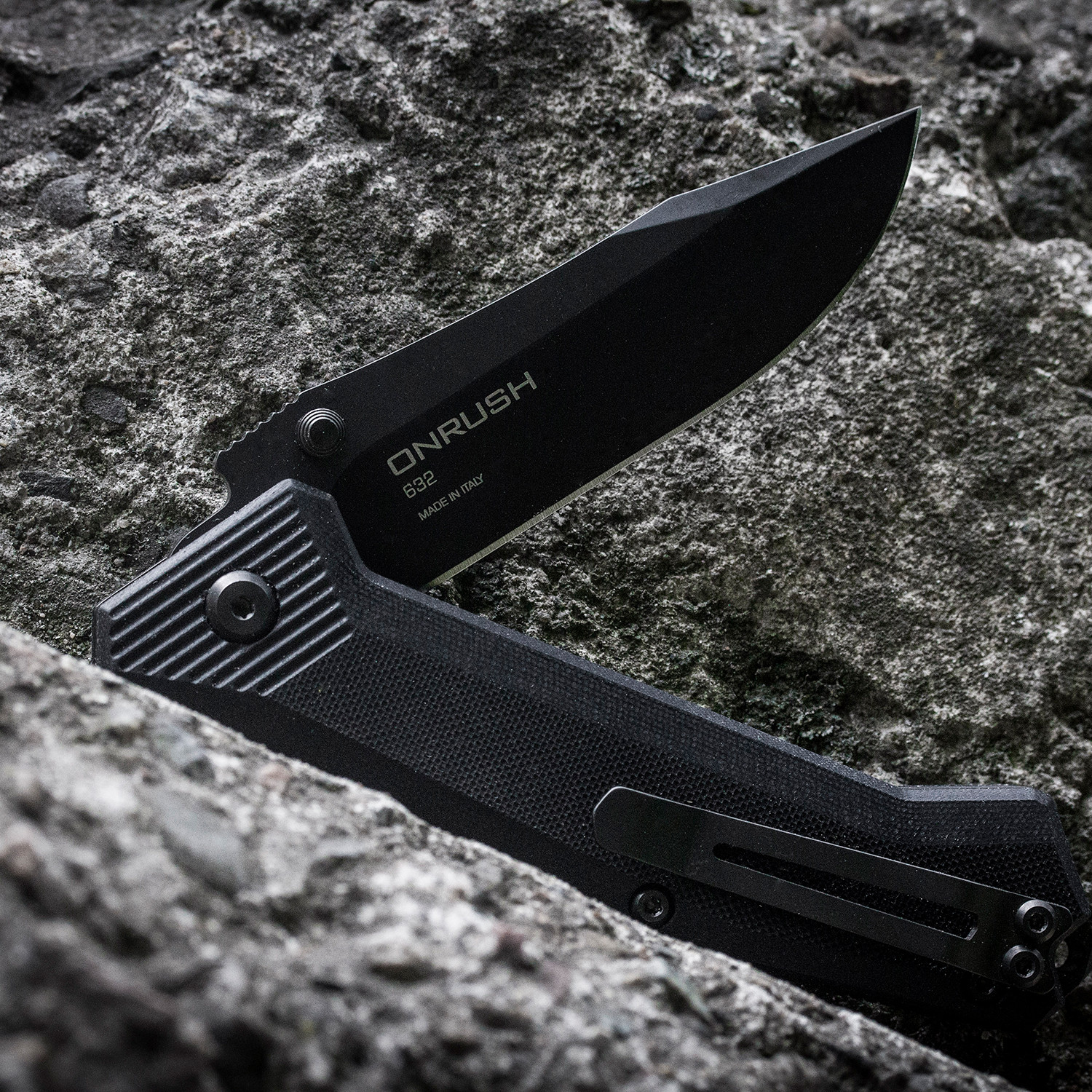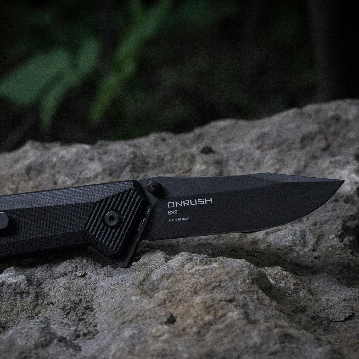The Onrush is a capable tactical folder, for whatever tasks lie ahead. The N690Co blade has been treated with a PVD coating for excellent wear and corrosion resistance. The smooth yet slip-resistant G10 handle is comfortable and provides a secure grip.