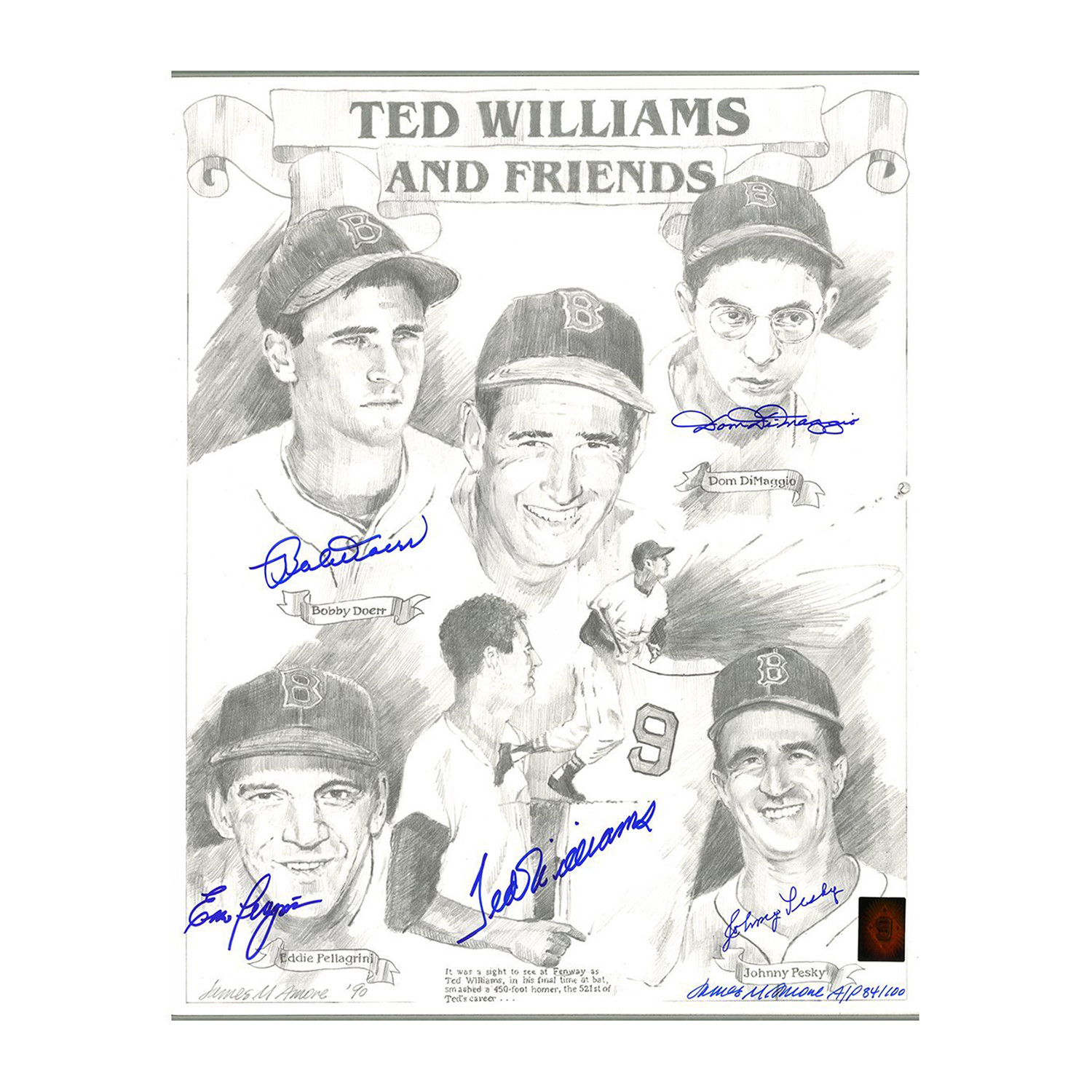 — Hand Signed By Bobby Doerr, Dom DiMaggio, Eddie Pellagrini, Johnny Pesky, + Ted Williams