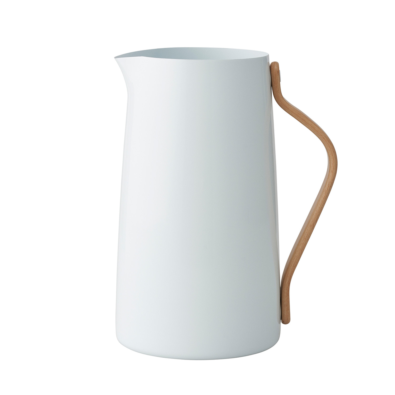 The Emma Pitcher is made of stainless steel with a coated beechwood handle, calling to mind the classic Danish steel pitchers of the 1950s. It's reinterpreted for today with a unique sculptural and classic design.