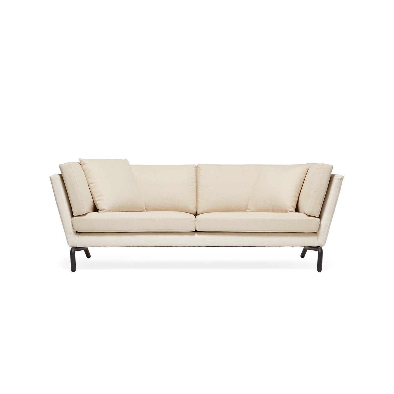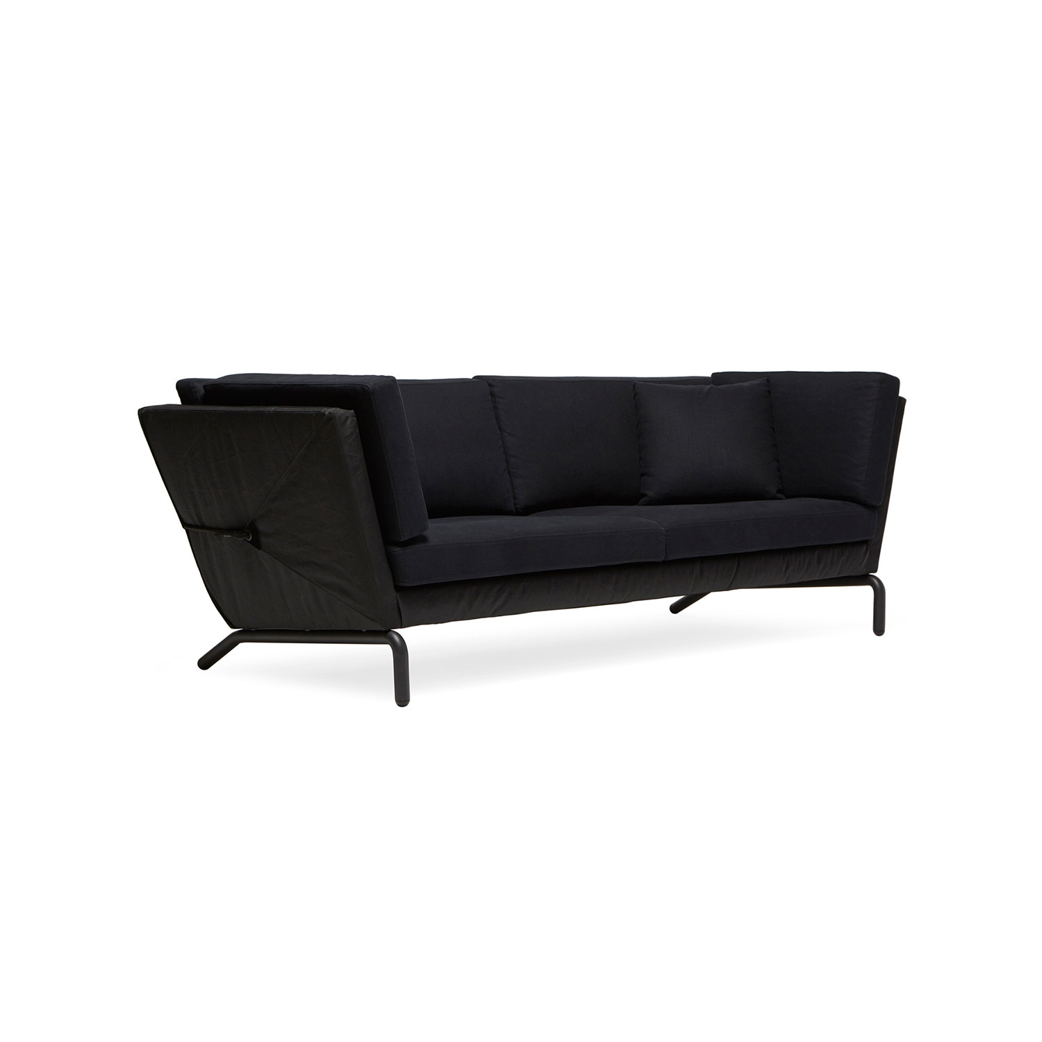 Inspired by the ethos and materials of ocean sailing, the Bowline Sofa is a rich piece with a modern aesthetic. The upholstery is made from washed sailcloth - the kind of fabric used to make boat sails - on the exterior, and a soft canvas on the seats and side cushions, for an incredibly unique and nautically-inspired furniture centerpiece.