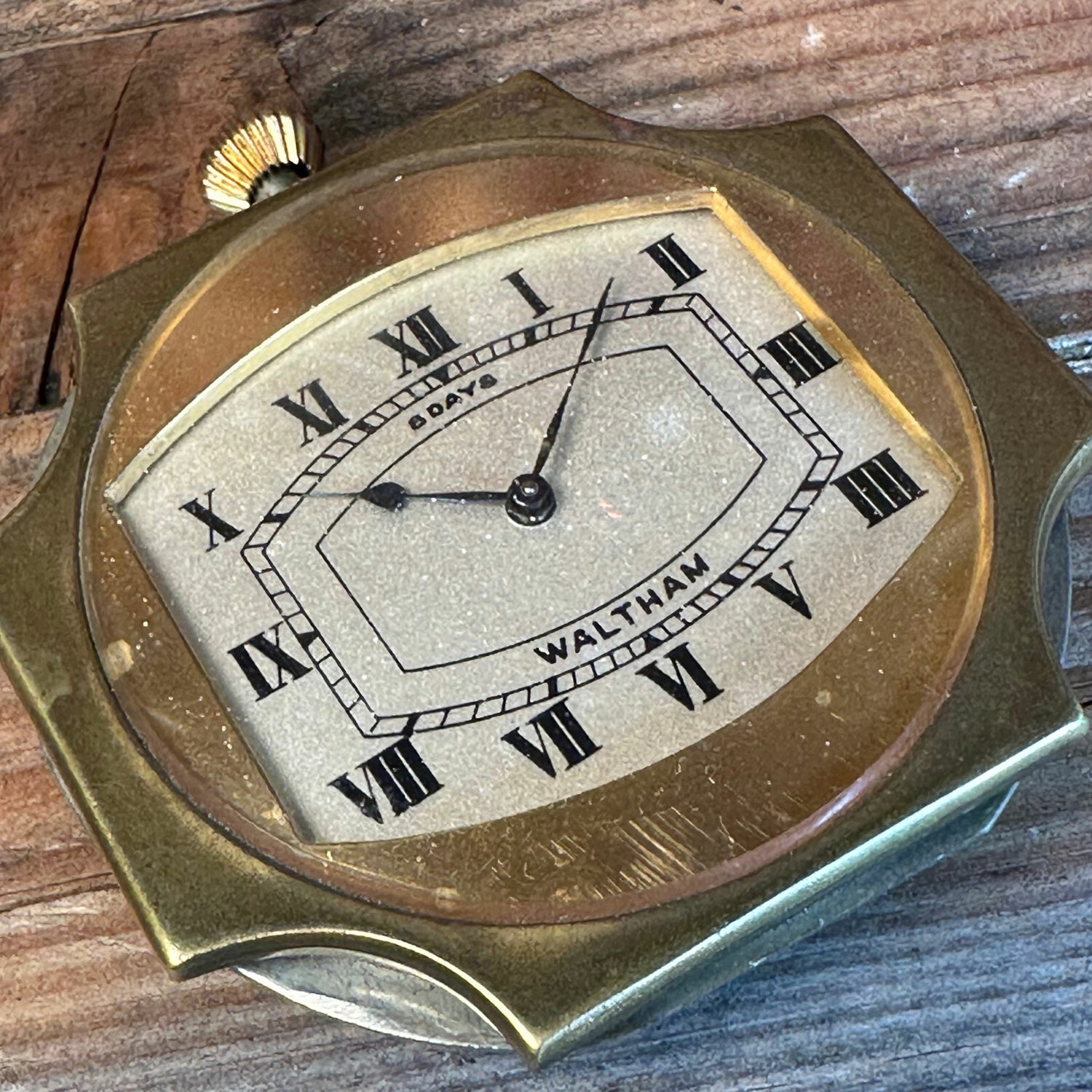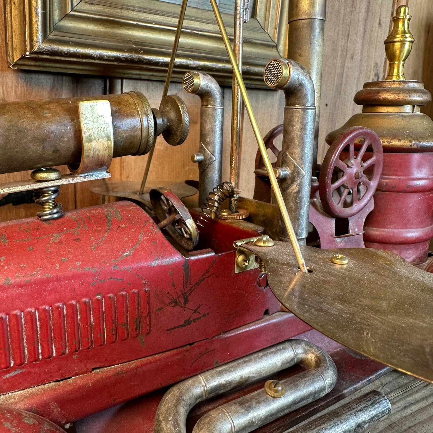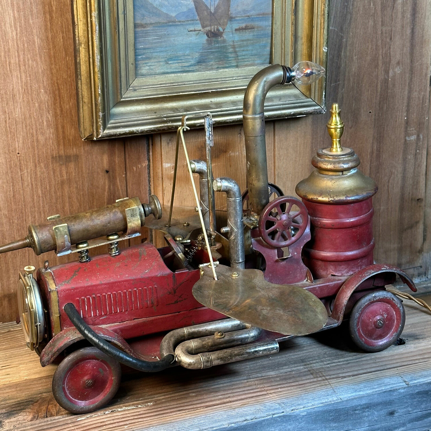 The Flyer Truck is a one of a kind table clock made from a 1930’s metal toy firetruck, brass wings from1920’s desk fan blades, trumpet parts, and a removable circa 1920’s Waltham mechanical travel clock. The clock is hand wound and is accurate considering it is nearly 100 years old. The cloth covered cord provides power to the flickering flame light.