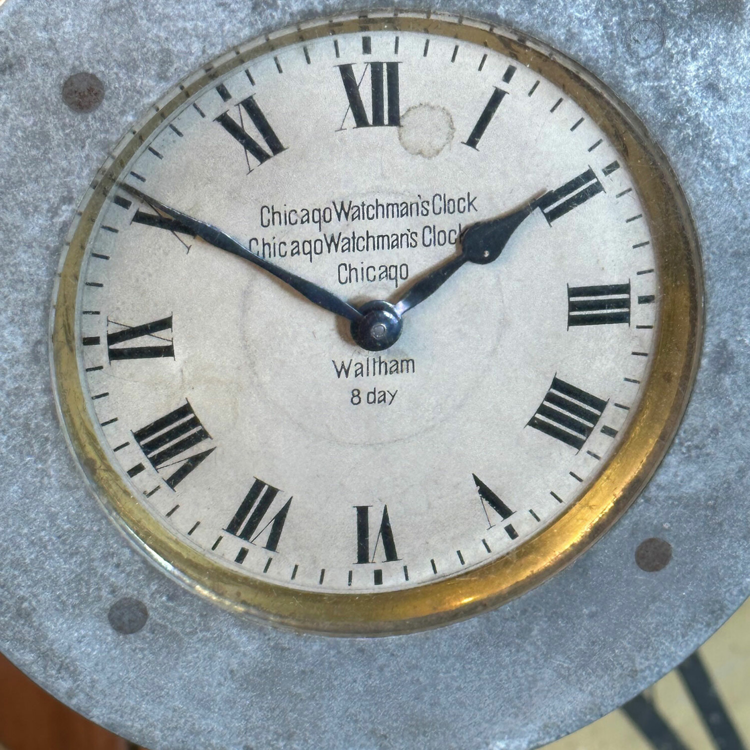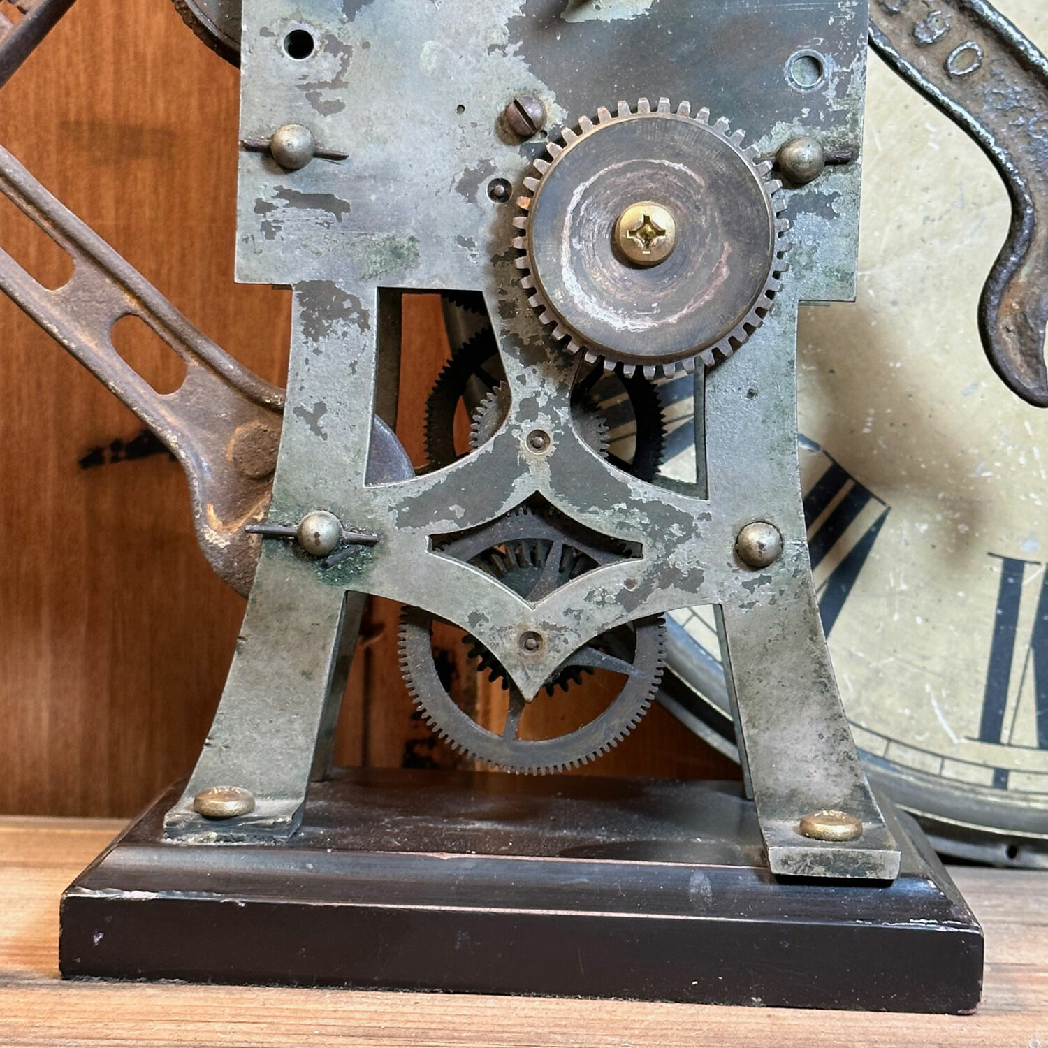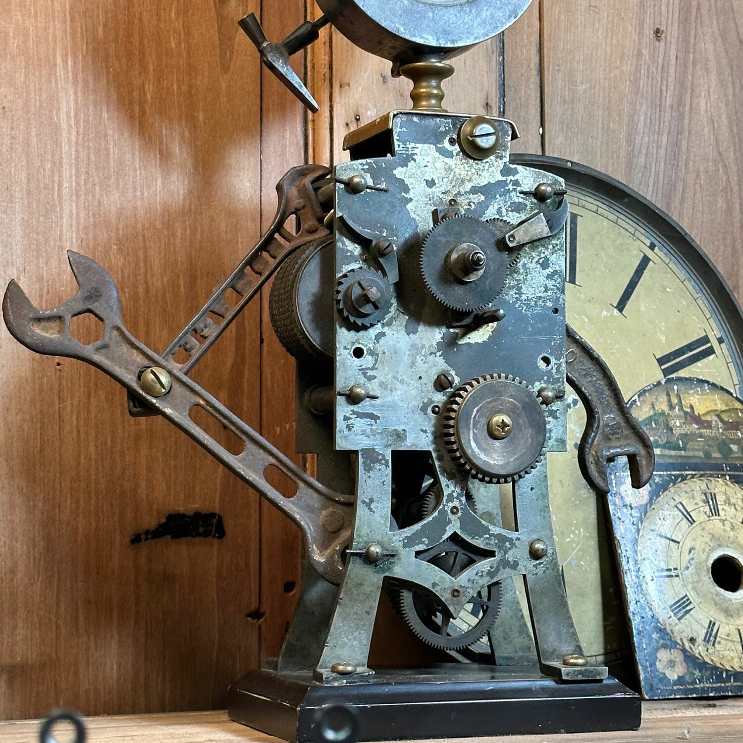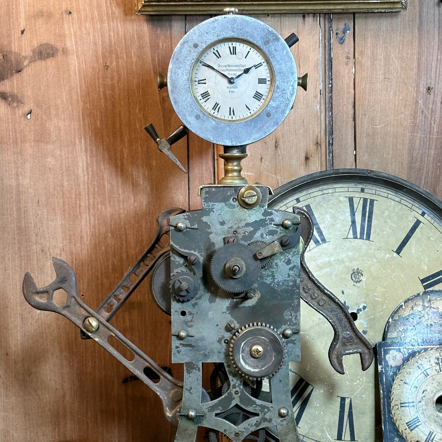 Mr. Meccano is a one of a kind large hand made table clock made from a vintage 1910 British factory clock movement, a circa 1940’s watchman’s clock, jewelers hammer, and antique wrenches. The clock is hand wound and when wound up the little jewelers hammer slowly circles around the clock.
