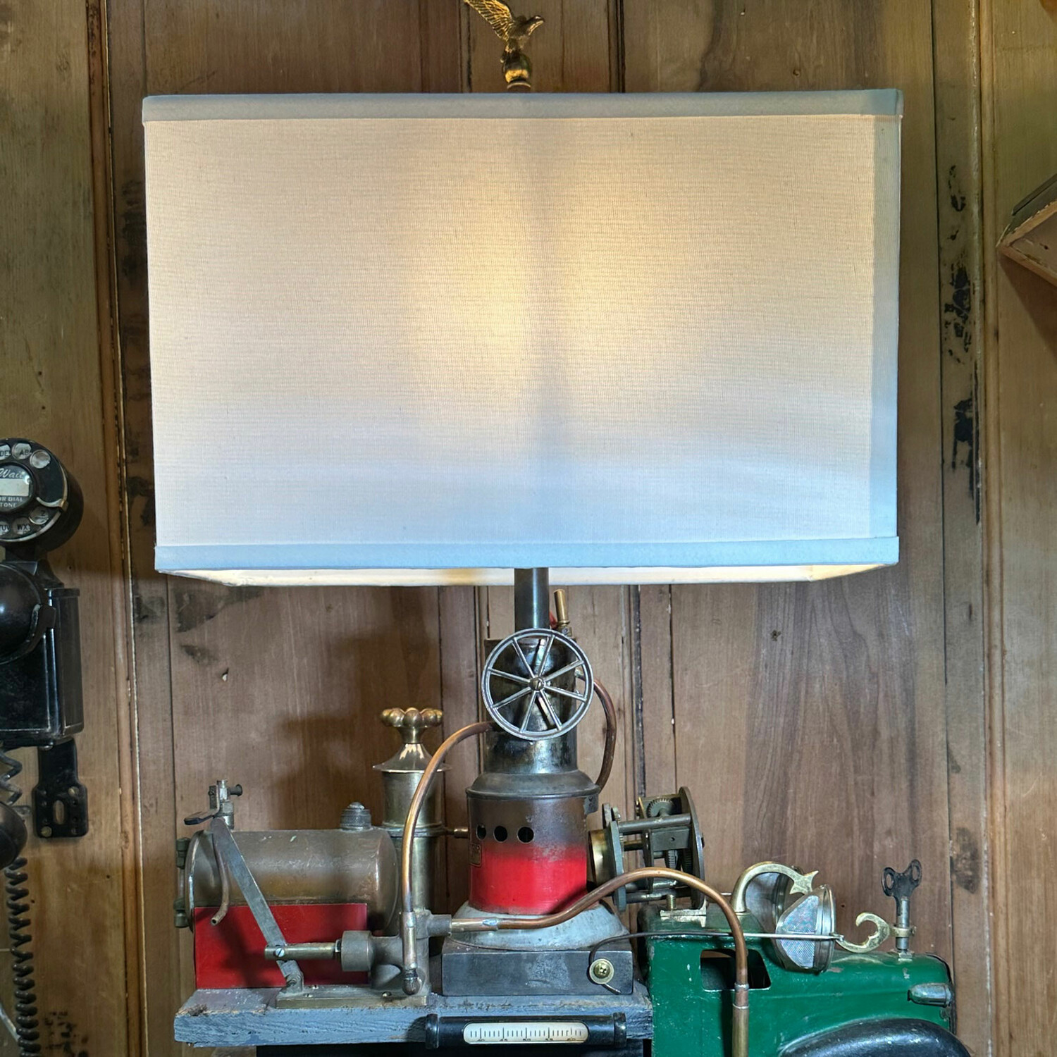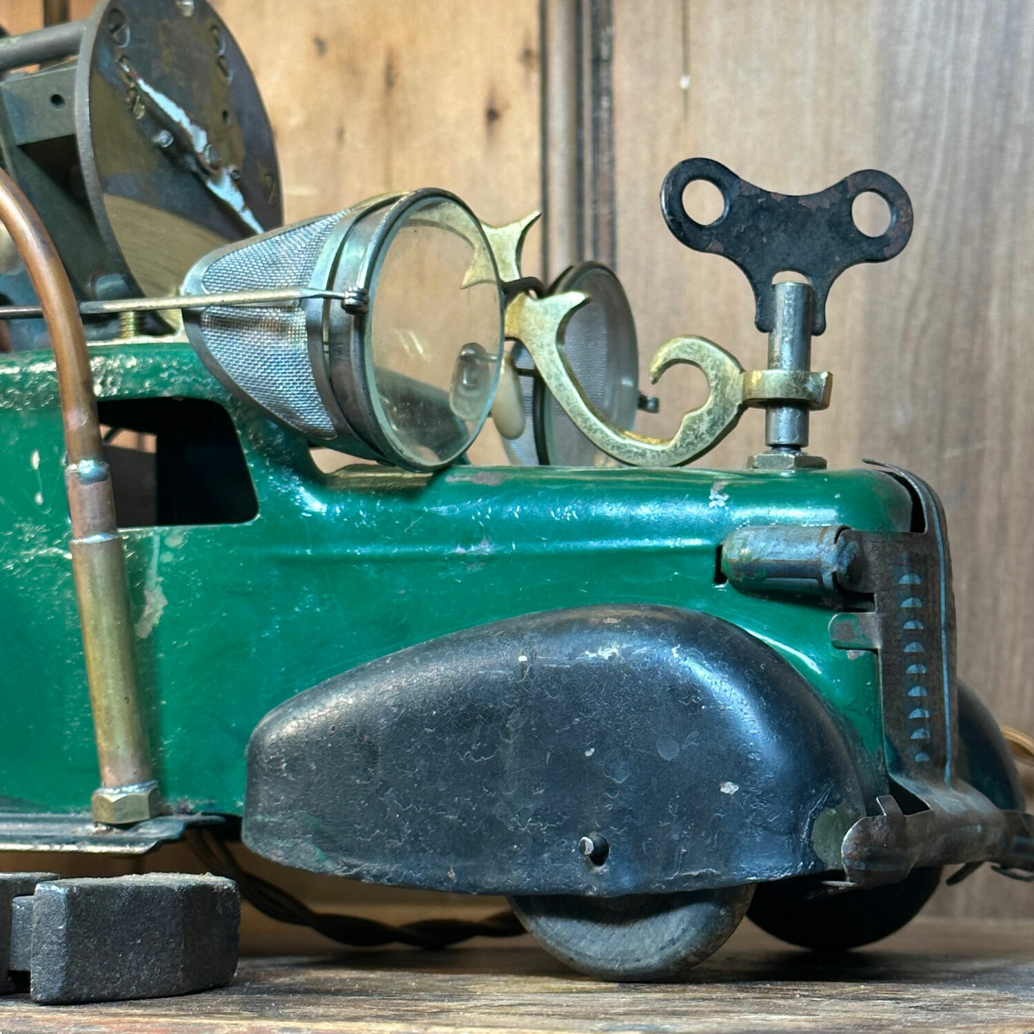 The Steamer Truck is a one of a kind hand made lamp, constructed from a vintage 1930’s steel toy truck, circa 1910 toy steam engine parts, mechanical component from a nautical instrument, miscellaneous parts. The on-off switch is the clock key located on the top of the truck radiator.