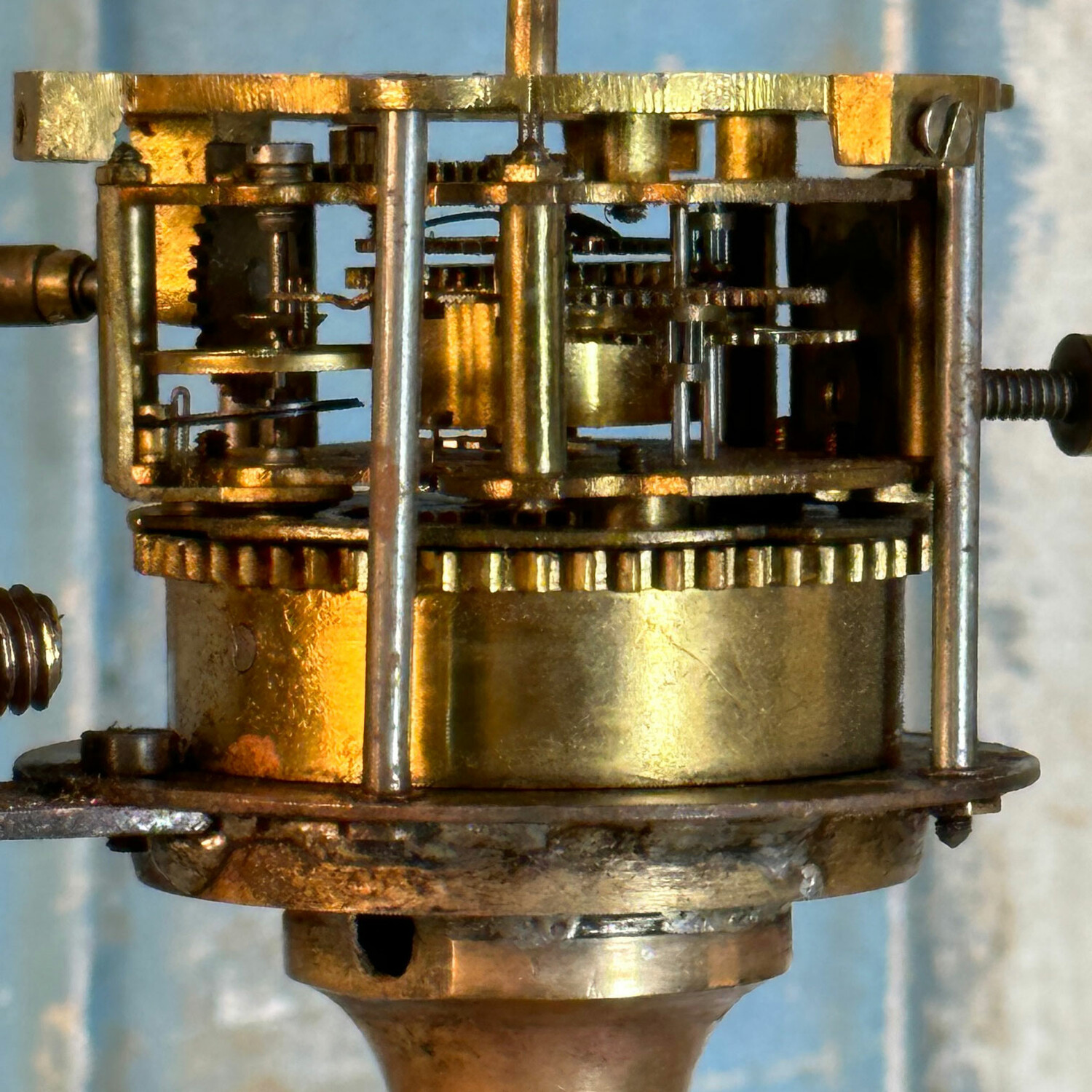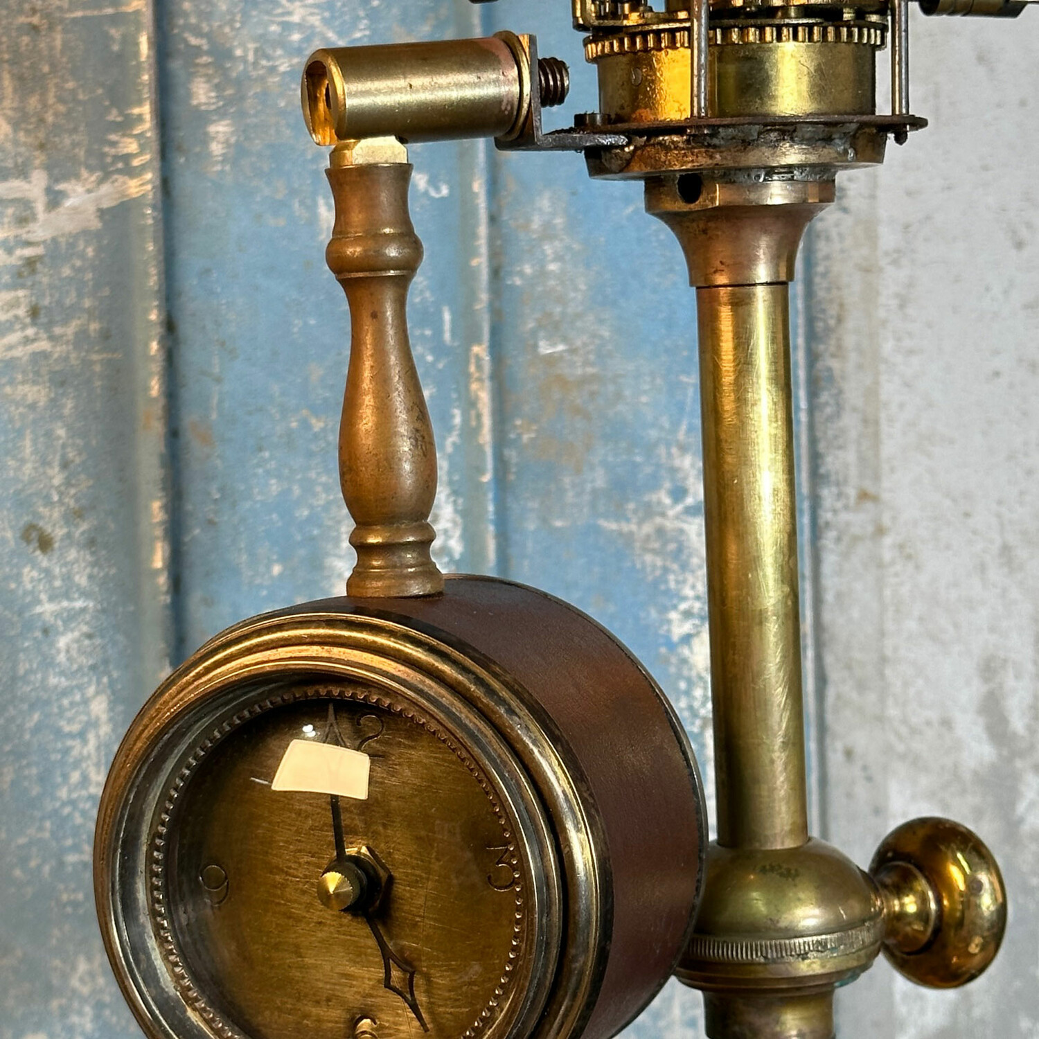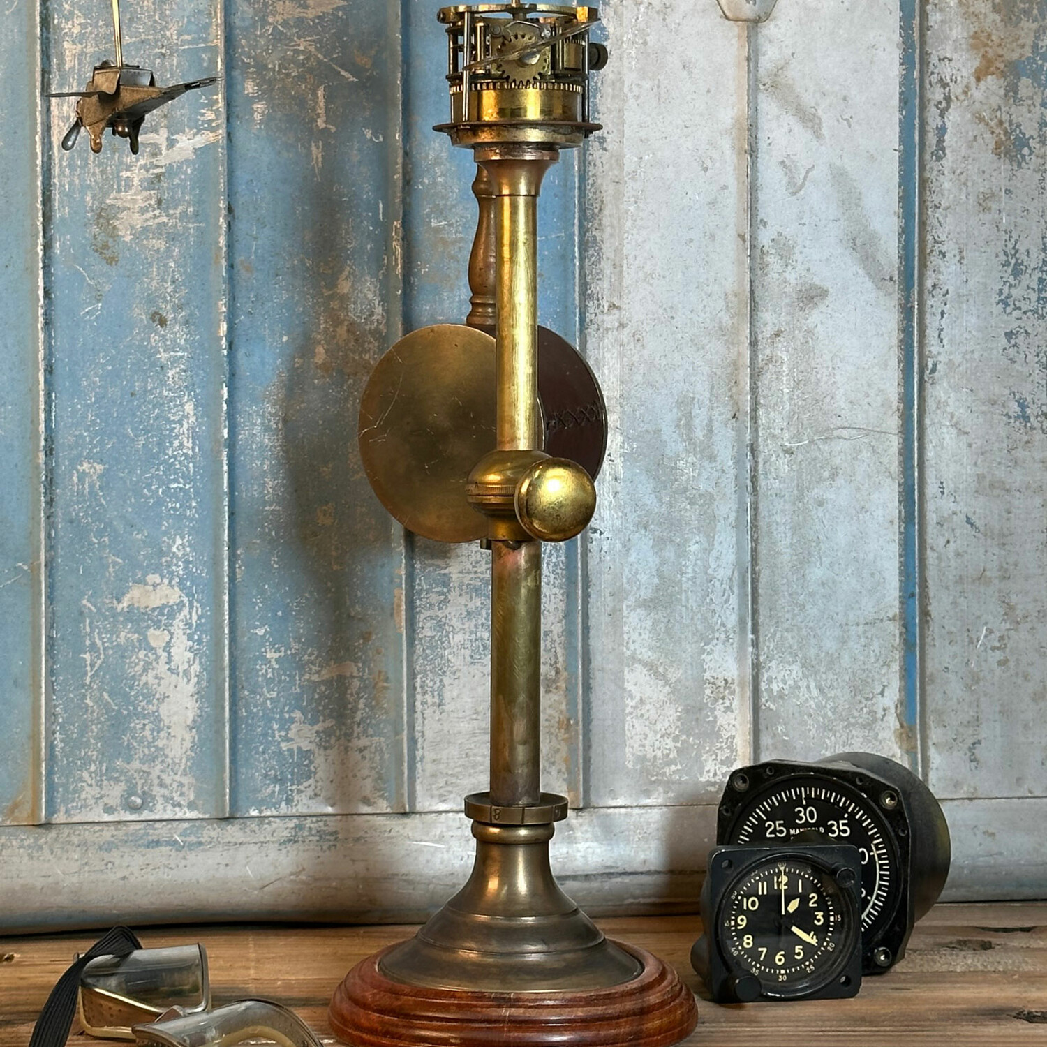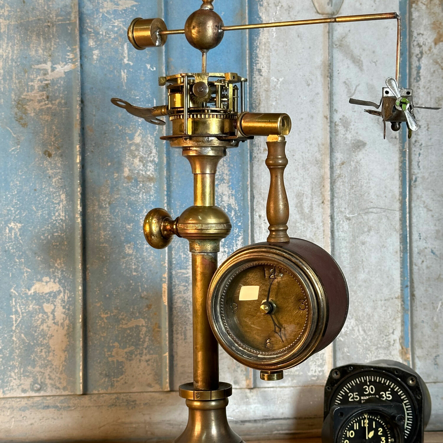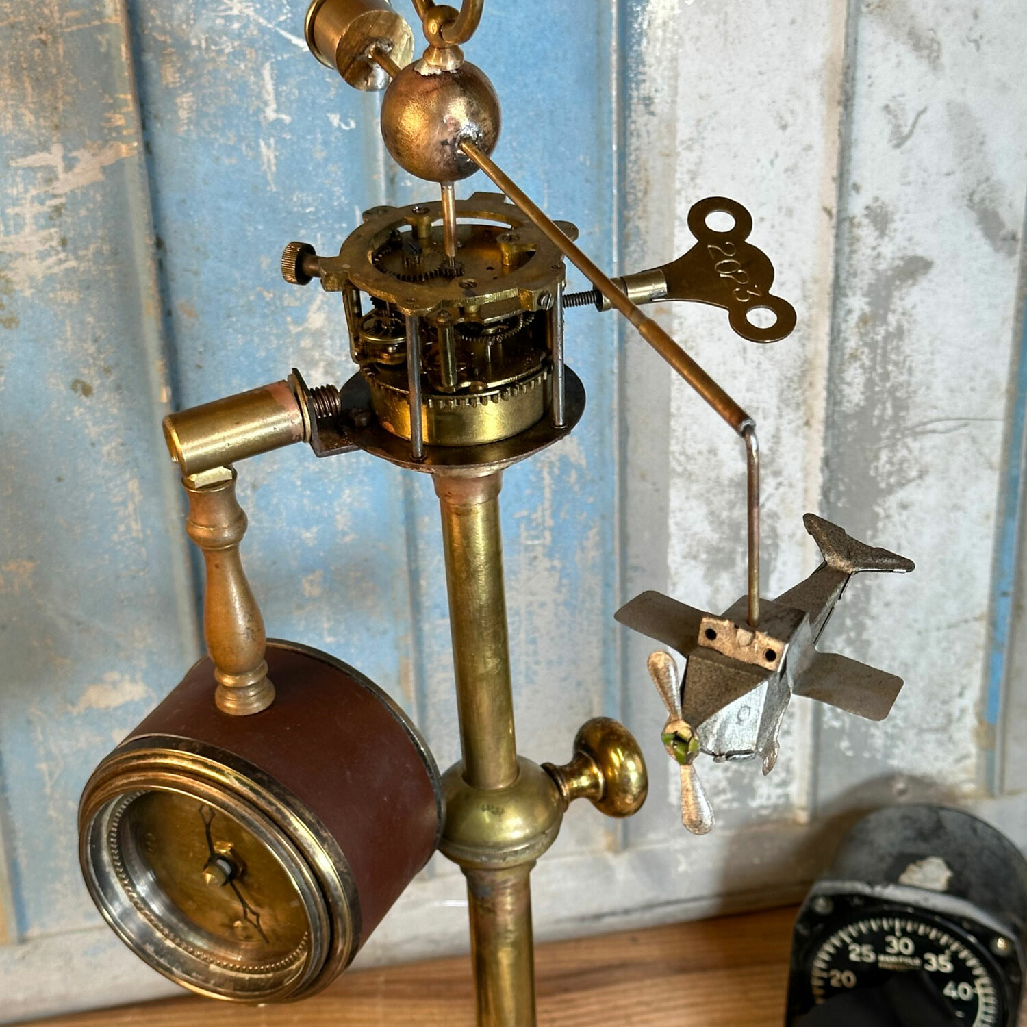 The Tempus Fugit is a one of a kind table clock made from antique microscope parts, a running 1930’s alarm clock movement, a leather covered brass table clock case, a 1930’s German tin toy airplane, miscellaneous parts. The clock used for telling the time is operated on one AA battery. The airplane circles the assembly every hour, as long as the mechanical movement is wound up.