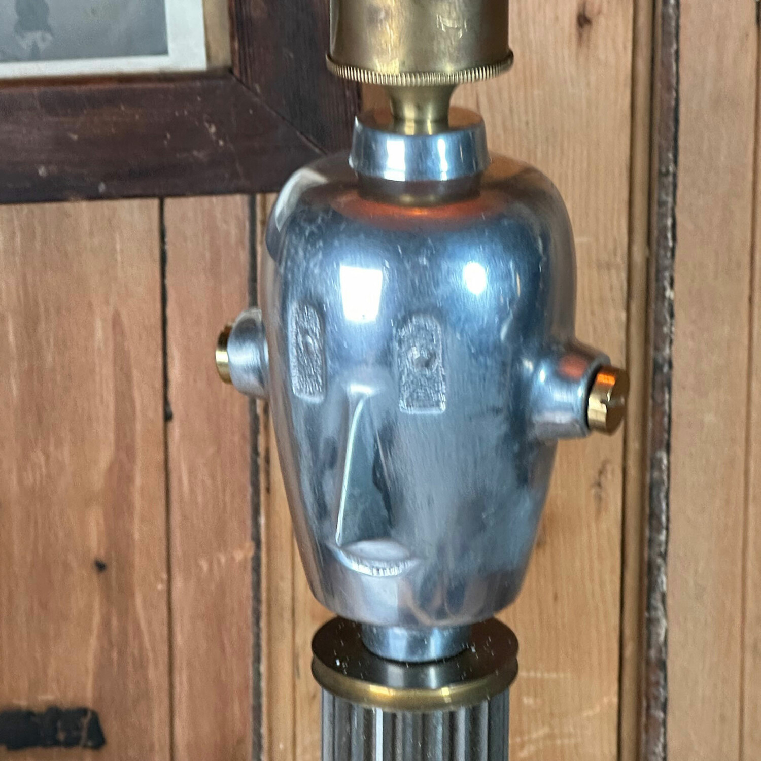 The Tin Man is a one of a kind handmade table lamp. Made from antique and vintage parts including a silver plated brass stand, machine gears, vintage 1920’s tin lamp shade, and vintage unknown origin cast aluminum robot head.