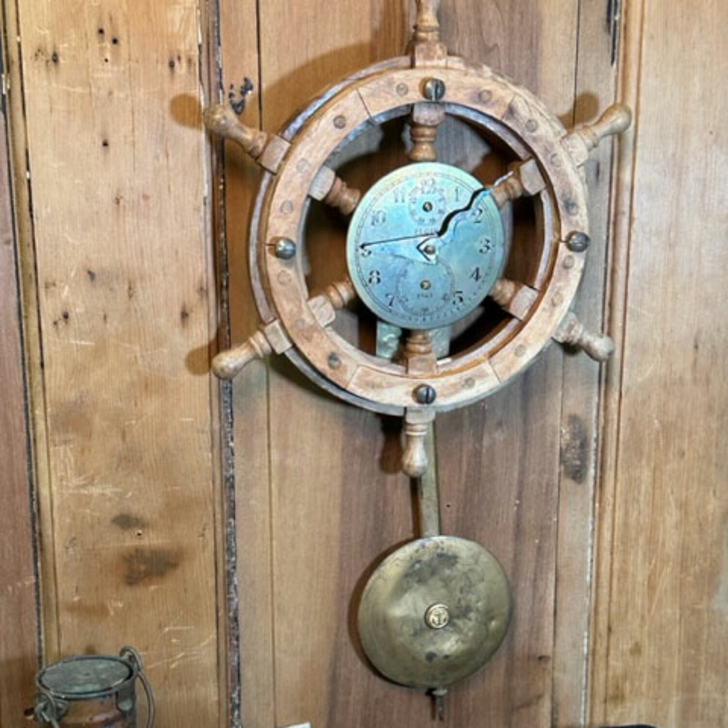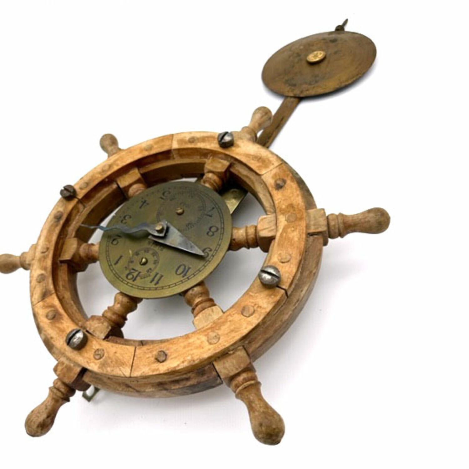 The Torpedo Man is a one of a kind hand made wall clock. Made from an actual small boat wheel, US Navy brass chronometer dial dated 1943, button from US Navy coat, 1930’s machine screws, miscellaneous parts. Brass pendulum swings gently.