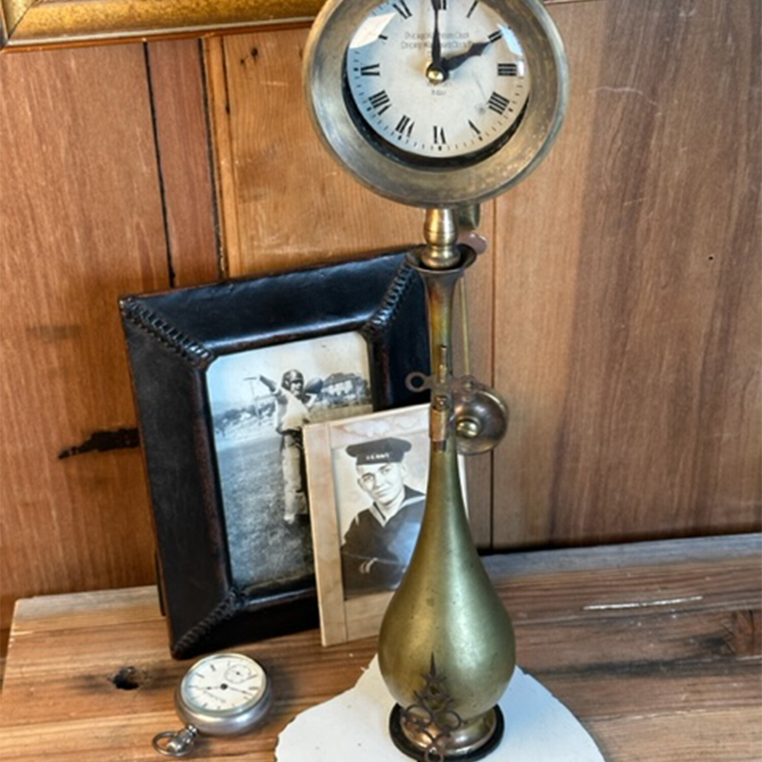 One of a kind pendulum table clock made from vintage and antique parts, including a brass vase circa 1920, brass clock case, vintage clock dial and antique clock key and hand.