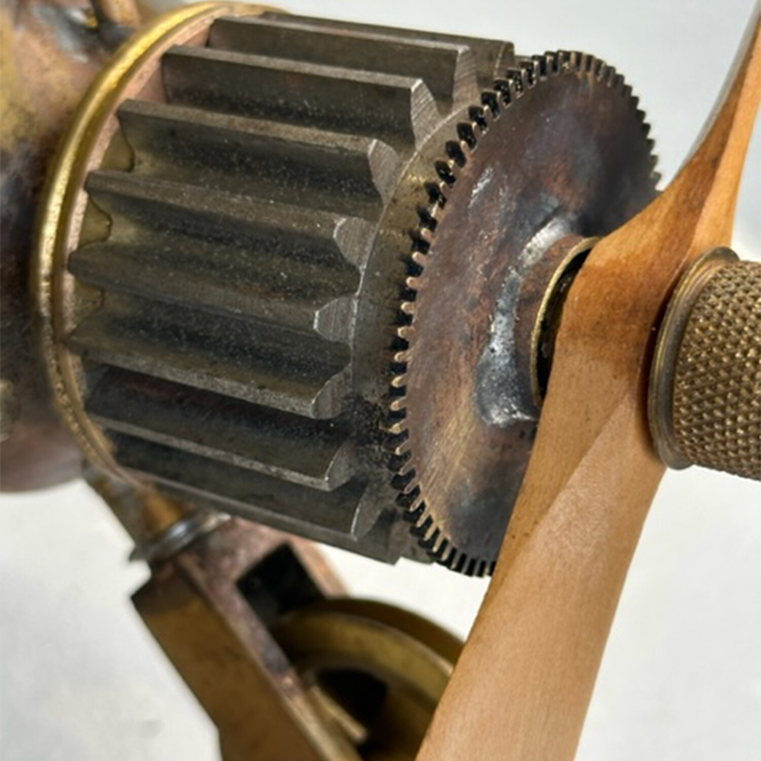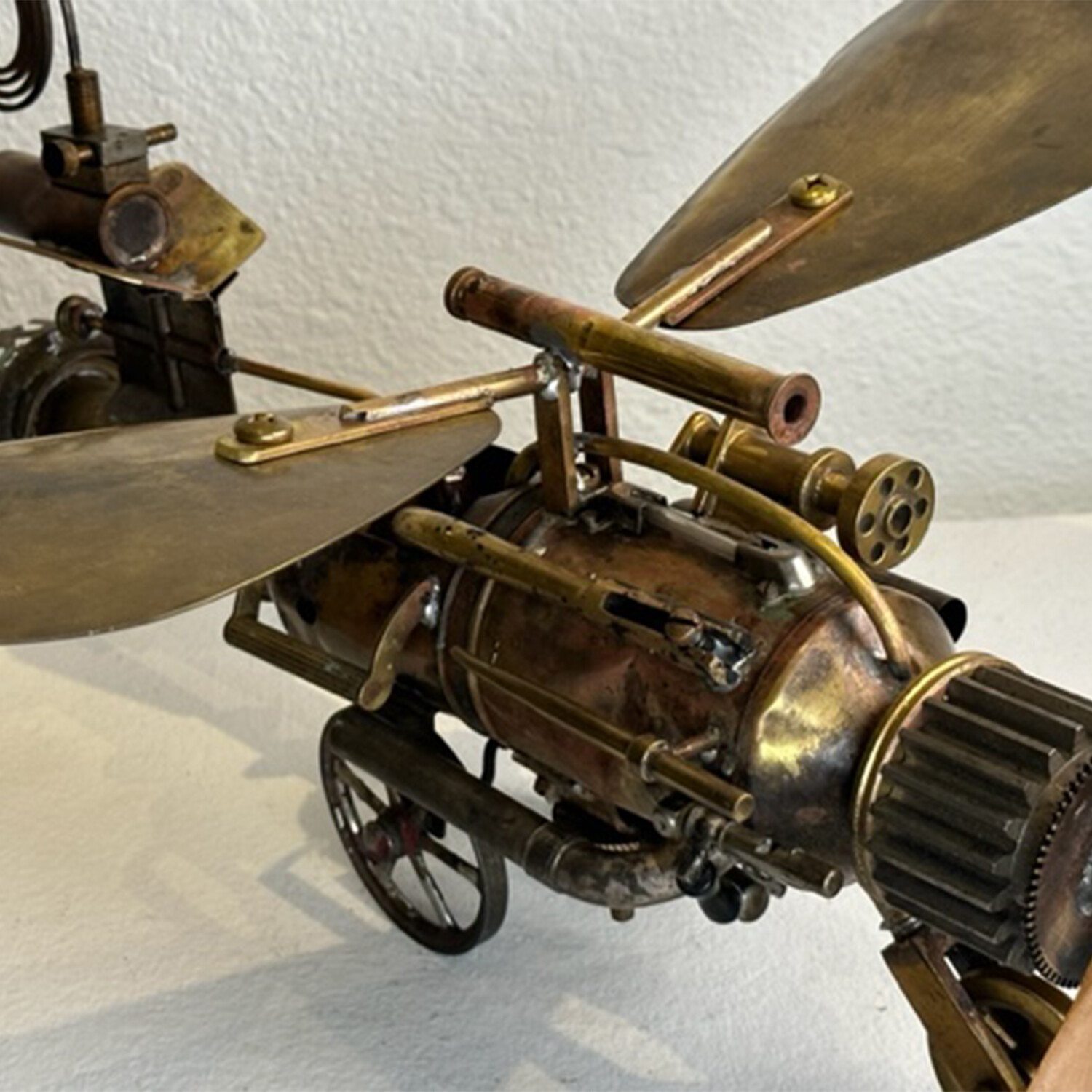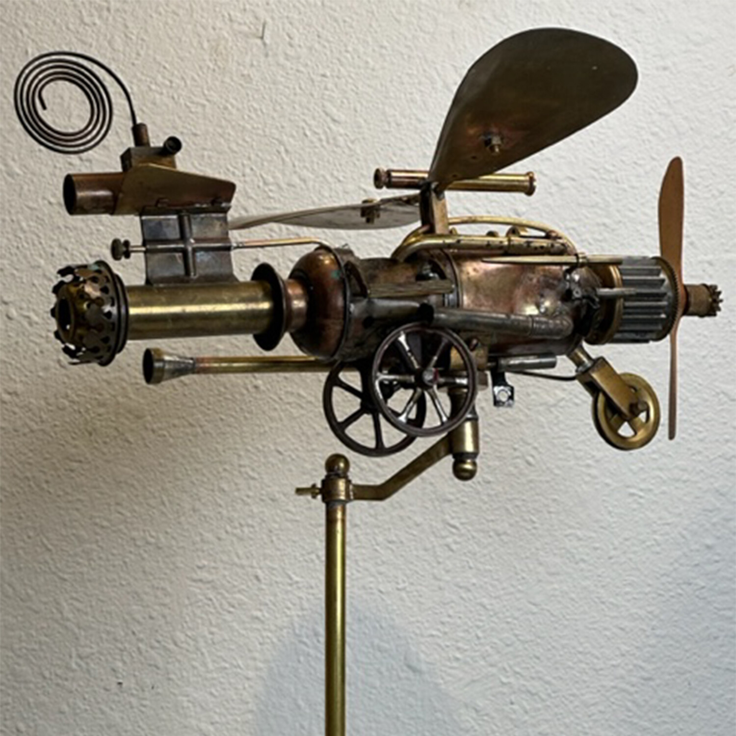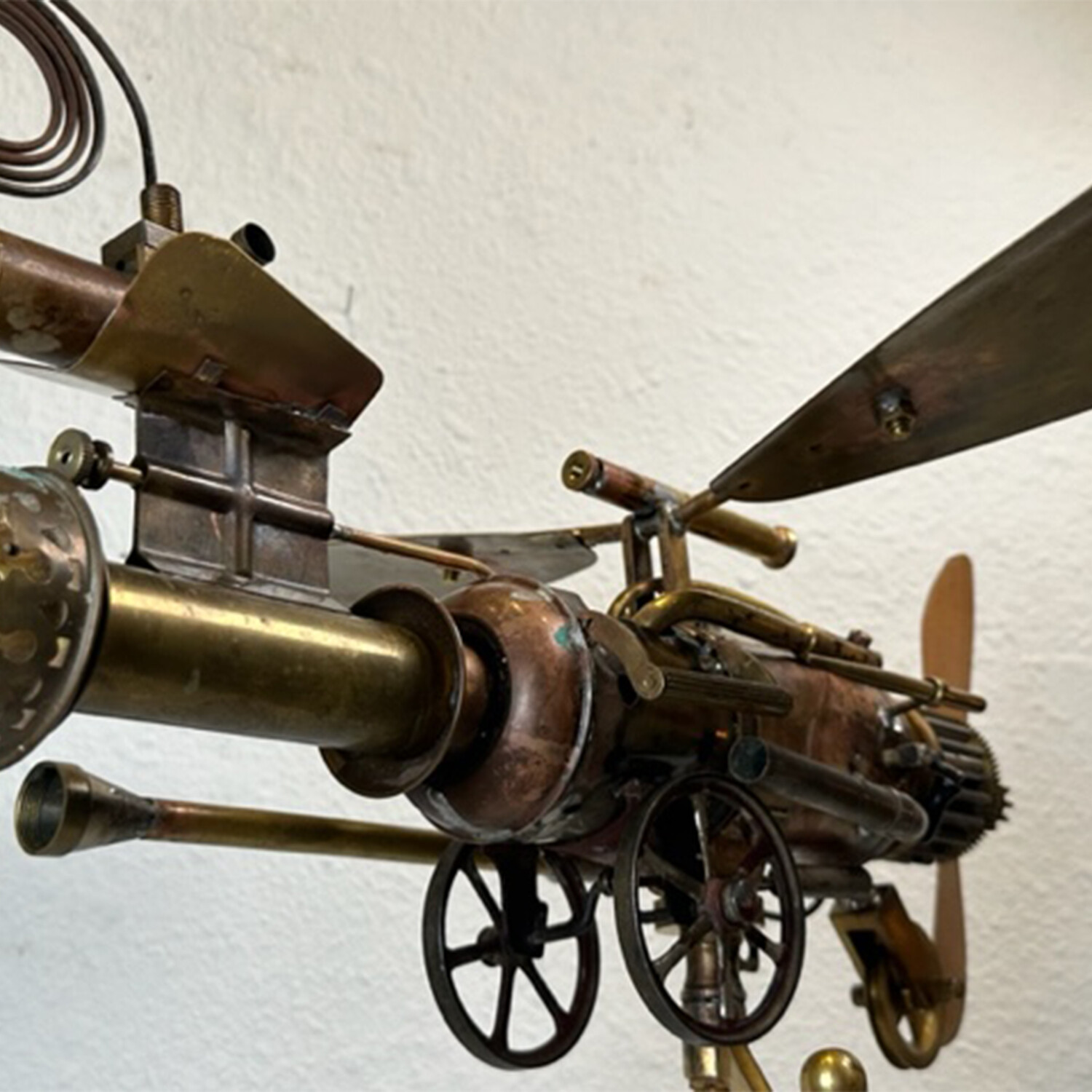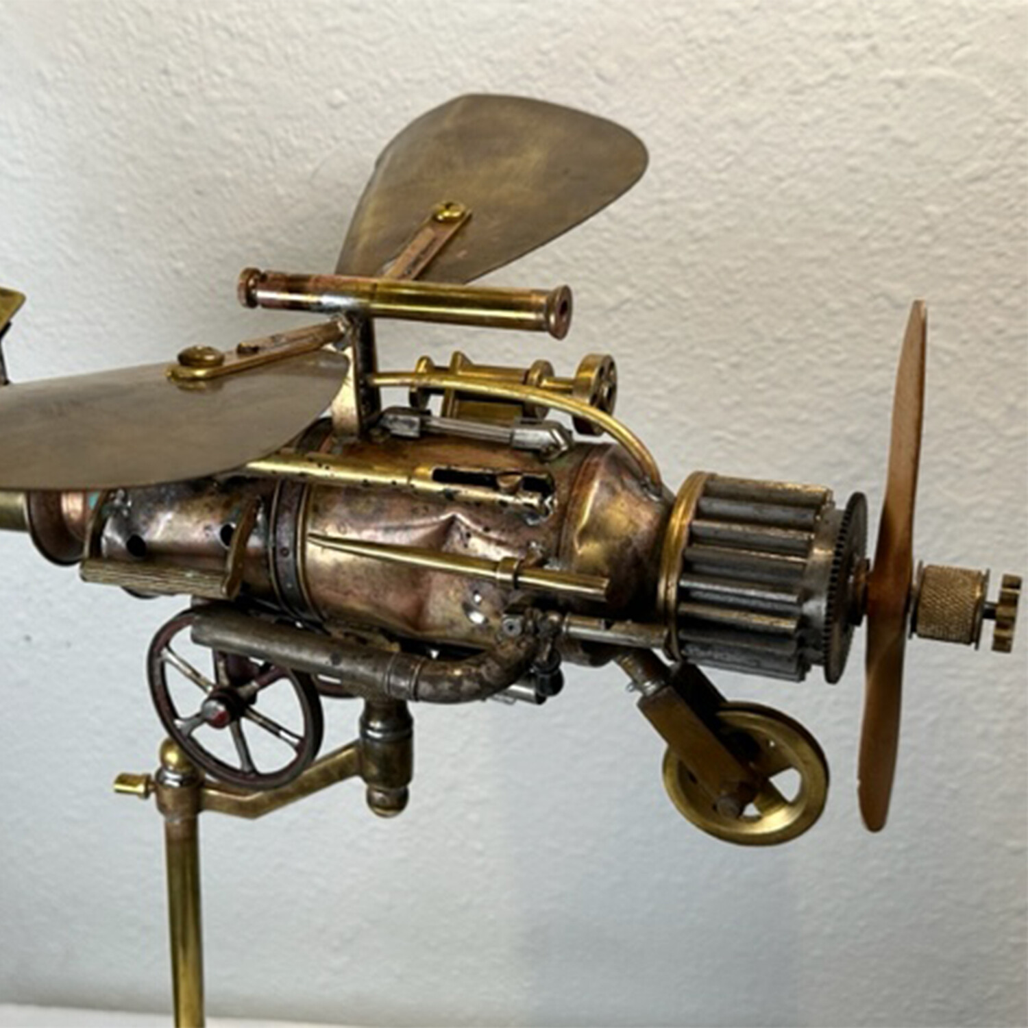 One of a kind sculpture made from all antique and vintage parts, including a circa 1910 toy steam engine, wings from 1920’s fan blades, lamp parts and machine parts. Flying machine can rotate on the base and is removable as well. A heavy base made from a steel gear and brass support from a scientific instrument is included.