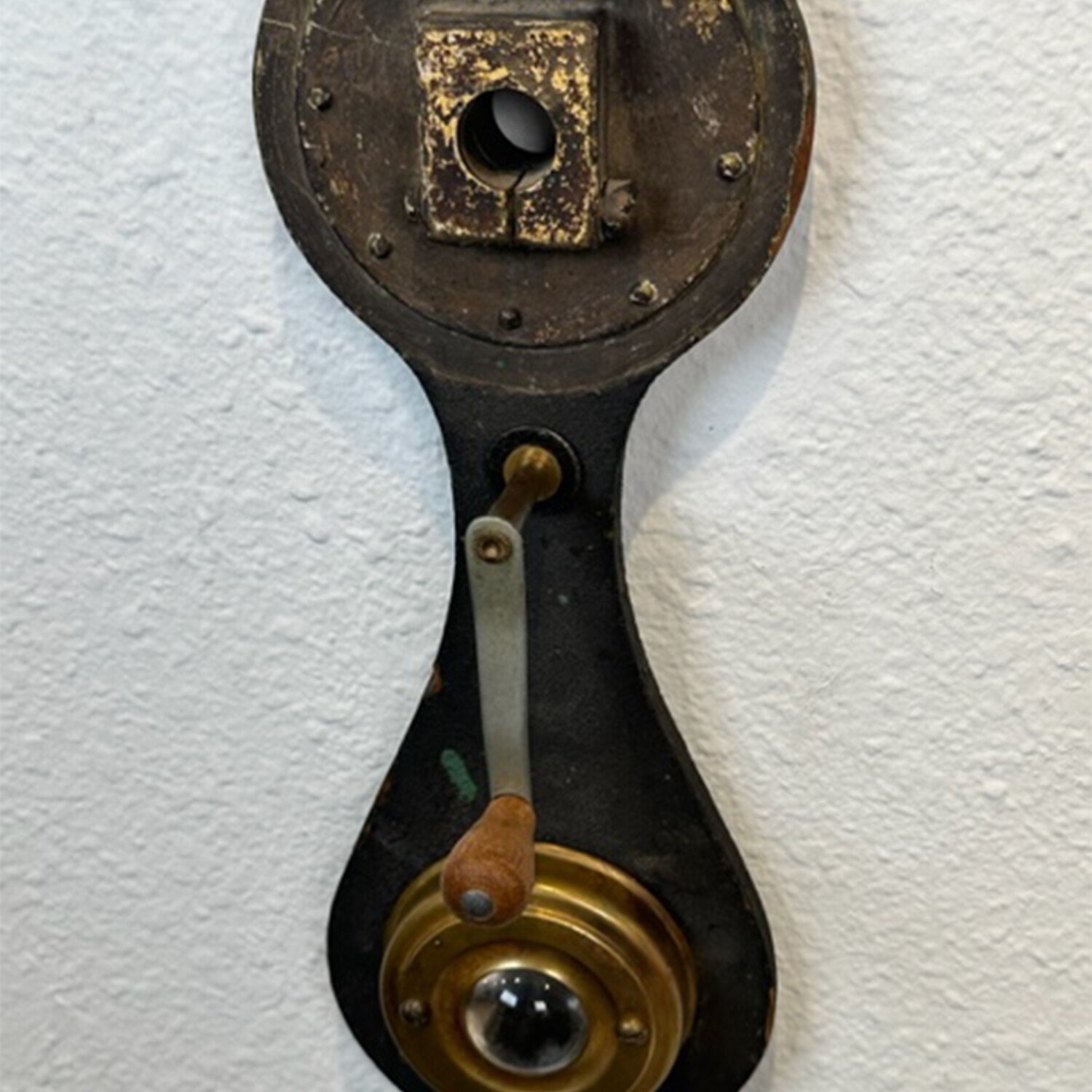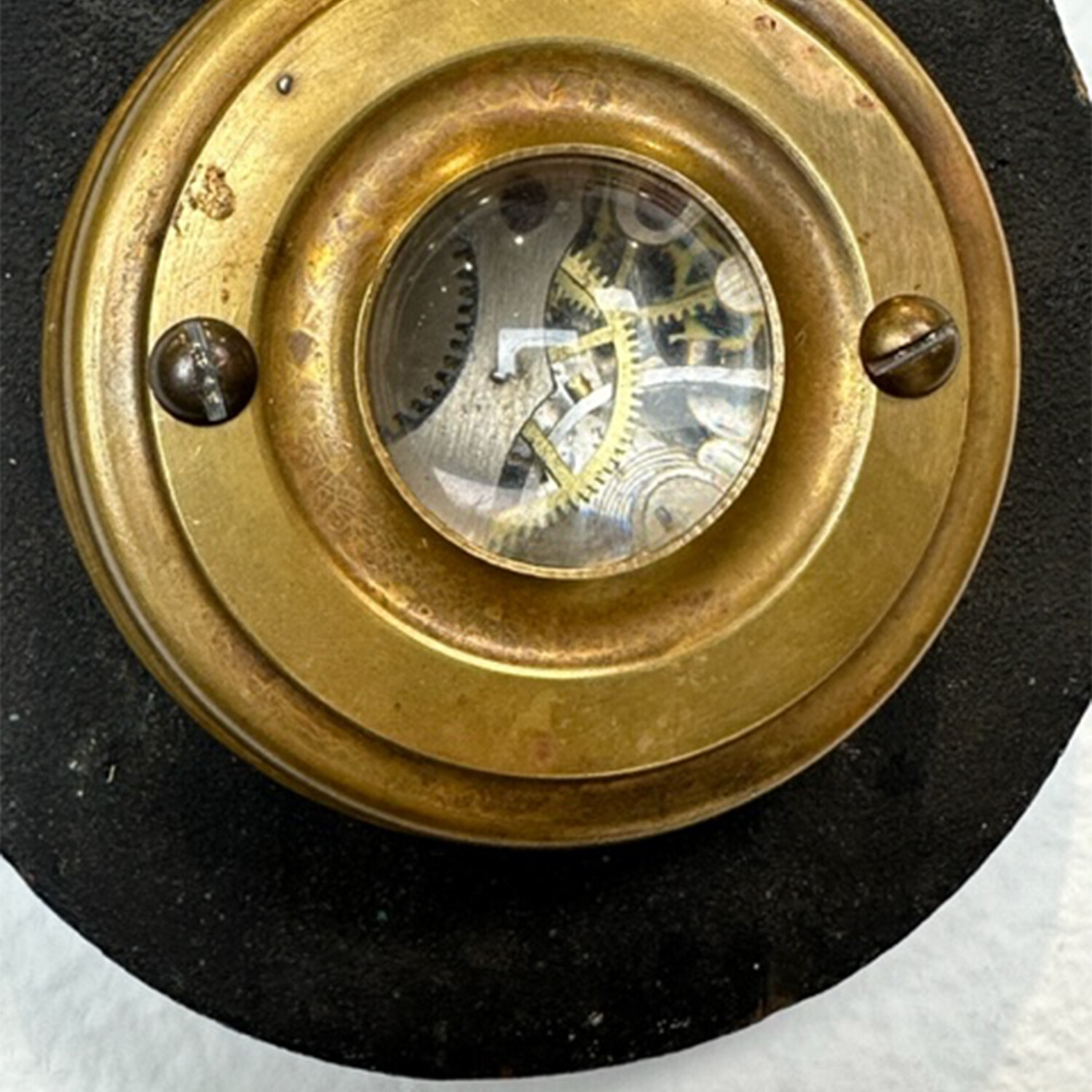 One of a kind wall clock made from a clock hand from a circa 1880’s French tower clock, circa 1910 clock dial, antique pocket watch movement, and wooden gear from a cuckoo clock. The clock operates on one AA battery, included.