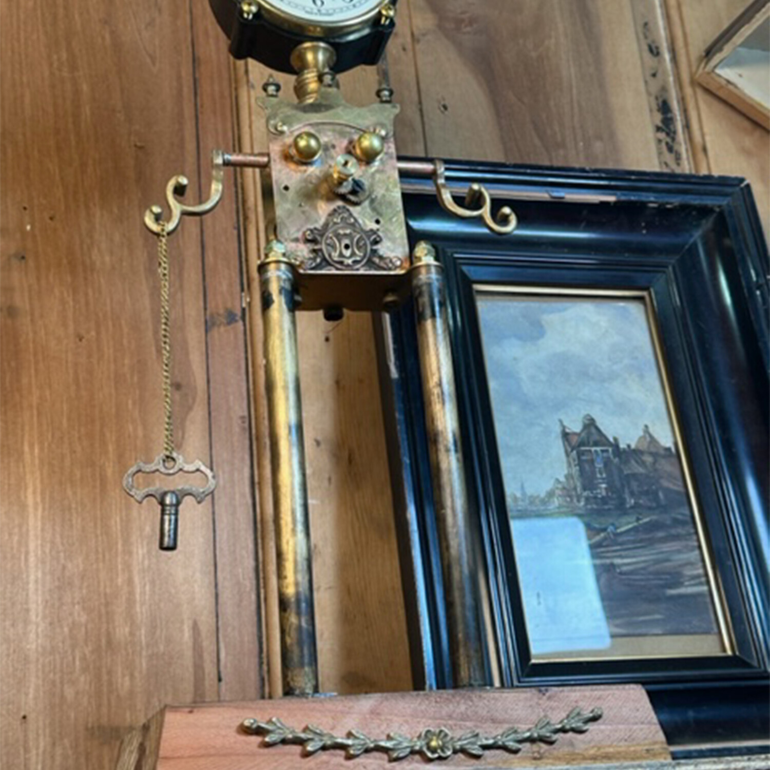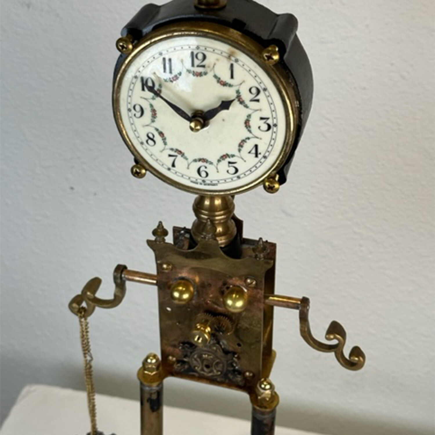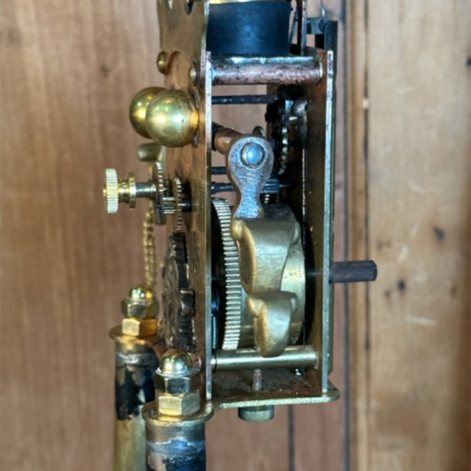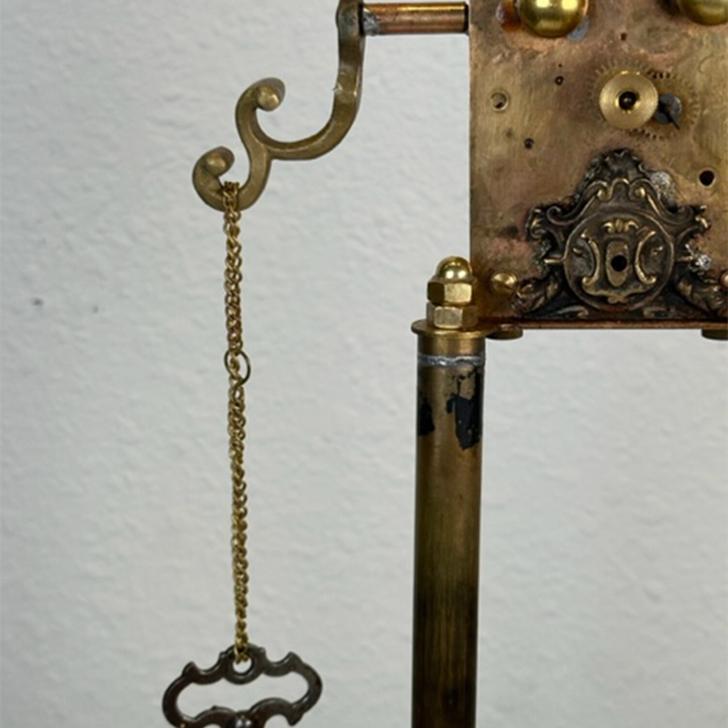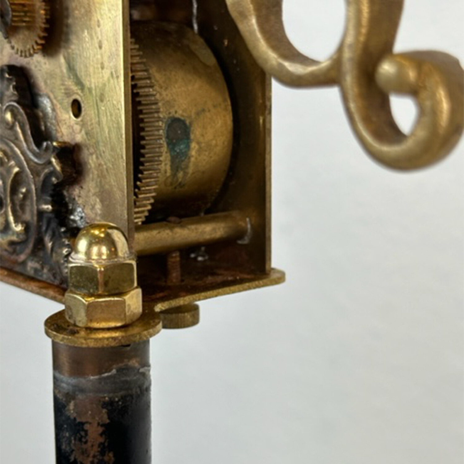 One of a kind clock made from antique and vintage parts, including brass tubes from a scientific instrument, vintage clock movement, antique chandelier parts, 1930’s clock dial. Clock is set on a vintage wooden base.