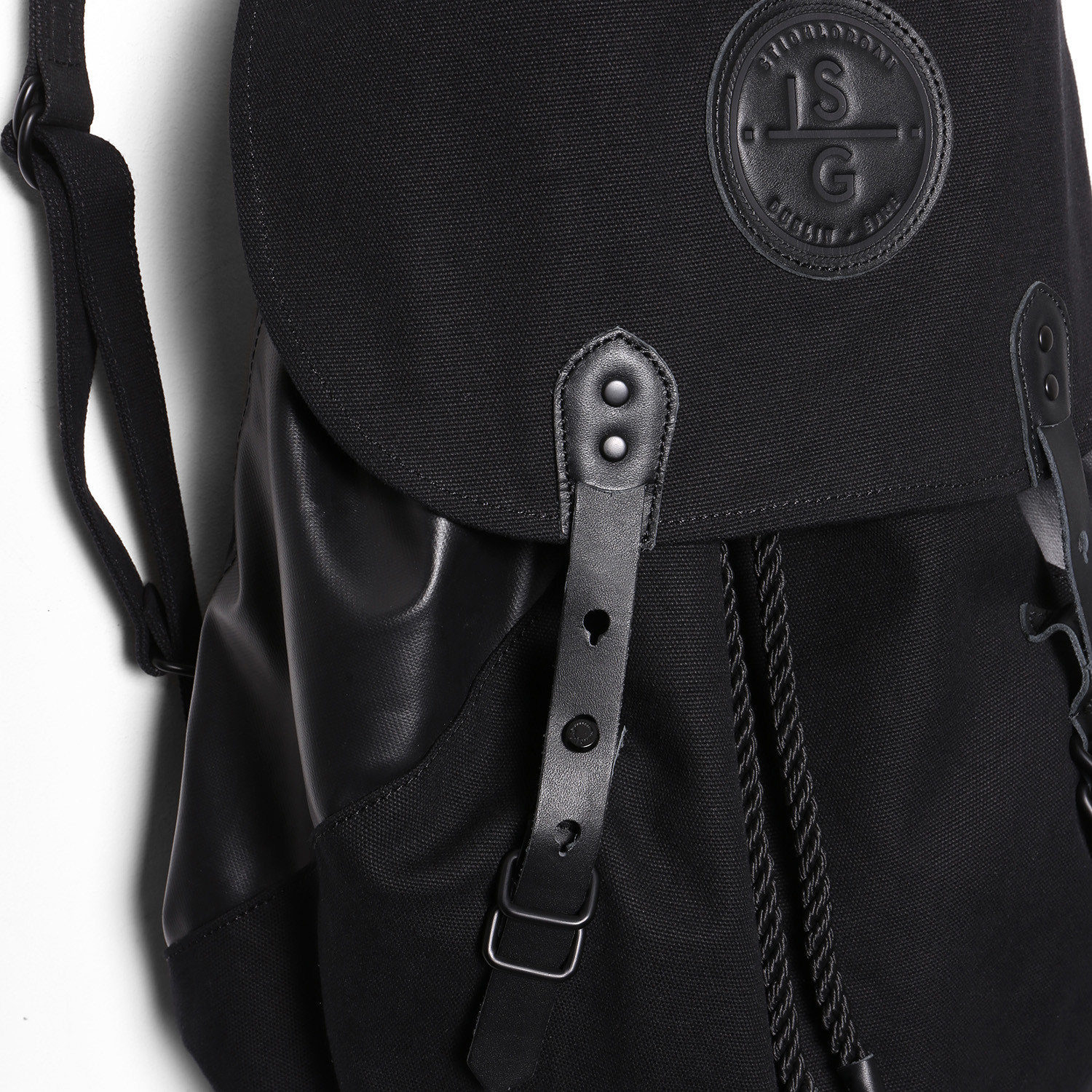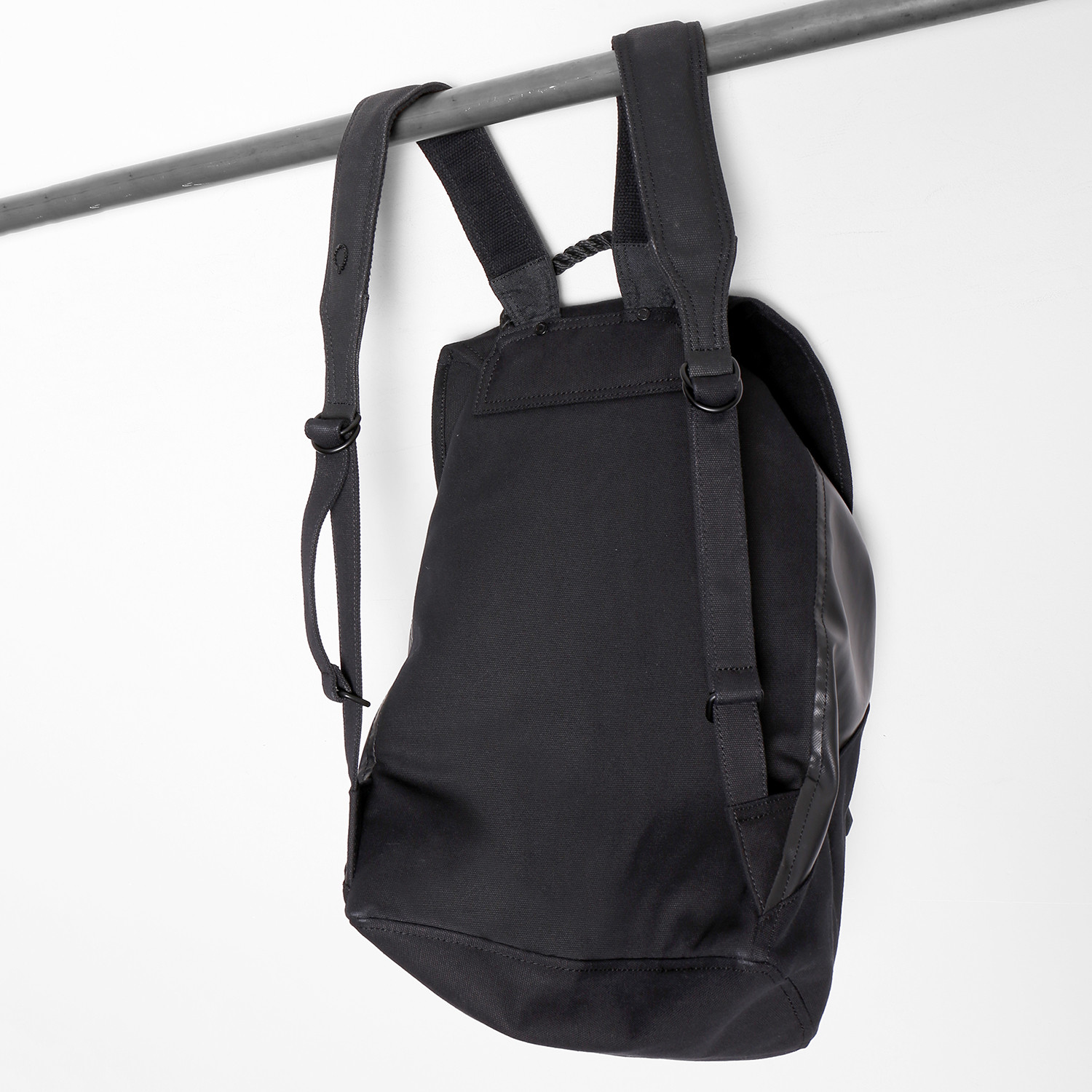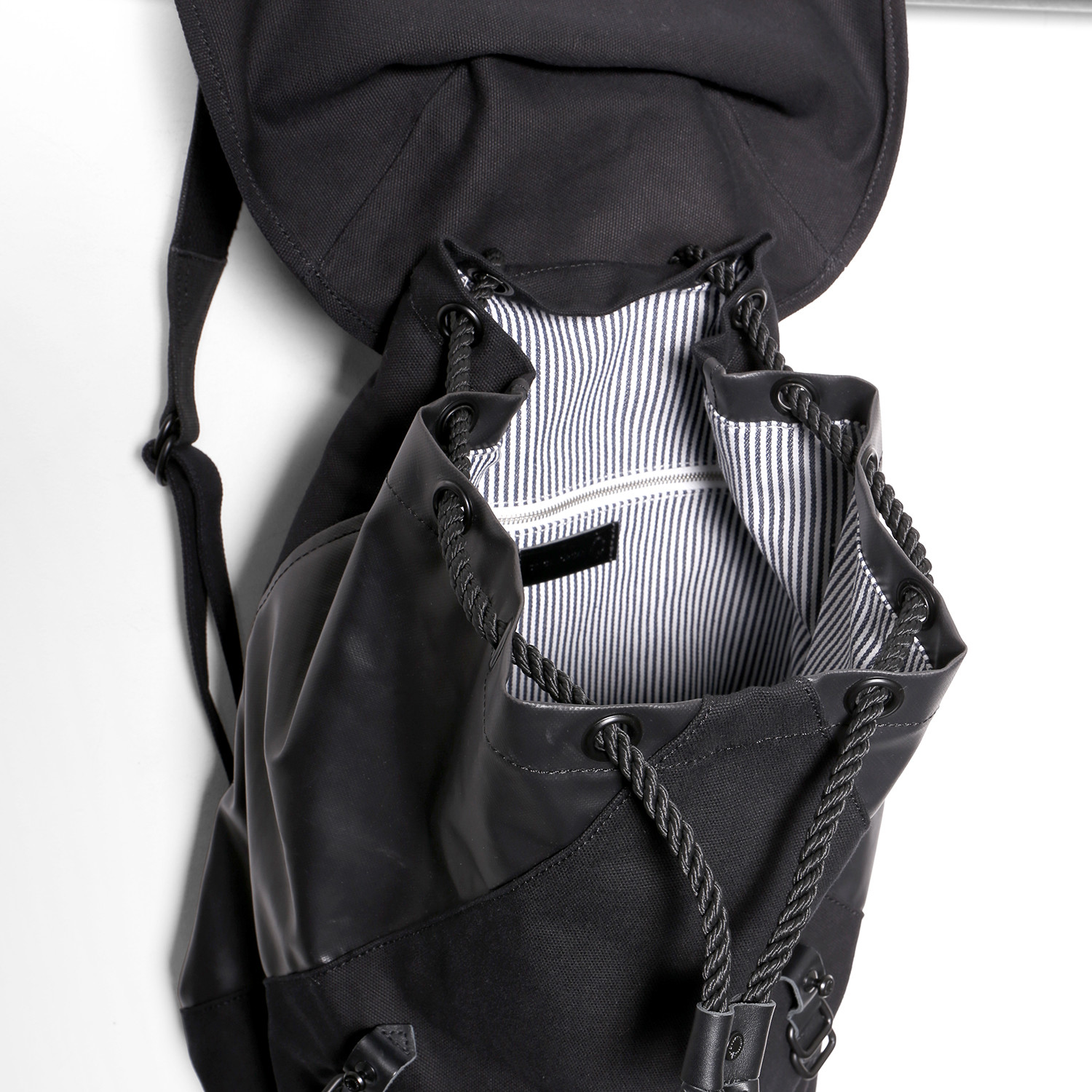 18oz cotton flap rucksack. Waterproof lining underneath flap. Full grain leather flap adjusters