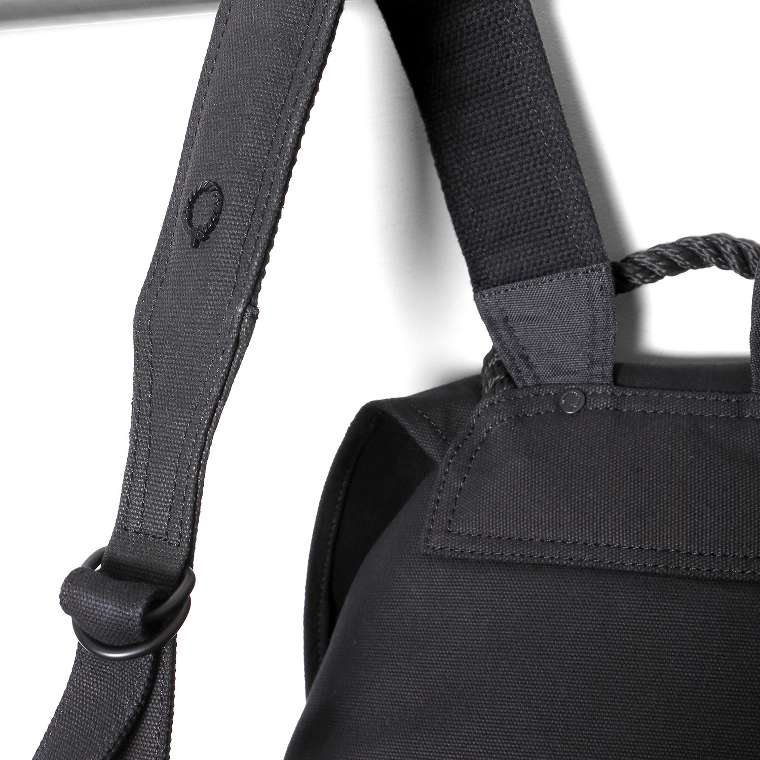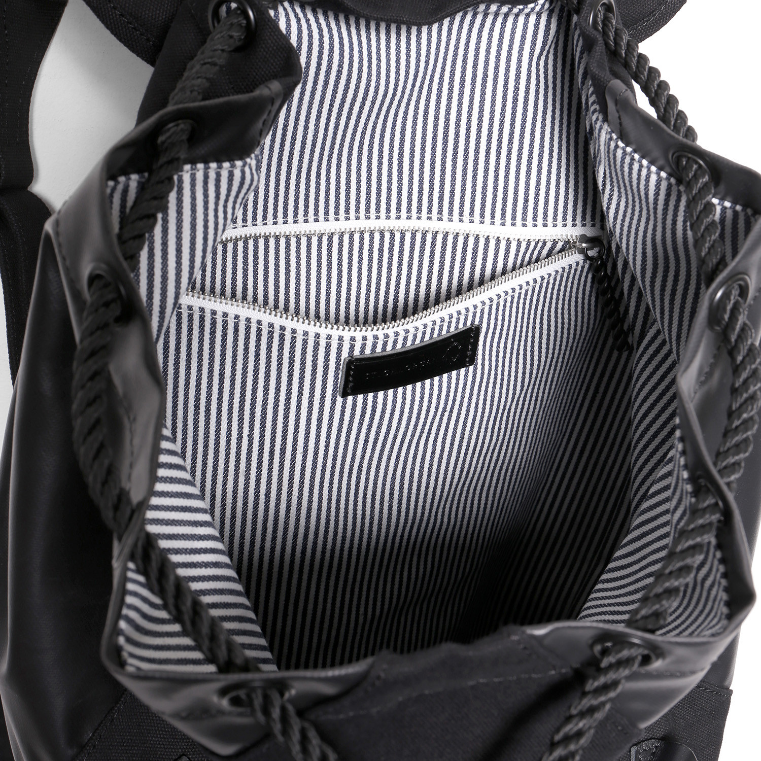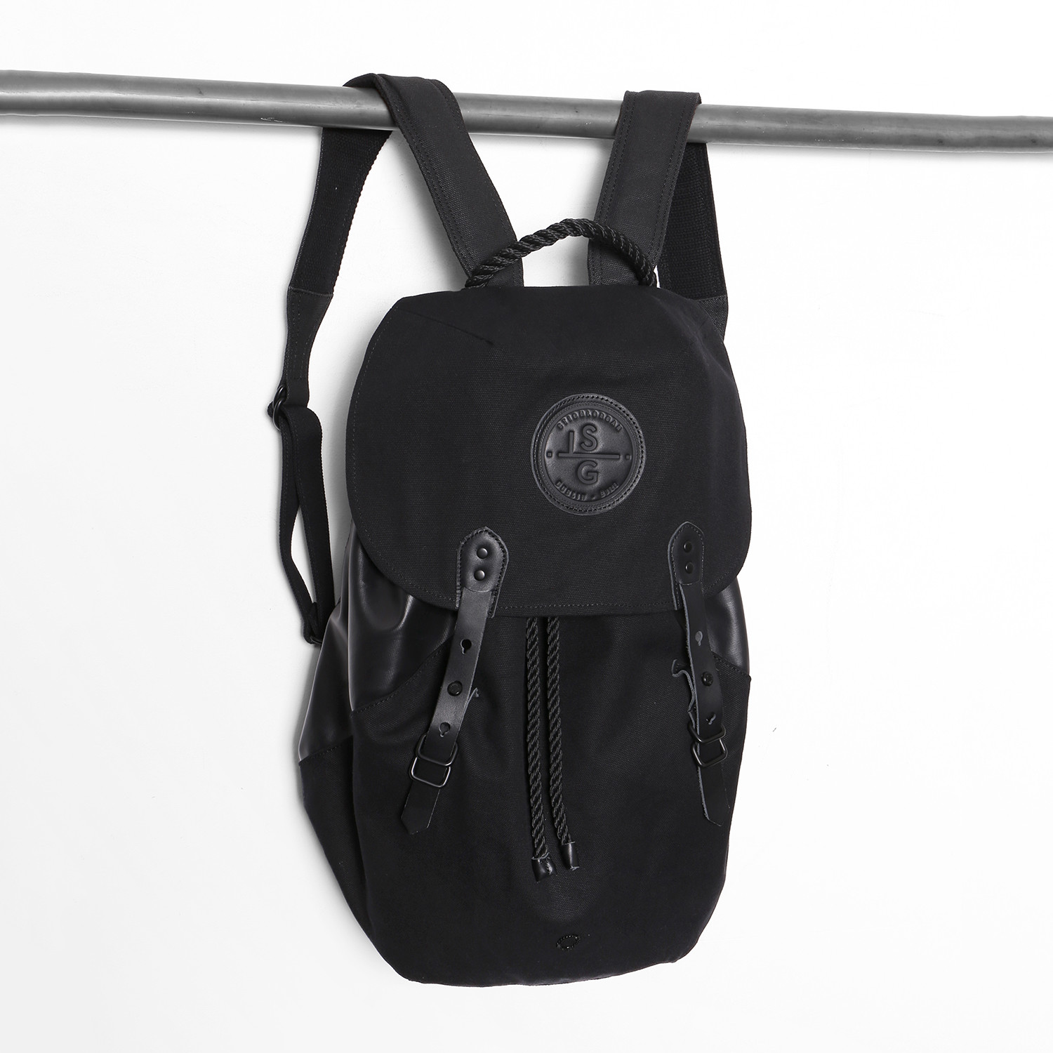 18oz cotton flap rucksack. Waterproof lining underneath flap. Full grain leather flap adjusters