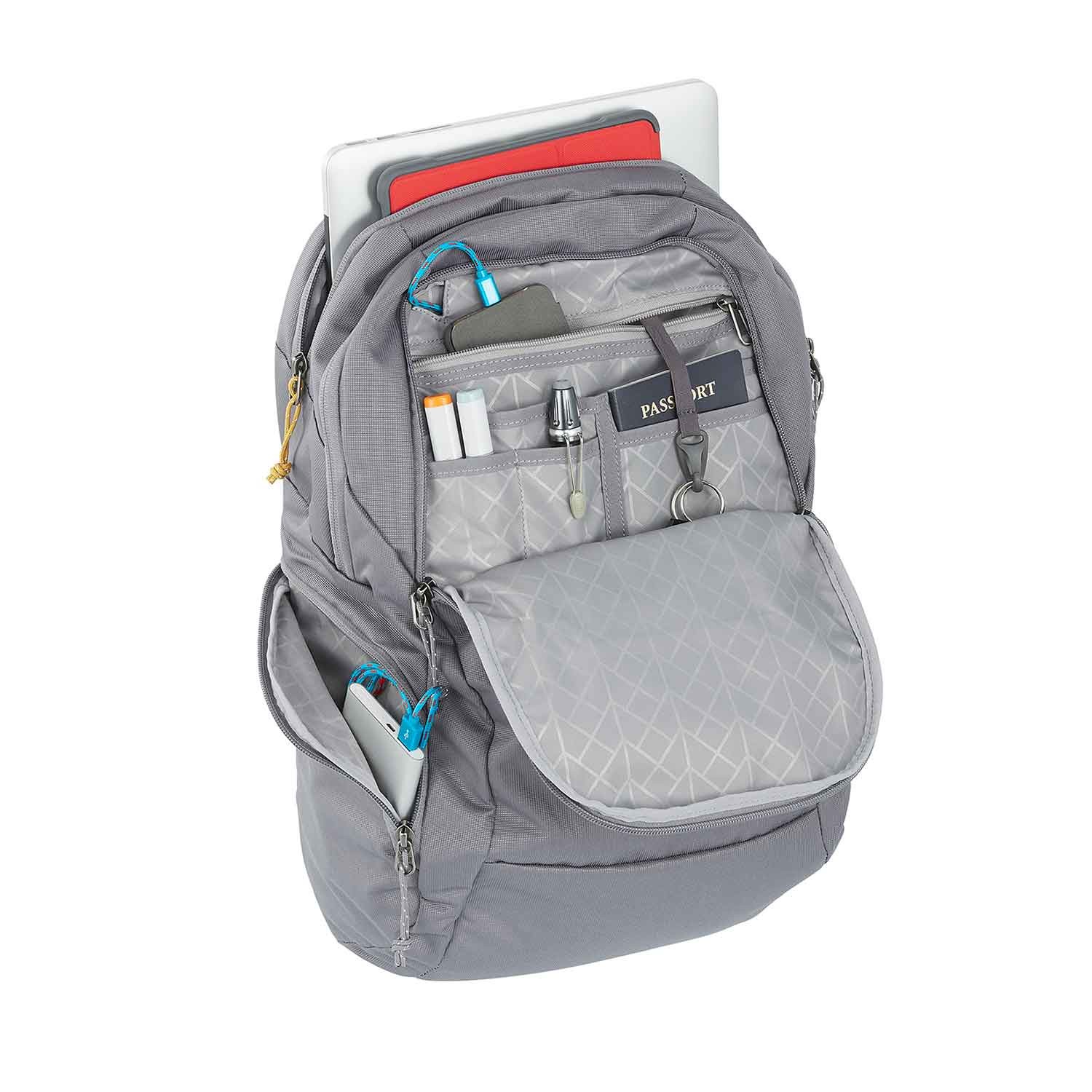 The Haven features a CableReady™ interior, which is STM's proprietary cable routing system with purpose-built pockets, ports between sections, and integrated cable management to store, access, and charge your devices while keeping your bag organized. You will also find an internal and dedicated Sling Tech section which keeps laptops up to 15" and a tablet suspended off the floor of the bag and wrapped in high density foam.